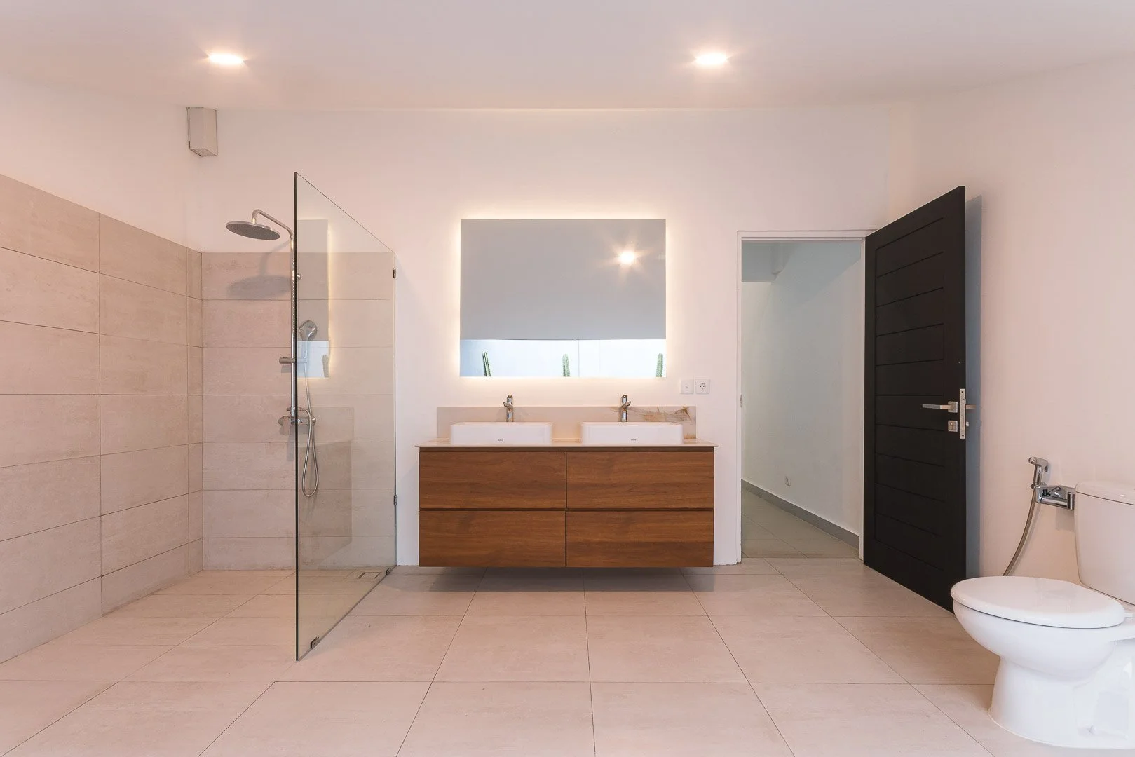 The ground floor hosts two generously sized bedrooms, each with ensuite bathrooms and walk-in wardrobes and internal doors to the main living area. Each bedroom spans 47 m², ensuring ample space and comfort.
