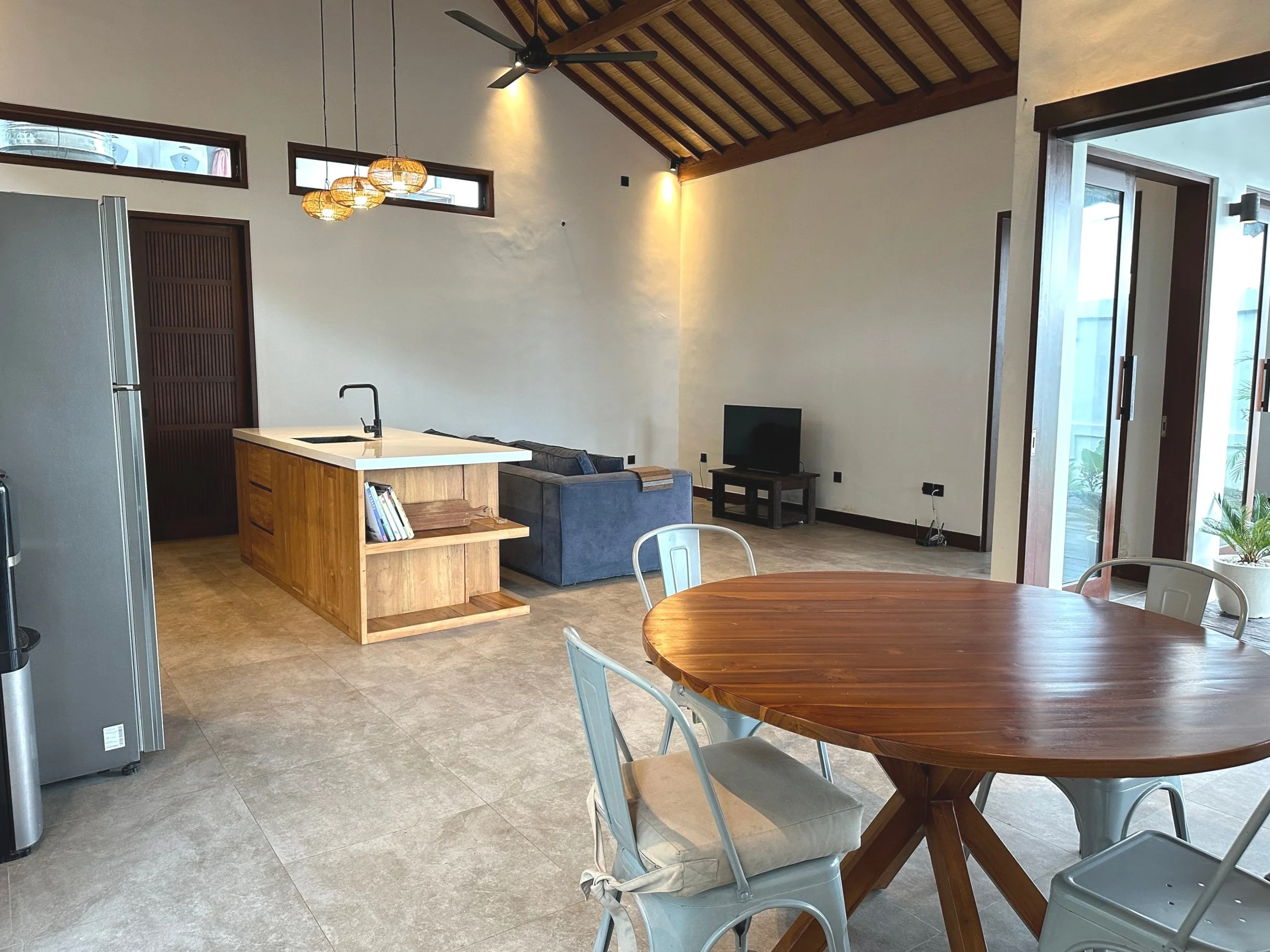 Built in 2023 with family living in mind, Rumah Rosie sits on 5 are of land and features off-street parking, a well-sized pool, and a charming garden area. The main villa includes a spacious master bedroom with an ensuite bathroom, complete with a bathtub, and a generous walk-in wardrobe. An internal corridor connects the master suite to the open-plan kitchen, dining, and living area. The second bedroom is conveniently located off the living room, making it perfect for families with young children who prefer to stay under one roof. A large laundry and storage room is situated off the kitchen, adding to the villa’s practicality.