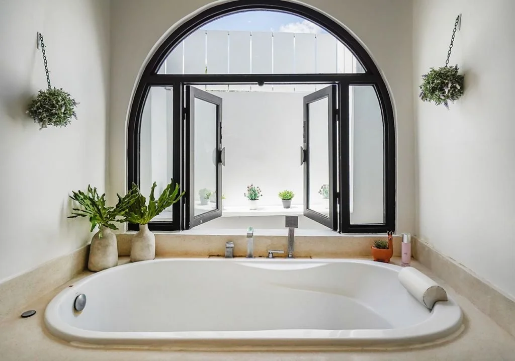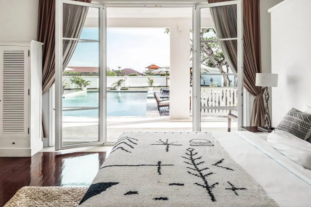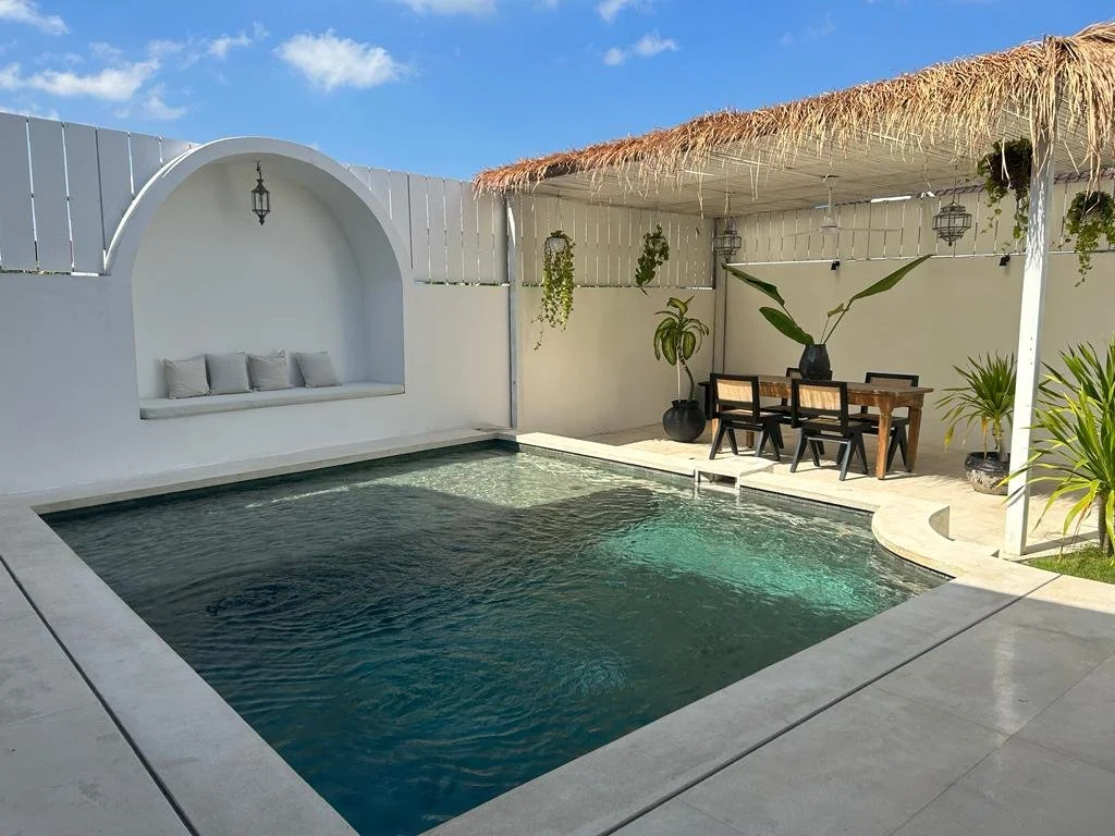 All three bedrooms are generous doubles with en suite bathrooms (one with a bath), the living room doors open out onto the square pool and it’s beautifully white courtyard with rounded alcoves and lawned area dotted with tropical palms. There is a dining table under the shaded pergola that seats six. This has a California vibe, with Tulum accents and Bali fringes…