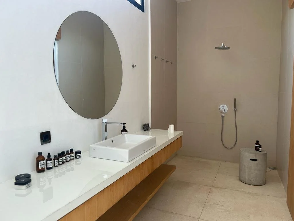 When you move to Bali your home is your sanctuary… and this villa is exactly that. It’s surprisingly spacious, with great volumes throughout, the light colour palette chosen makes the space fresh accentuated by beautiful wooden joinery in the kitchen, a mirrored wall in the sitting room bouncing the light around and lovely low, comfortable modern sofas.