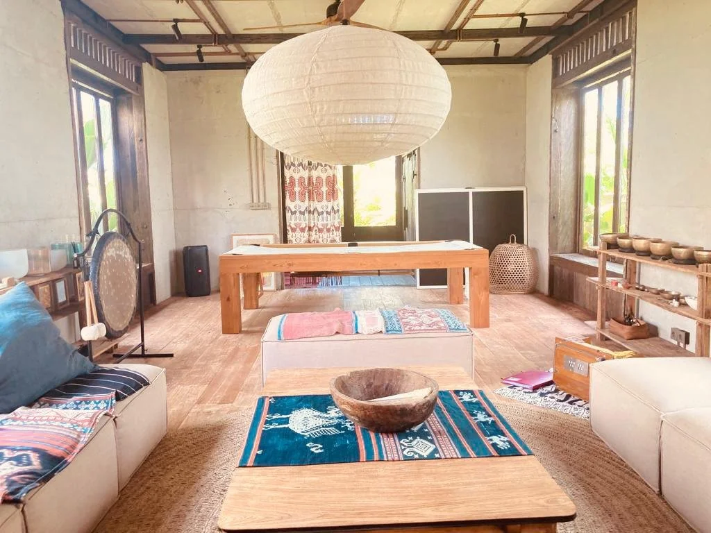This fabulous tropical villa was built by its owners as their own home, incorporating all the intricacies required, yet with the romantic island feel of raw and natural materials chosen throughout. Neutral furniture adorn the deep dark wooden walls, interspersed with floor to ceiling windows with light wood floors making this light and bright also thanks to the natural fabrics mixed with terracotta pots and greenery throughout.