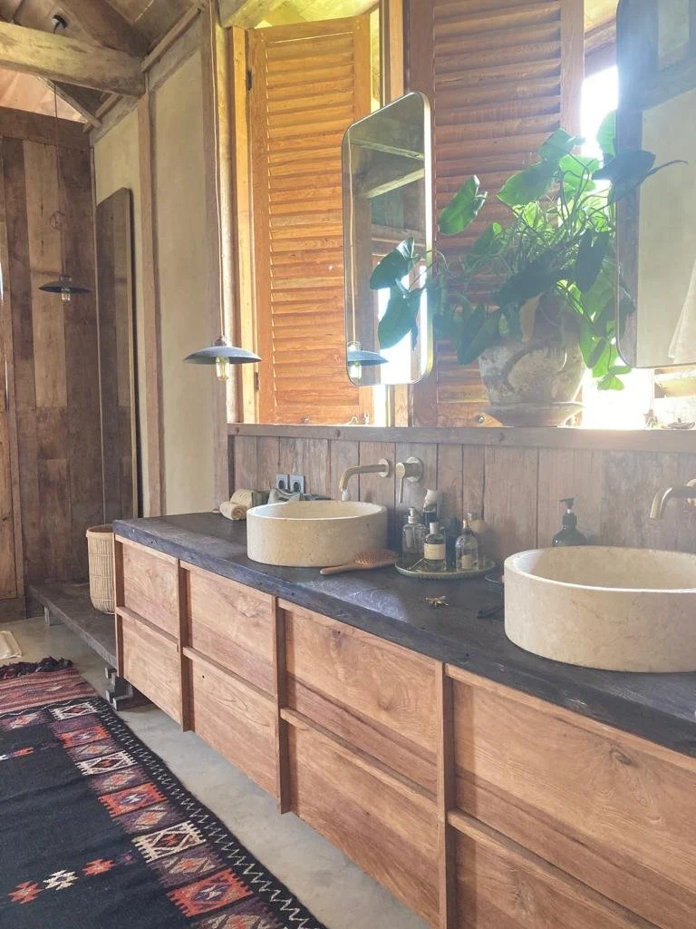 The master bedroom’s king size bed is a design feature in itself, its wooden frame holding a light piece of cotton as a light canopy, its en-suite bathroom with Moroccan rugs, double sinks and low hanging naked light fittings.