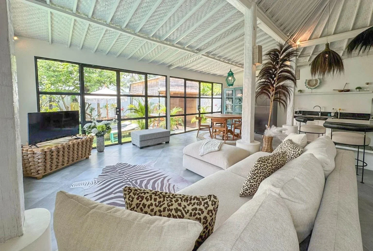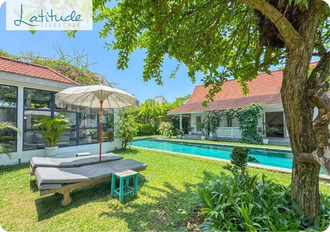 Two large ensuite double bedrooms with an office overlooking the green fields behind. The sitting room is airconned with an open plan kitchen and dining area inside and an outdoor table for long lunches by the pool. Light bright and charming on a quiet road with parking just minutes from pereranan beach situated on Tiying Tutul.