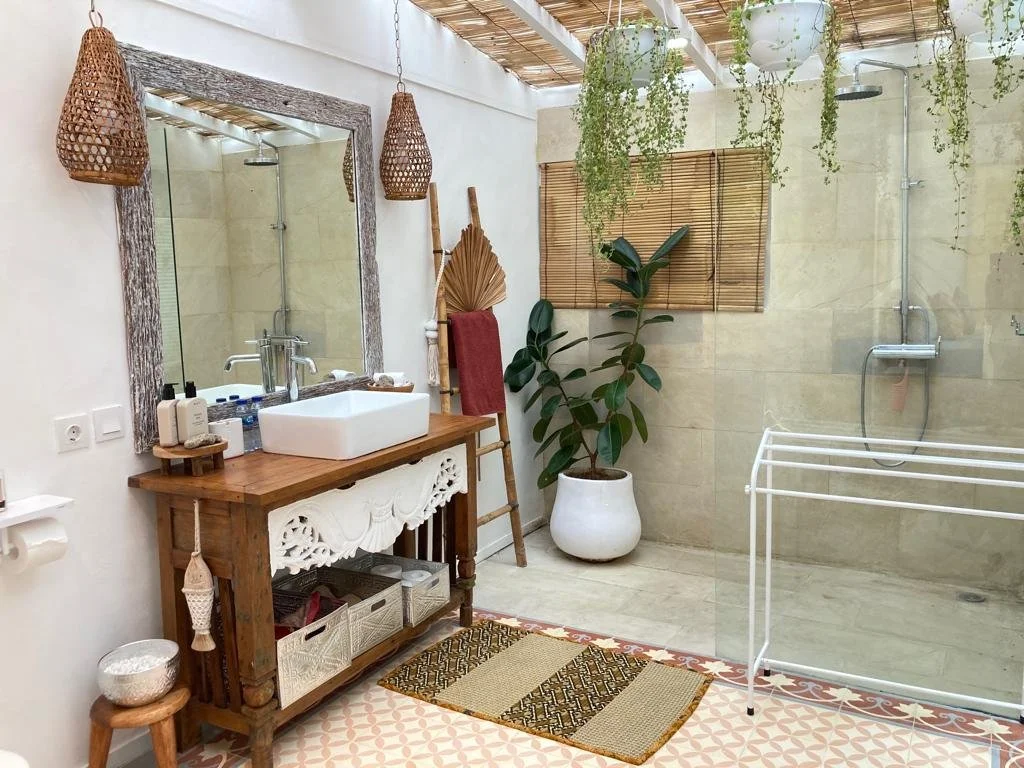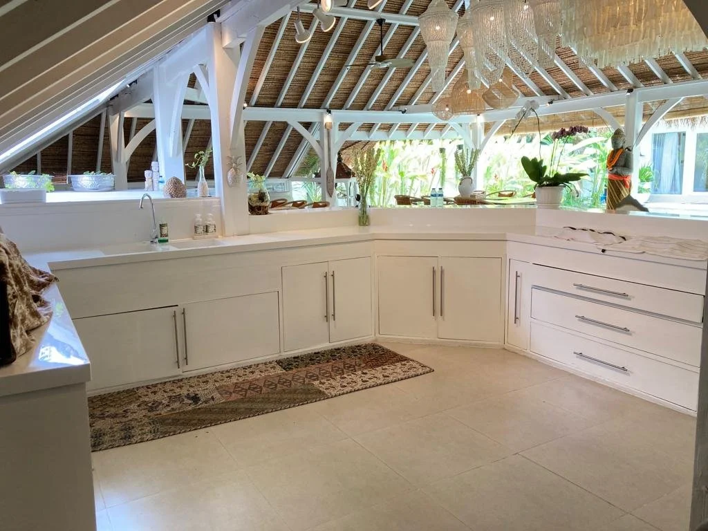 This is a mega 3 bedroom villa that has a fourth room currently set up as an office but could be a further fourth bedroom. The rooms are spacious, the sitting room has an open plan well appointed kitchen and a t-shaped pool with ample lawned garden. The villa feels spacious and comfortable, with inviting design aspects adding interest throughout, lovely light colours chosen for bed spreads and art work, green plant pots filling corners and hanging from ceilings. Vaulted ceilings and glass doors allowing for light and spacious volumes with neutral materials, teak furniture, rattan light fittings, large stone basins and lovely large paintings all adding intricate tropical Balinese touches.