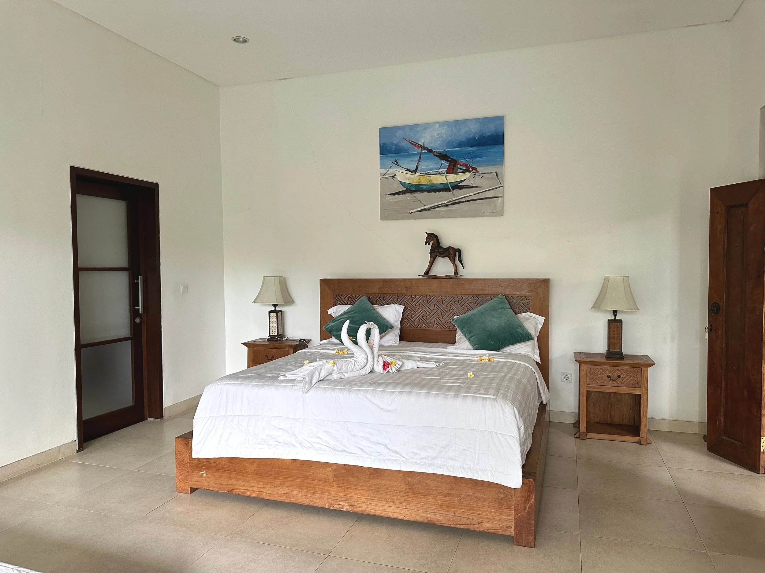 Escape to tranquility at this secluded property, nestled at the end of a quiet lane and secured behind a private gate. Ample parking is readily available, ensuring convenient access for you and your guests. The heart of this idyllic retreat is a charming wooden joglo, a traditional Javanese house exuding warmth and character. The Joglo itself boasts a thoughtfully designed interior, seamlessly blending comfort and functionality. A spacious open-plan living, dining, and kitchen area creates a welcoming atmosphere, perfect for both relaxed evenings and entertaining. Two generously sized bedrooms, located to the left of the main living space, offer ample sleeping quarters. Upstairs, you'll discover an additional level of privacy with one ensuite bedroom, complete with its own bathroom, and another bedroom, ideal for guests or family members.