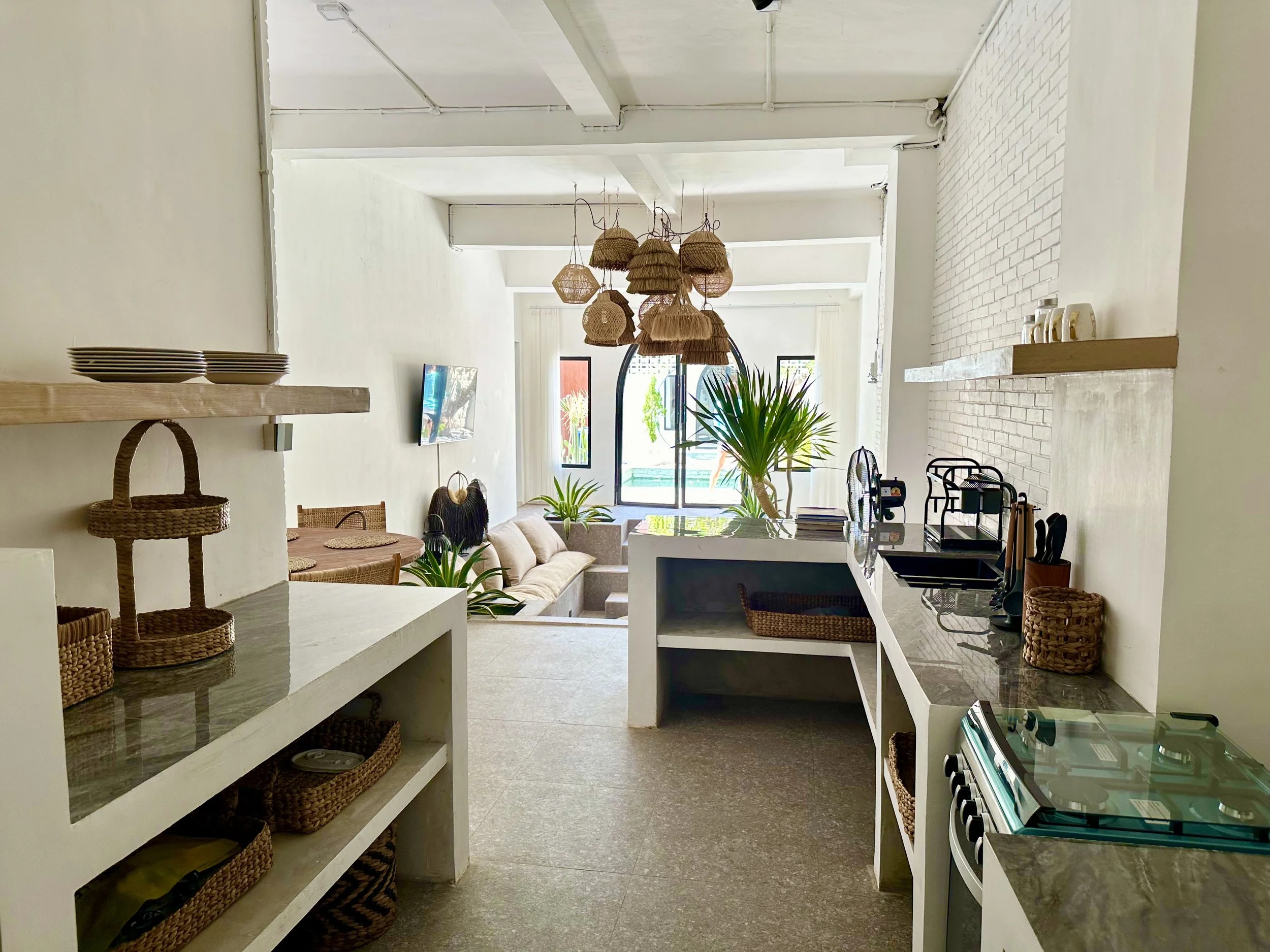 The property features a fully equipped kitchen, along with a staff kitchen equipped with a washing machine, a dining area, and a bar area. The sunken sofa living area adds a unique touch to the property's entrance.