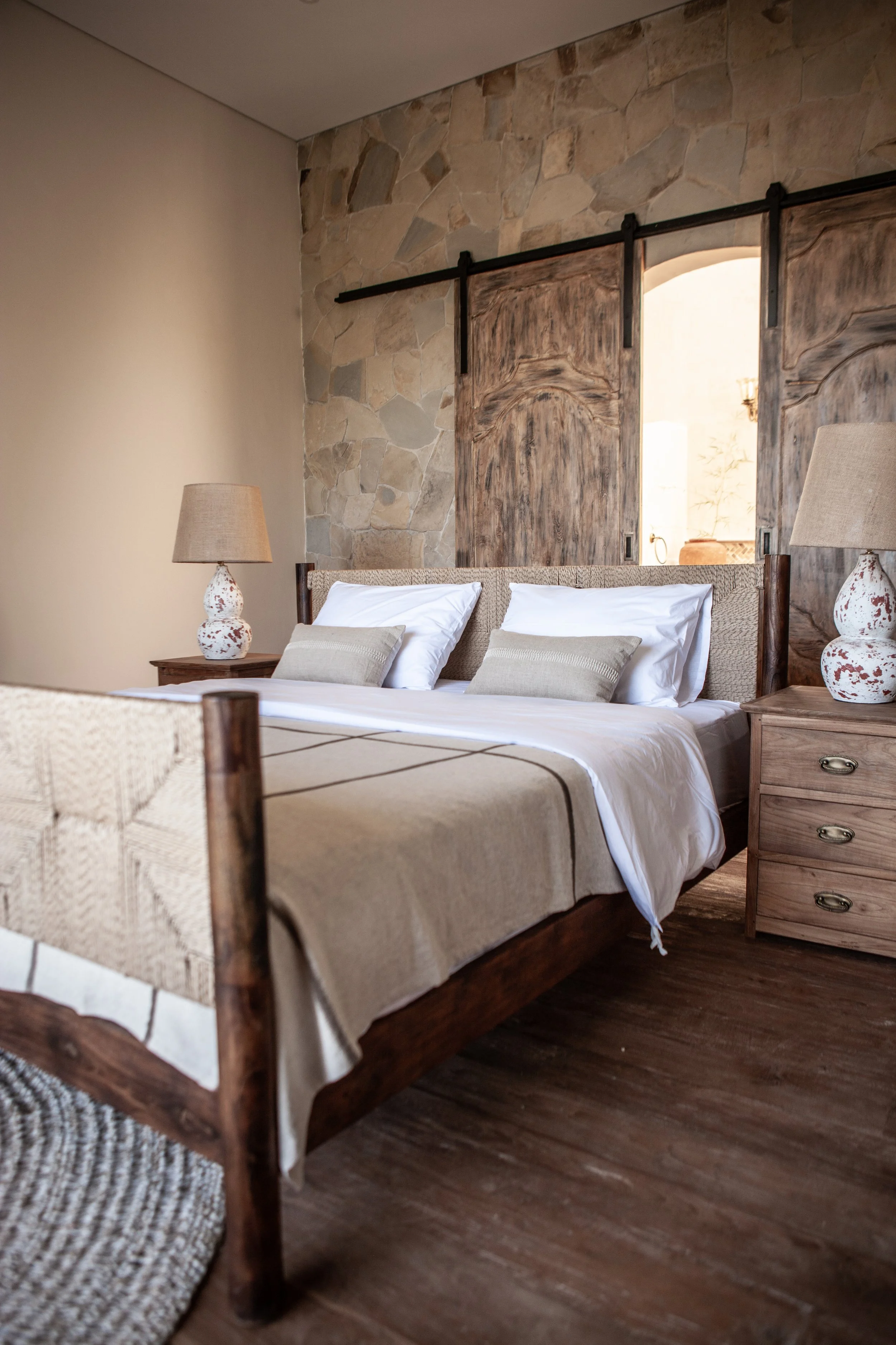 The taupe and white colour palette compliments the sanded wooden floors for the villa to feel like a charming beach house.