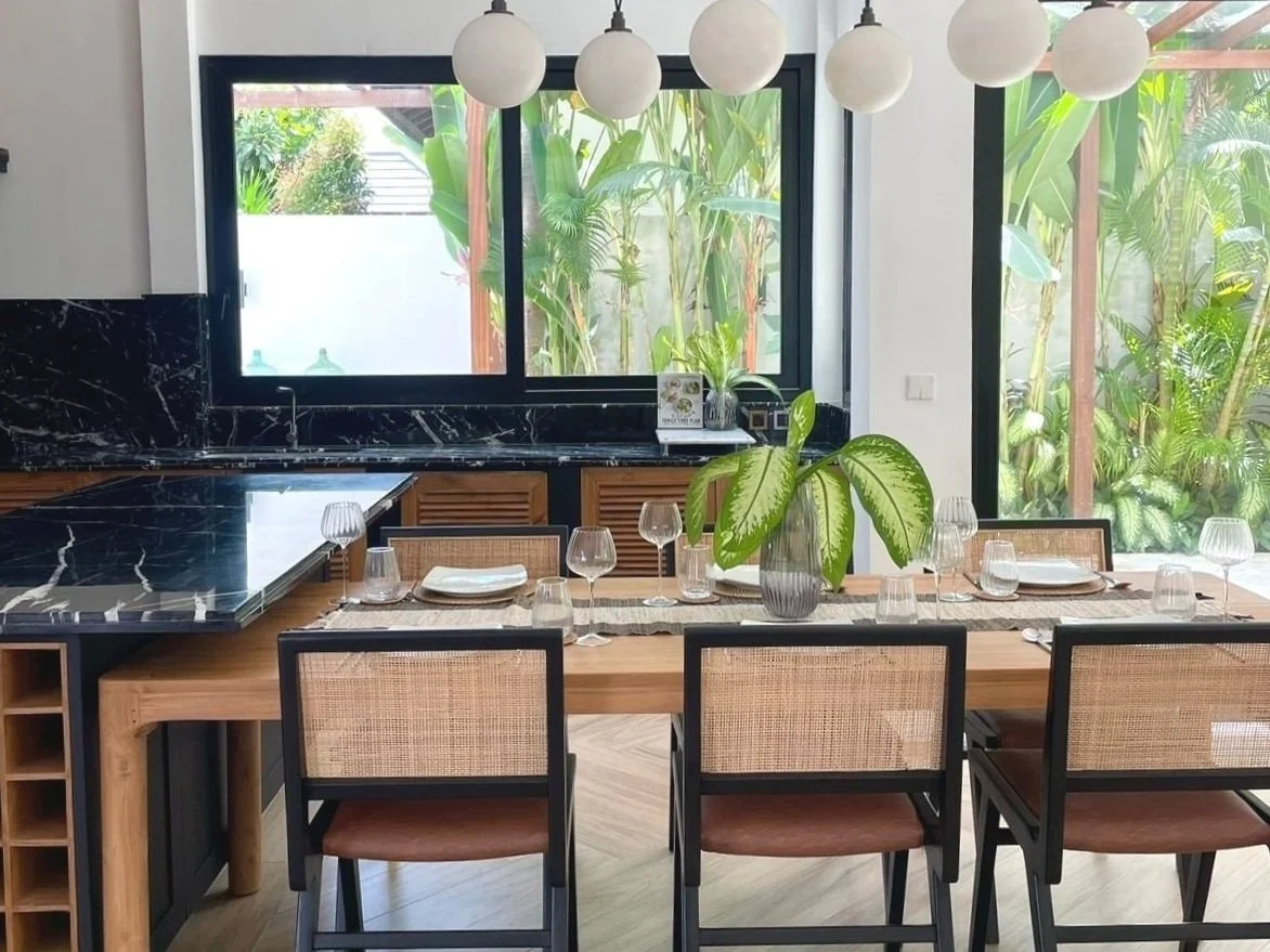 Step inside through majestic doors to discover a contemporary kitchen featuring a colour palette of black, white and woody feels throughout with a marble-topped kitchen island, perfectly positioned to overlook the outdoor dining space. The well proportioned light and airy sitting room is framed with greenery from all aspects and sliding doors open to the lawn and pool area and a separate guest house and terrace.