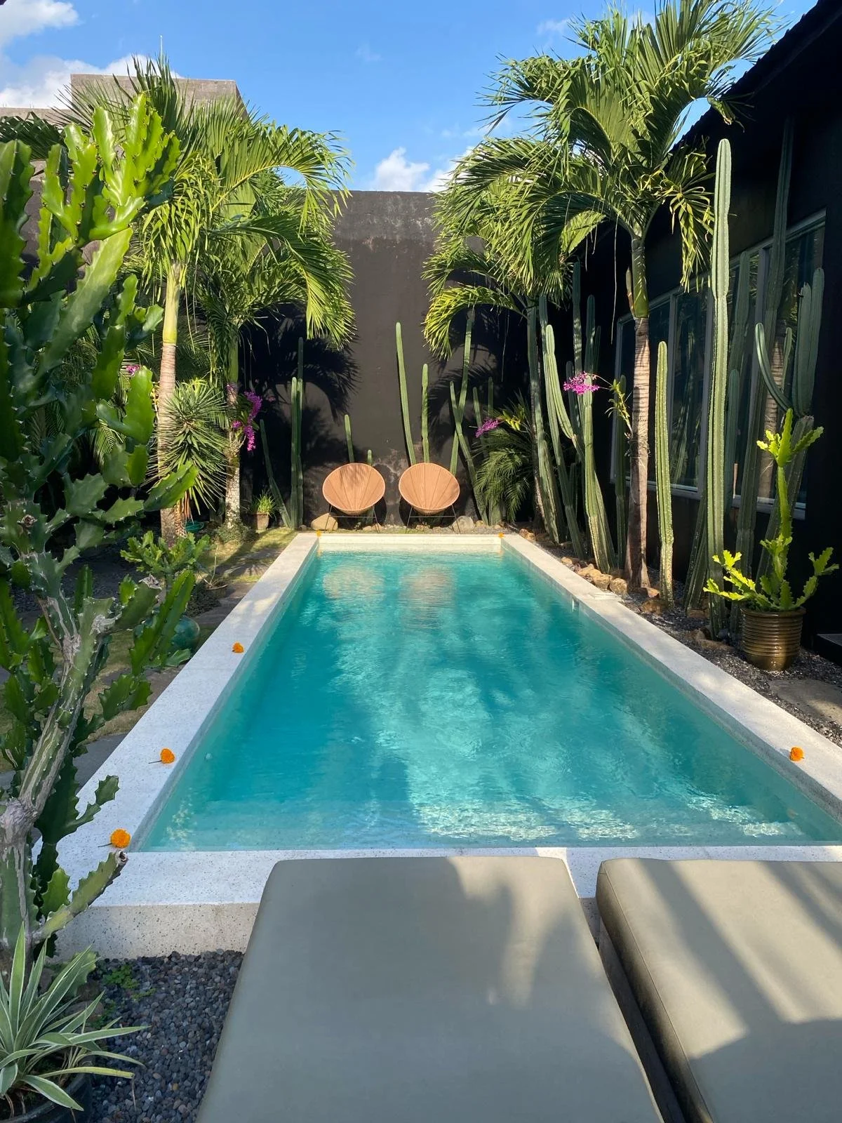 The studio house offers a cozy sitting area, a sleeping loft, and another en-suite bathroom. All living areas are air-conditioned for your comfort. Outside, enjoy the tropical garden and a refreshing 9x3m private pool. With king and queen-size beds in the bedrooms,