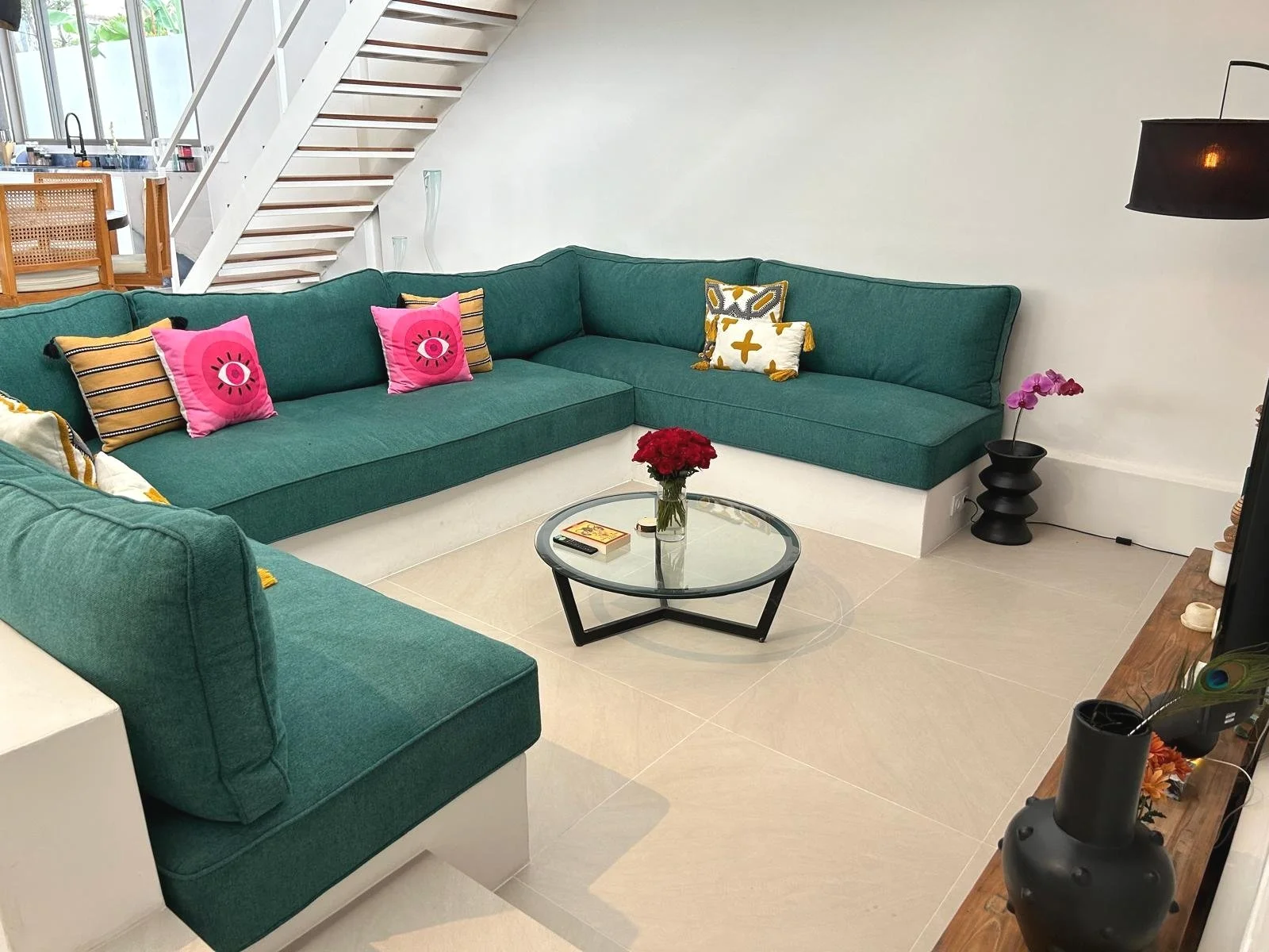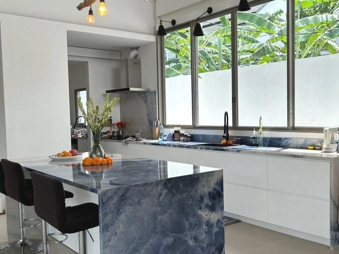 The spacious, open-plan living area includes high ceilings, a modern kitchen, and an abundance of natural light. Every room is air-conditioned, and the villa is equipped with a 3-stage water filtration system, washer/dryer, and Netflix-ready setup.