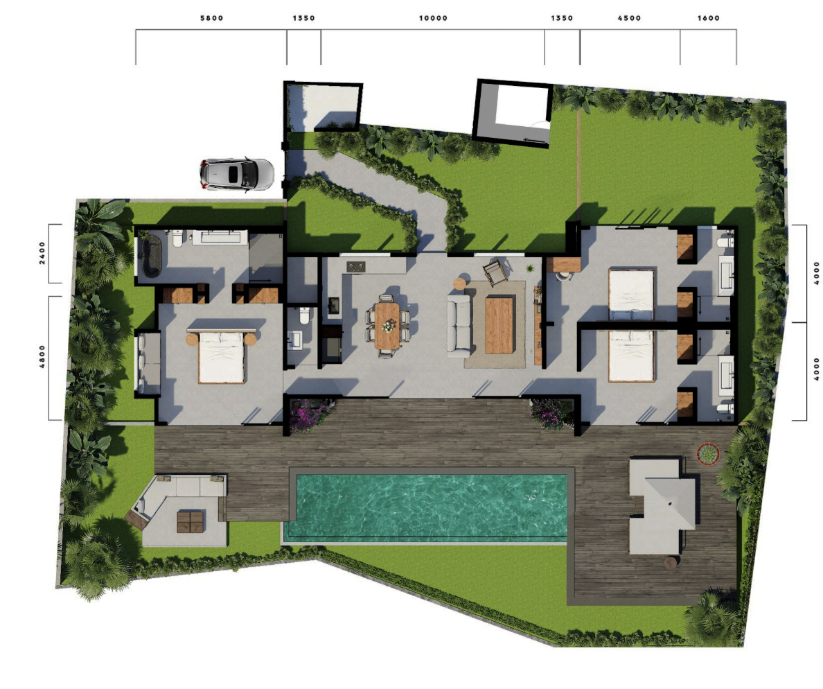 Part of a private 3-villa estate at the end of a quiet gang with open rice field views, this home features three spacious bedrooms with en-suite bathrooms, an open-plan living and dining area, and a fully equipped modern kitchen. Outdoors, enjoy a 10-meter swimming pool, sun deck with premium composite decking, and a cozy lounge area surrounded by tropical calm.