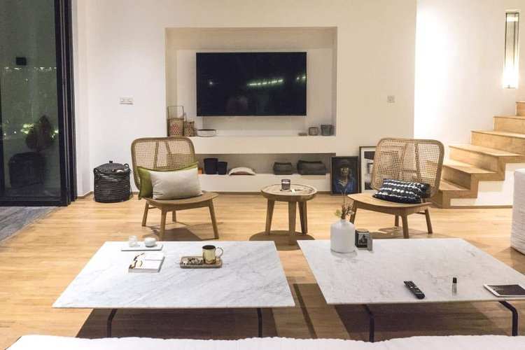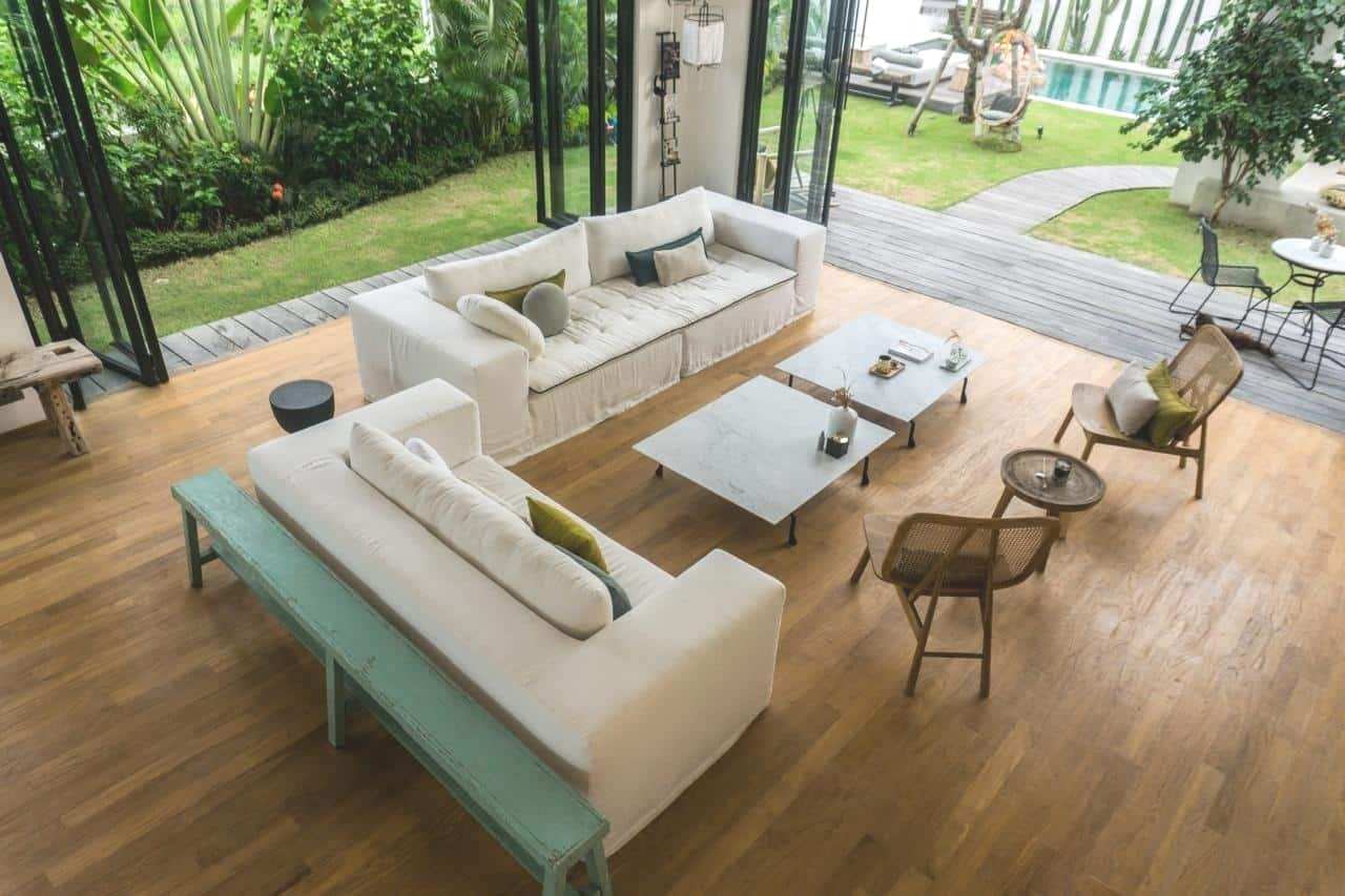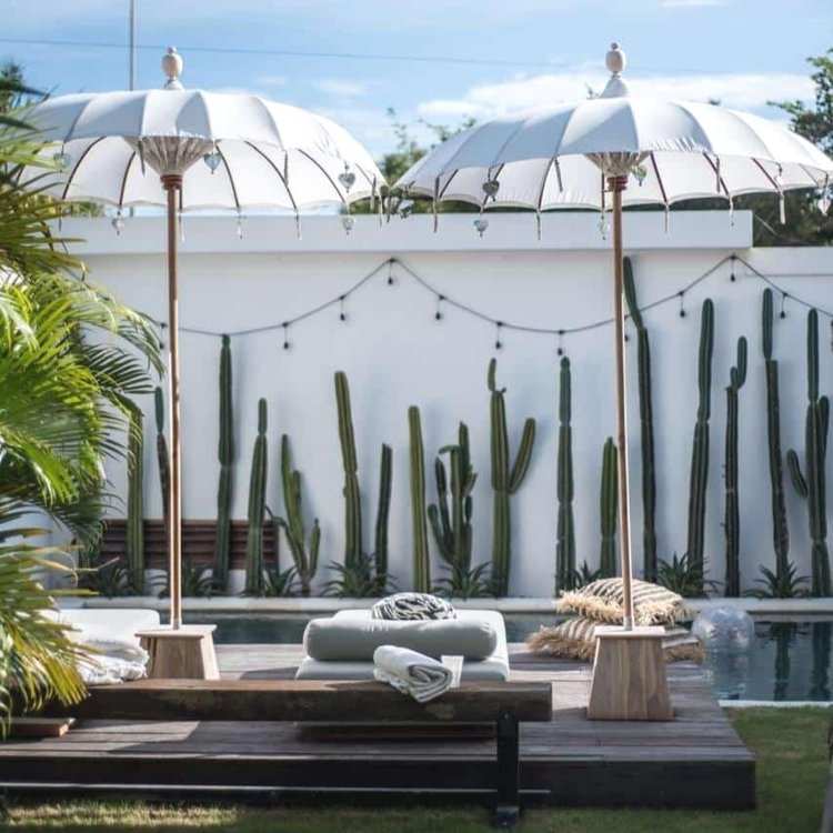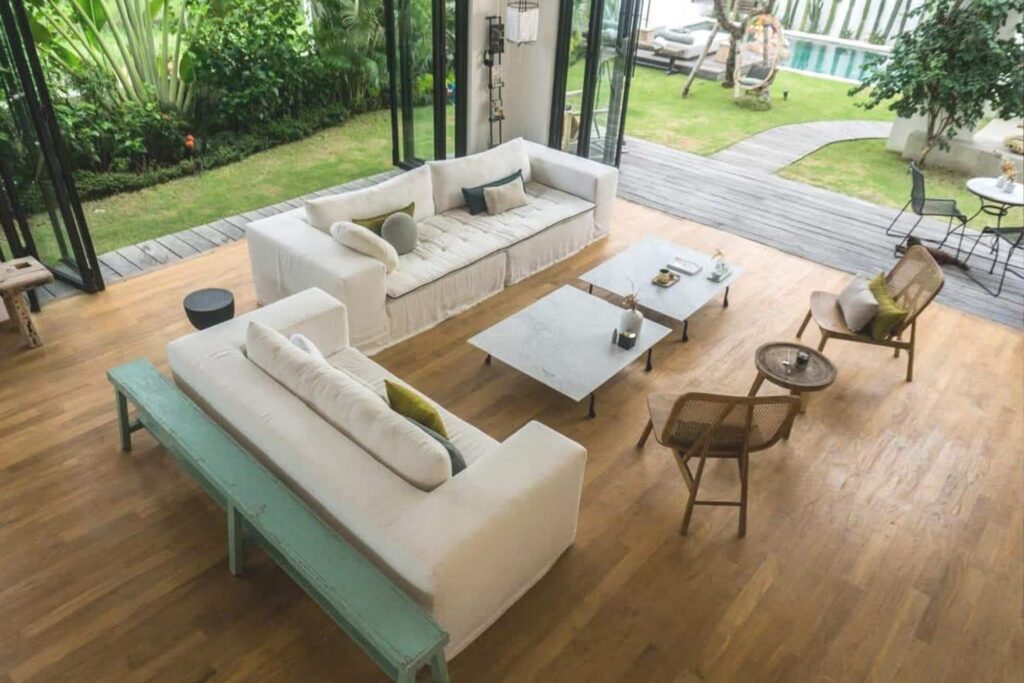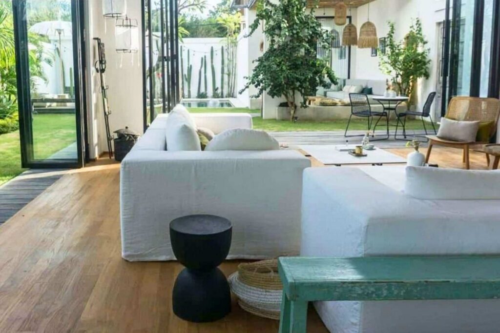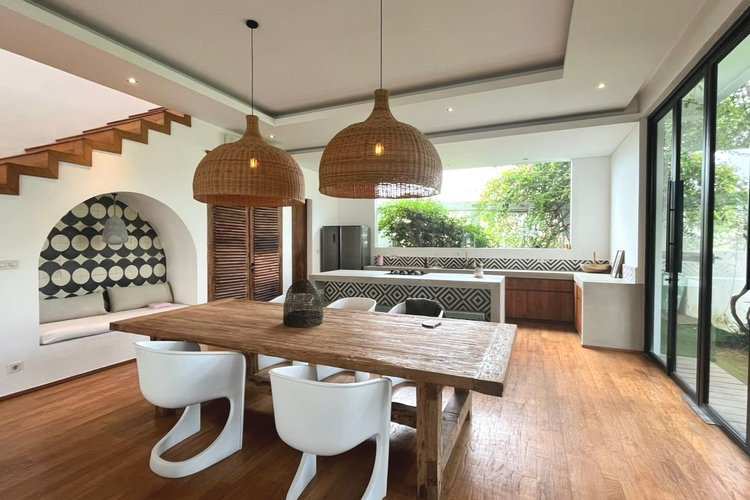On a quiet private road surrounded by rice fields just a few seconds from the beach, this large 3 double bedroom home is just perfect for a family. The villa is designed for air flow and easy living with an open plan kitchen that overllooks the sitting room with doors that open to the pool and garden. Great volumes, charming design prospects with green and floral views wherever the eye is drawn.
