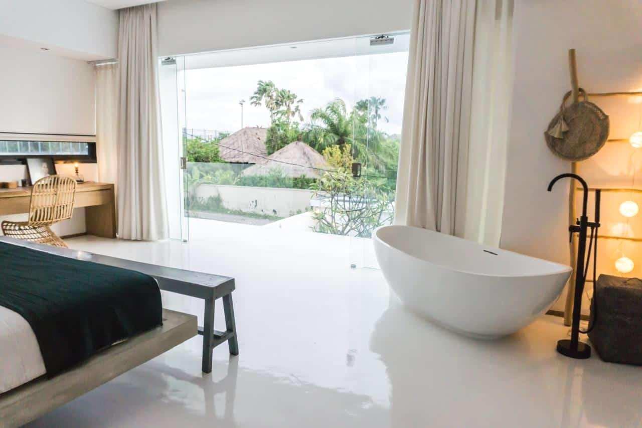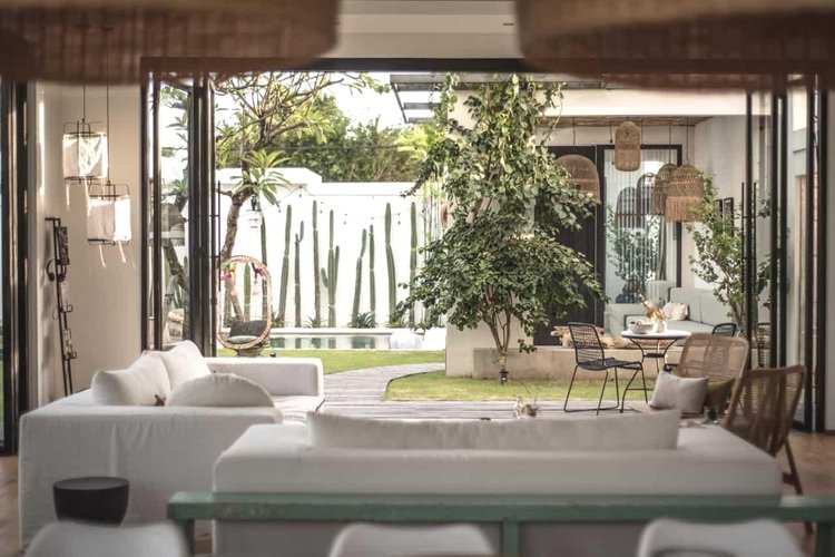 The master bedroom has a bathtub, shower and terrace overlooking pink bougainvillea, whilst the other two bedrooms connect via the bathroom. The villa layout is over two floors giving this a lovely family home feel in the tropics.