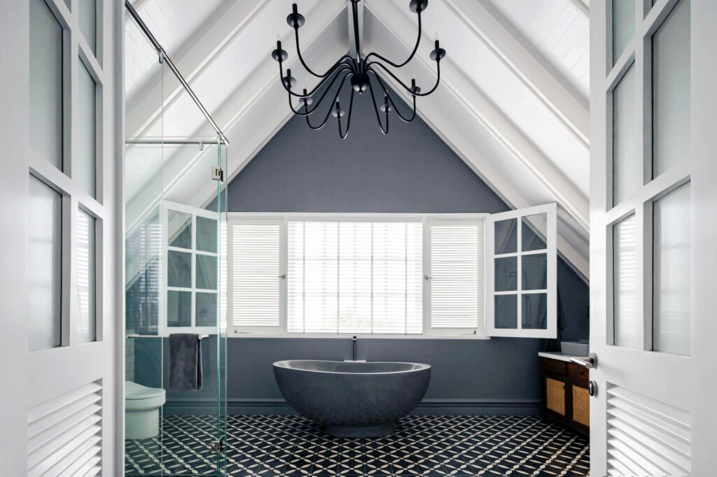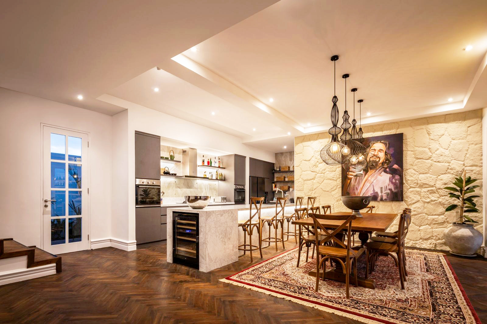 The villa offers 4/5 bedrooms, all under one roof — a layout that works beautifully for families. Three bedrooms sit together on the second floor, ideal for young children close to their parents. The ground floor hosts a fourth ensuite bedroom, while a fifth room works equally well as a bedroom or home office. A generous TV room adds to the sense of space, and the enclosed dining area flows naturally into a fully equipped chef’s kitchen complete with island, pantry, and dishwasher — the kind of kitchen you actually want to cook in.