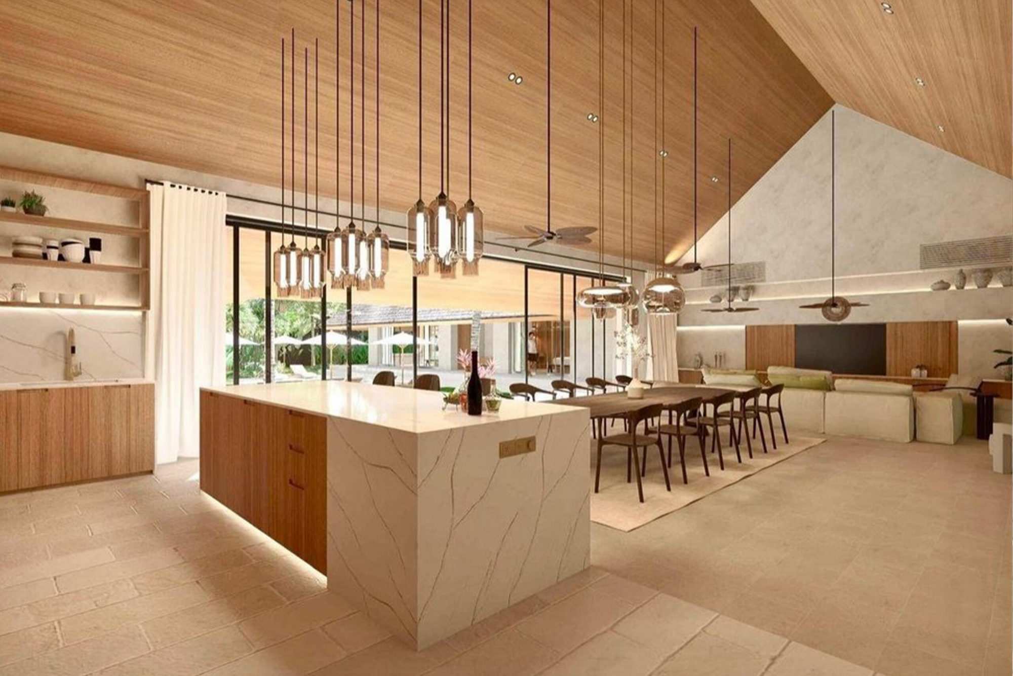 The villa’s layout offers stunning views from each room, with a spacious open-plan living and dining area that can be enclosed or opened to the outdoors. The fully equipped kitchen and luxurious bedrooms, each with en-suite bathrooms, are designed to maximize comfort and style.