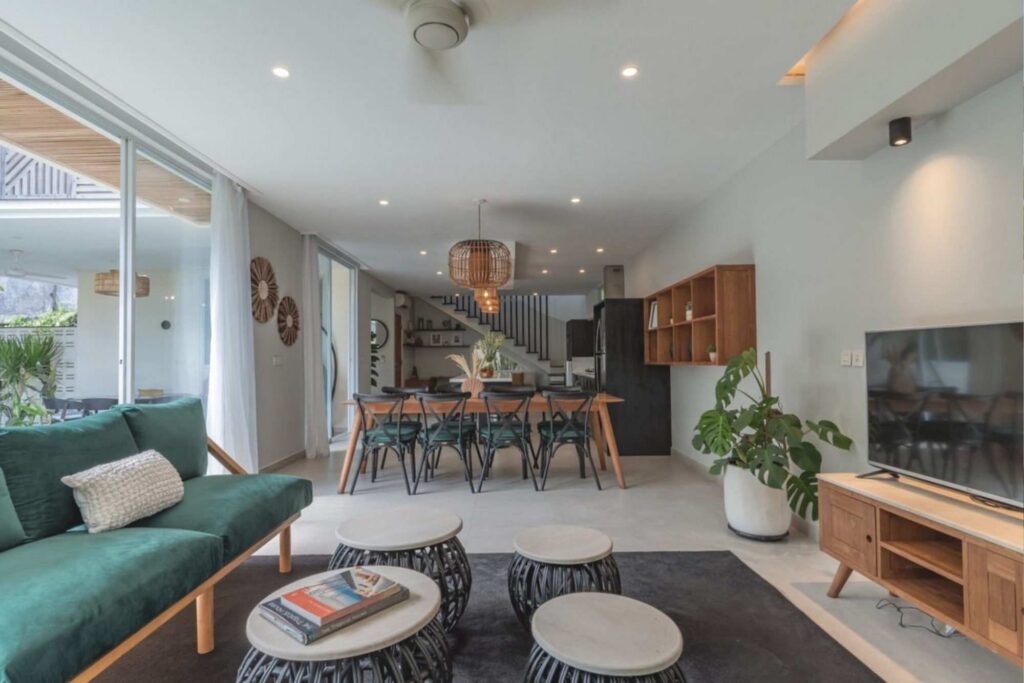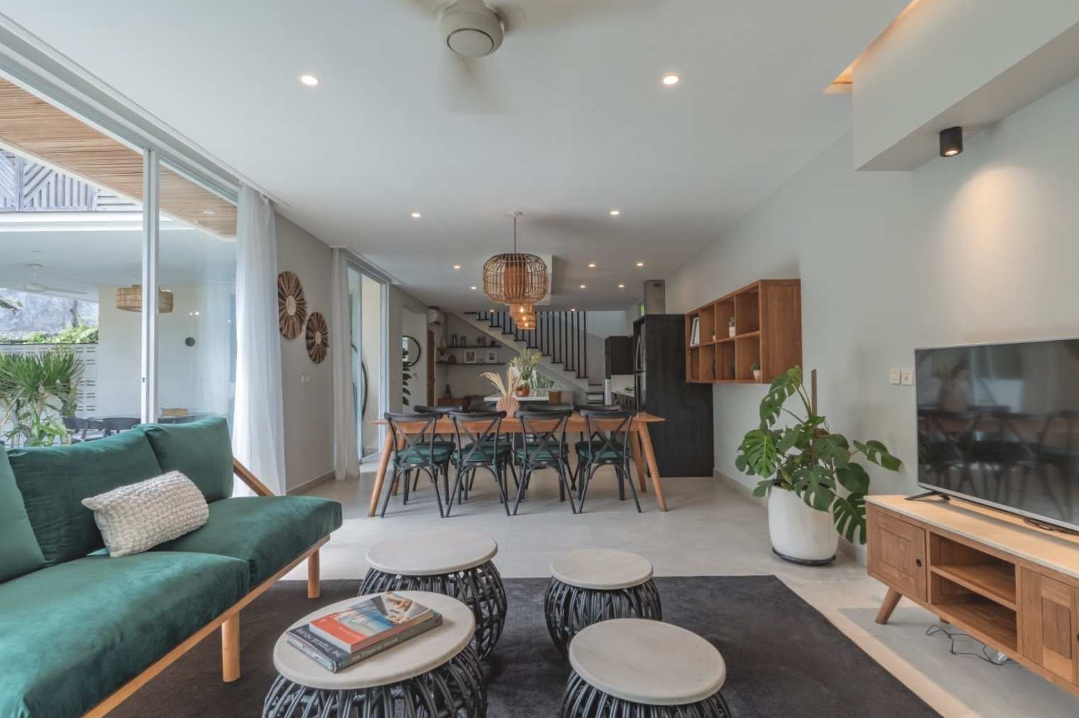The main living area offers both indoor and outdoor dining spaces, a modern kitchen, and a comfortable sofa area. Each of the three spacious bedrooms is tastefully decorated and comes with its own private bathroom.