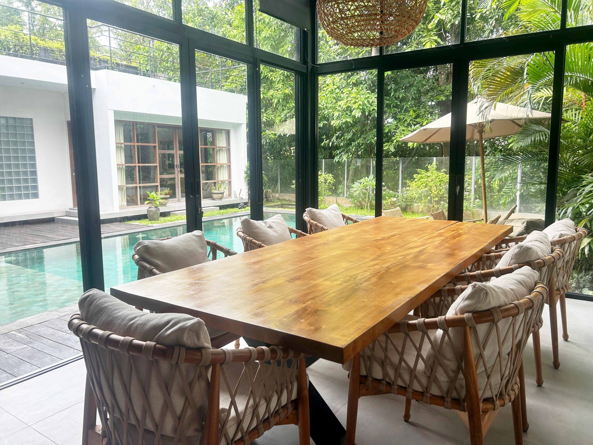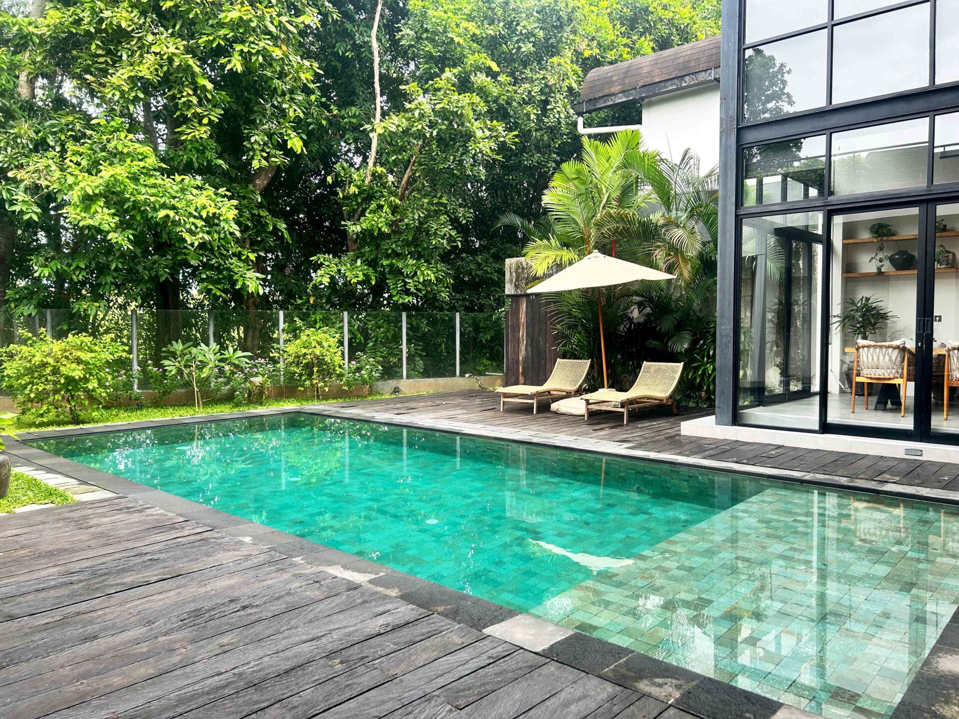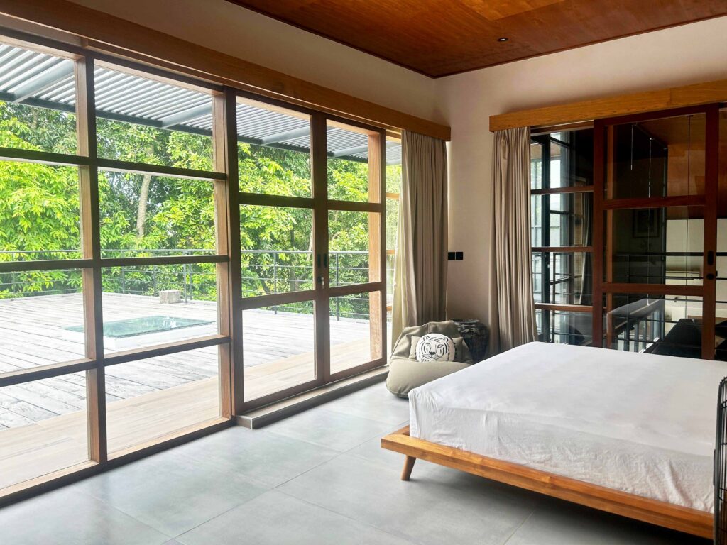 A captivating 4-bedroom villa that currently functions as a serene retreat with 3 bedrooms and an inviting TV room. Nestled amidst lush rice fields and alongside a tranquil river, this home harmonizes natural beauty with modern living. The spacious enclosed living area, adorned with high ceilings, creates an open ambiance perfect for relaxation and entertaining. Step outside to enjoy the refreshing outdoor pool, ideal for soaking up the sun.