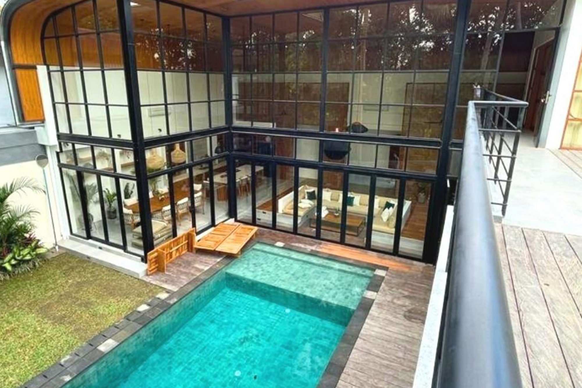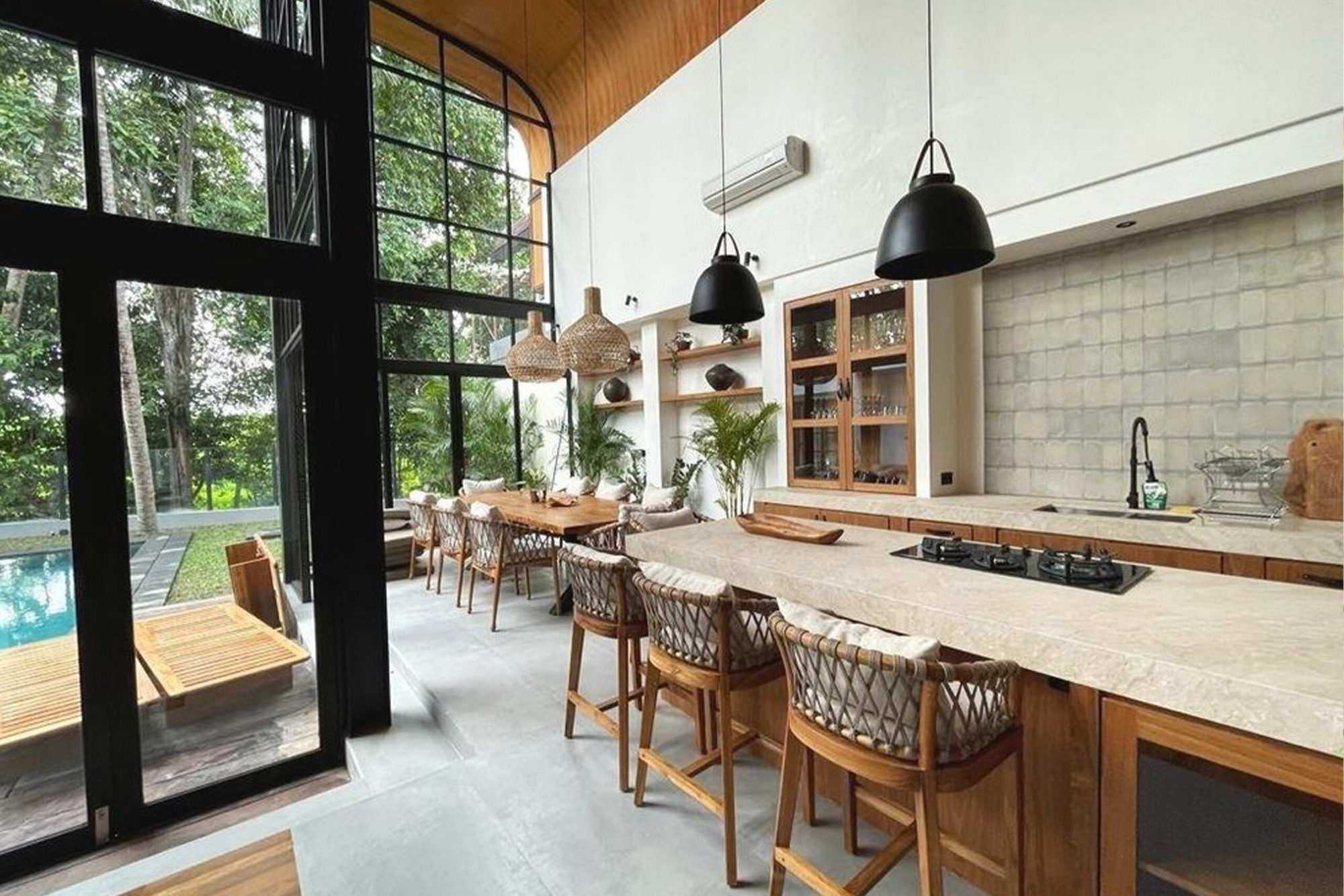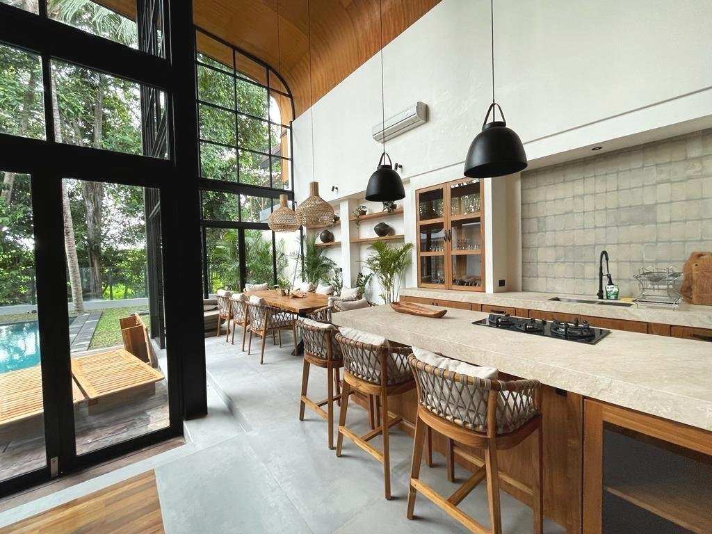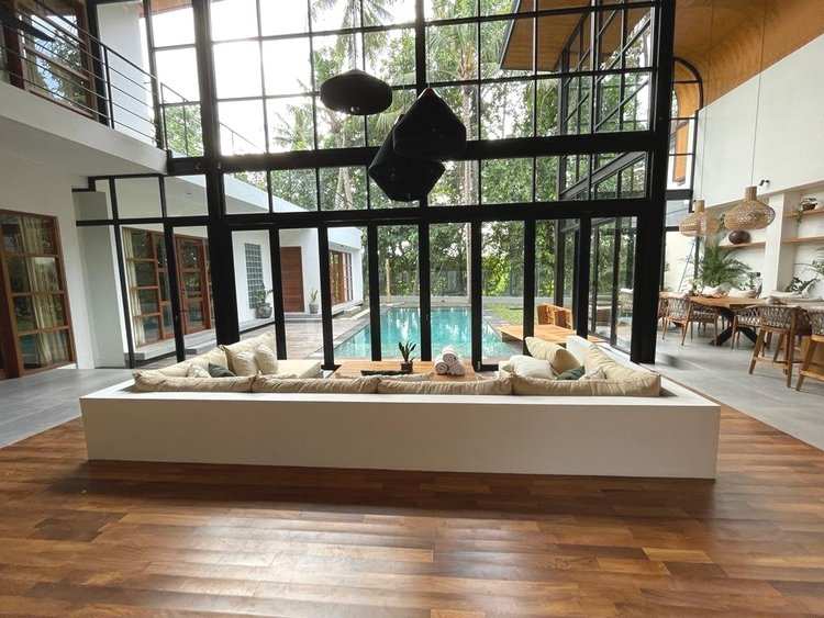 A captivating 4-bedroom villa that currently functions as a serene retreat with 3 bedrooms and an inviting TV room. Nestled amidst lush rice fields and alongside a tranquil river, this home harmonizes natural beauty with modern living. The spacious enclosed living area, adorned with high ceilings, creates an open ambiance perfect for relaxation and entertaining. Step outside to enjoy the refreshing outdoor pool, ideal for soaking up the sun.