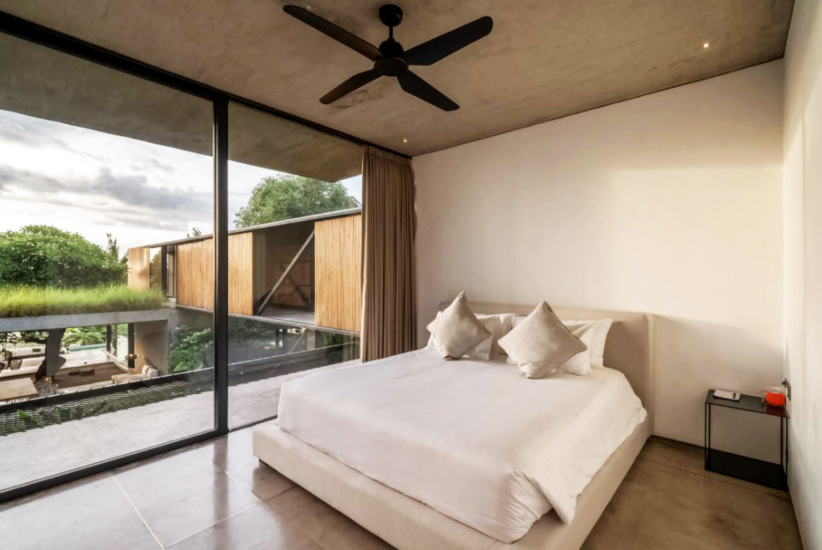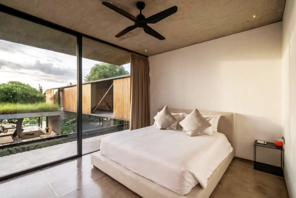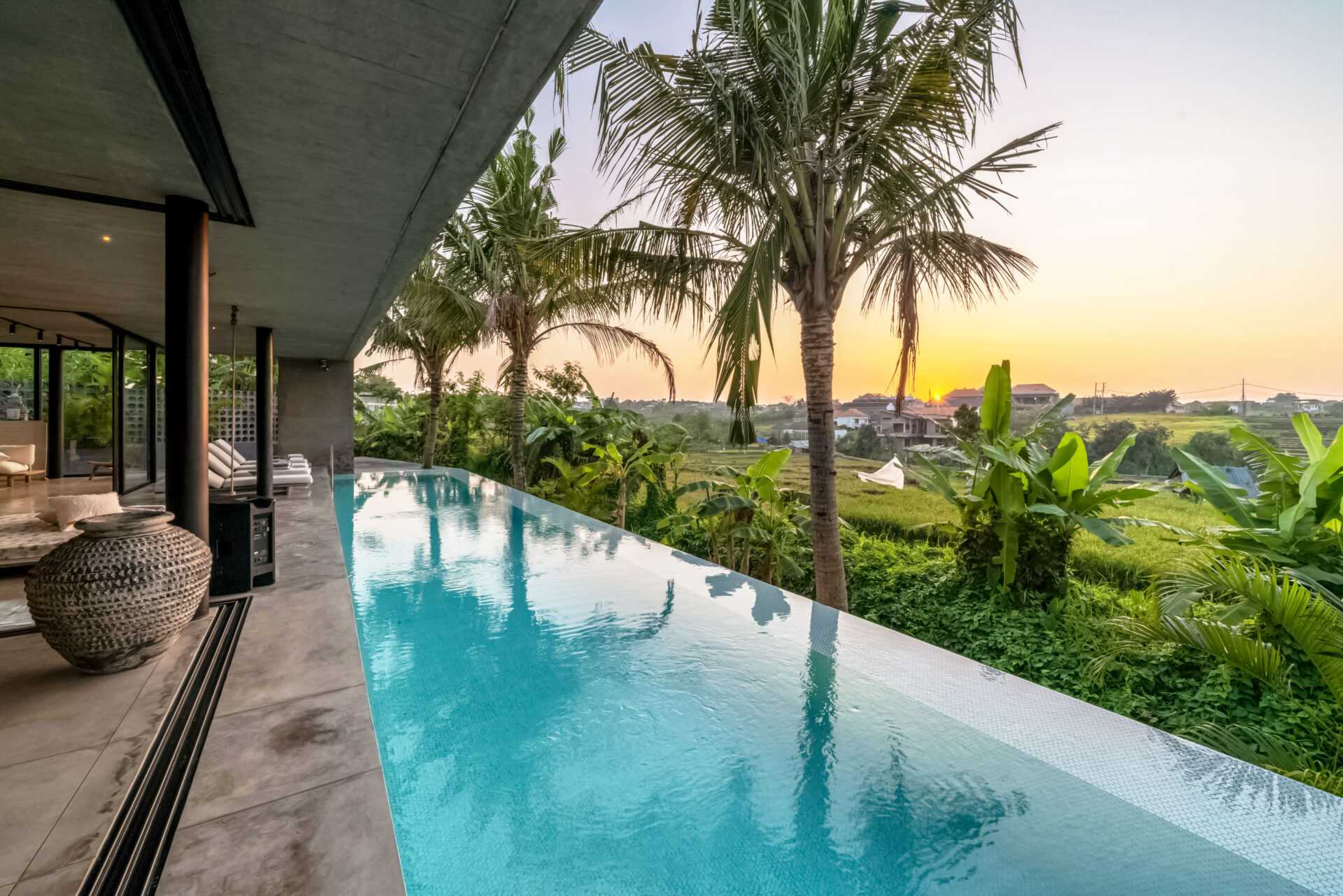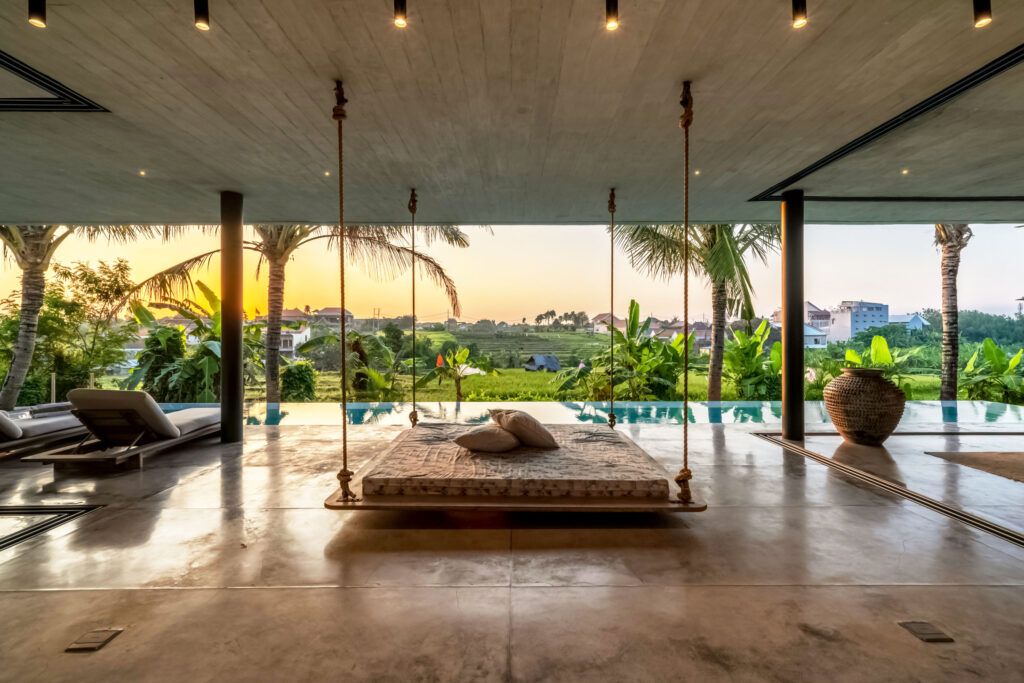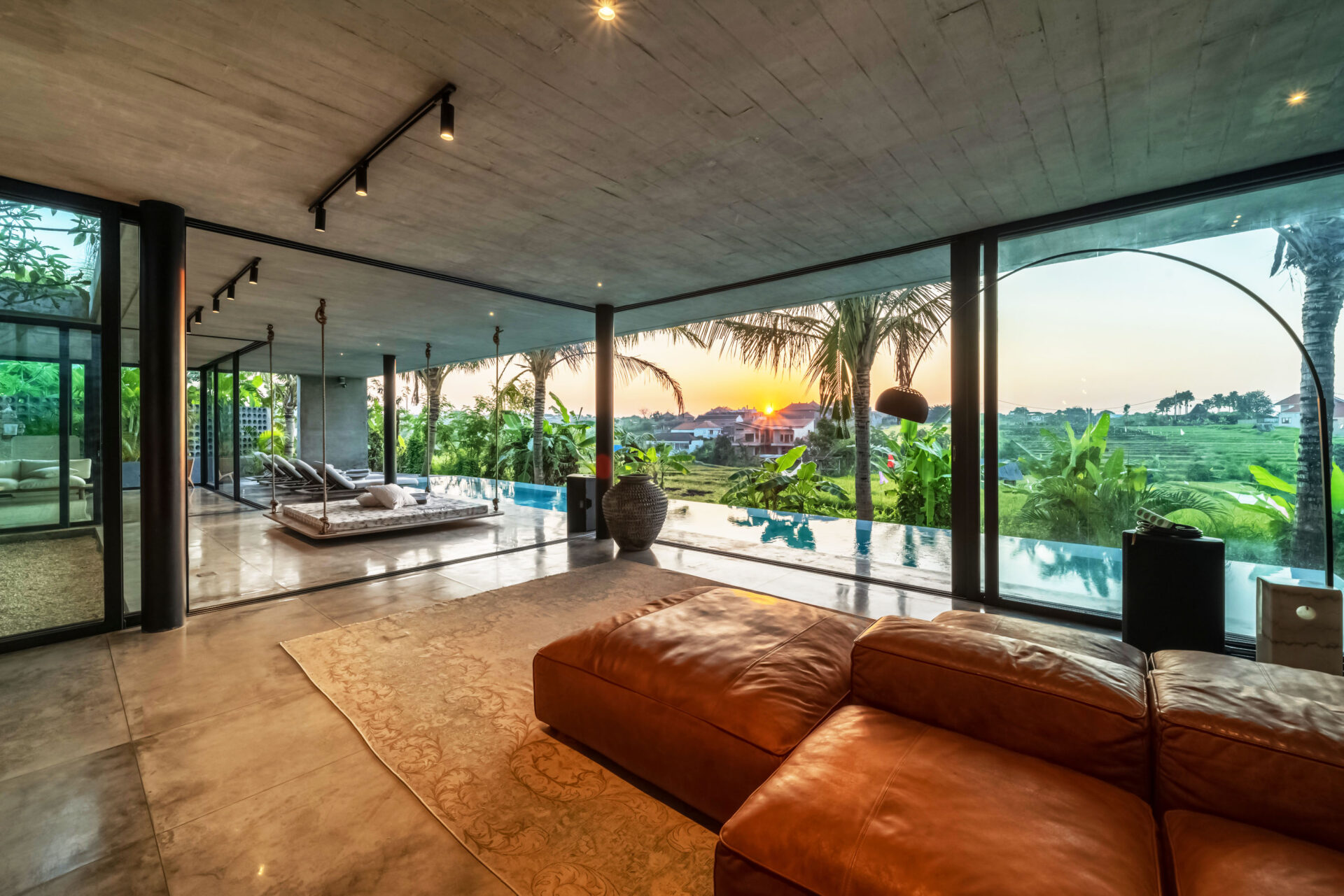 A striking floating bridge links the bedroom wing to expansive open-plan living areas. These spaces open onto sunlit terraces, a swimming pool, and sweeping views of surrounding rice fields, allowing for seamless indoor-outdoor living. With shaded lounging areas, rooftop sunbeds, and a private cinema room, the villa is thoughtfully designed for comfort, tranquility, and effortless luxury.