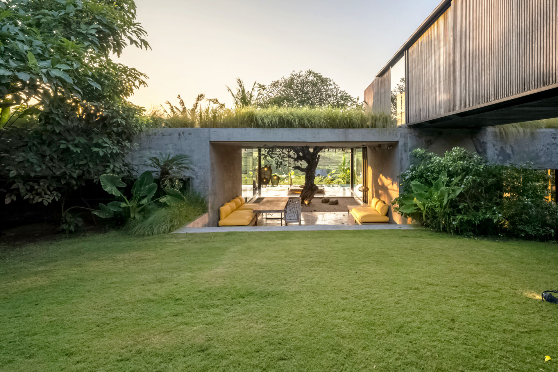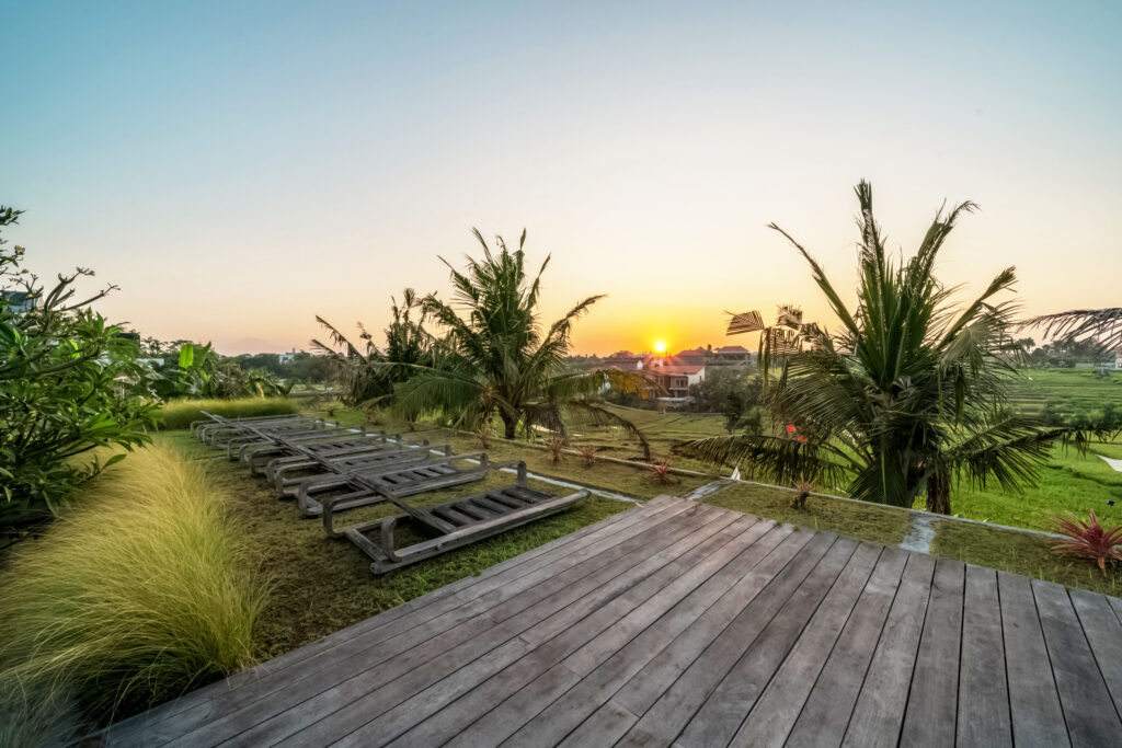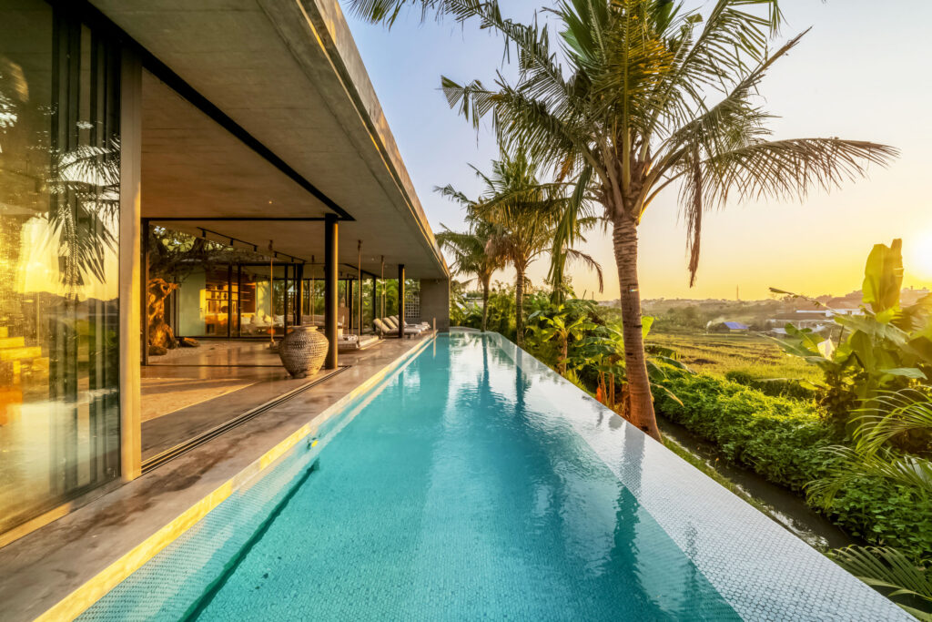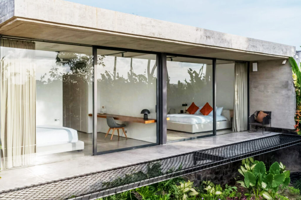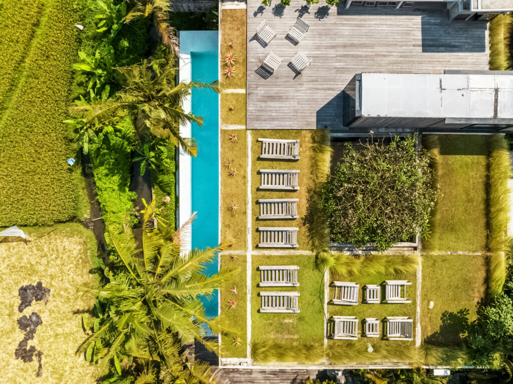 A striking floating bridge links the bedroom wing to expansive open-plan living areas. These spaces open onto sunlit terraces, a swimming pool, and sweeping views of surrounding rice fields, allowing for seamless indoor-outdoor living. With shaded lounging areas, rooftop sunbeds, and a private cinema room, the villa is thoughtfully designed for comfort, tranquility, and effortless luxury.