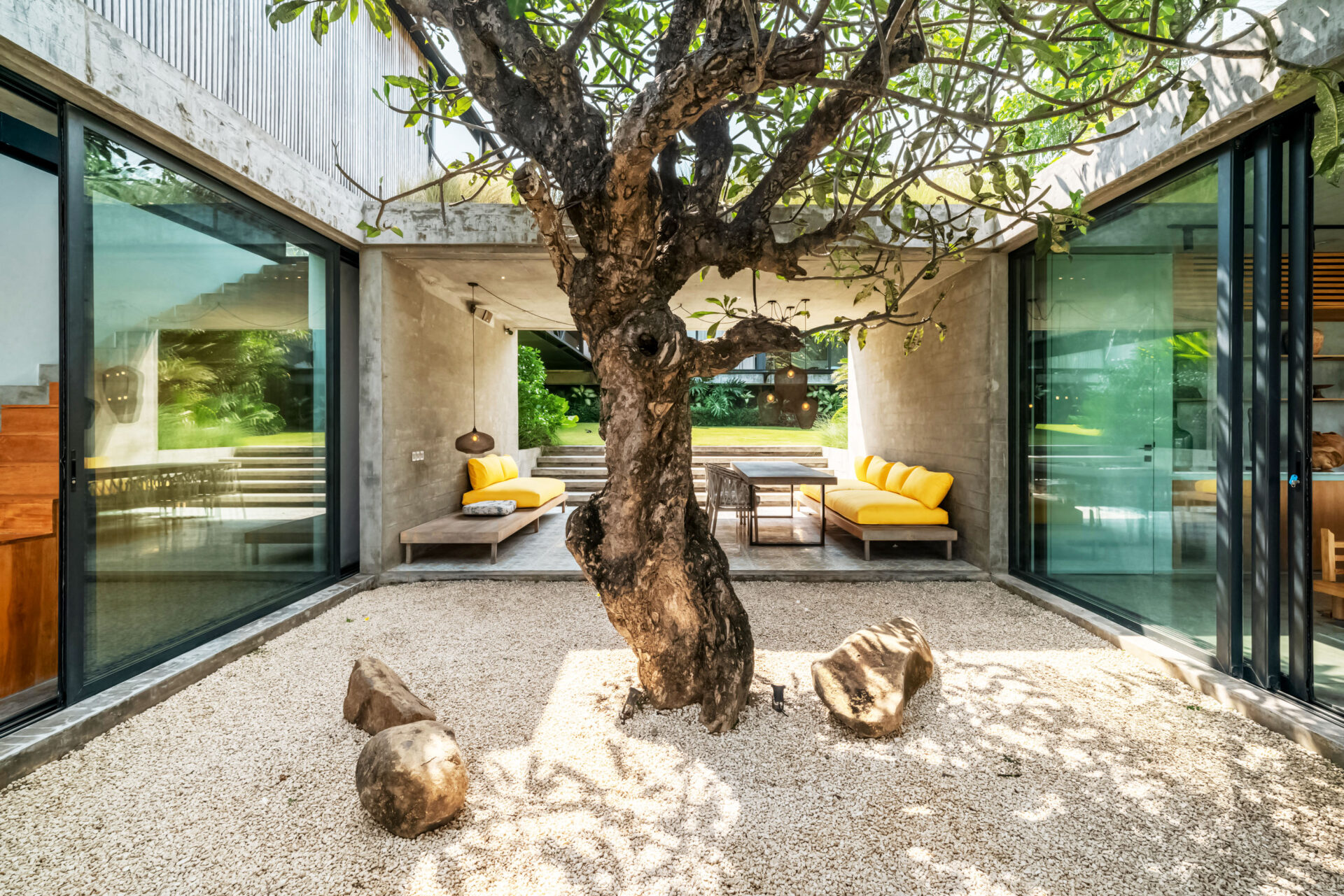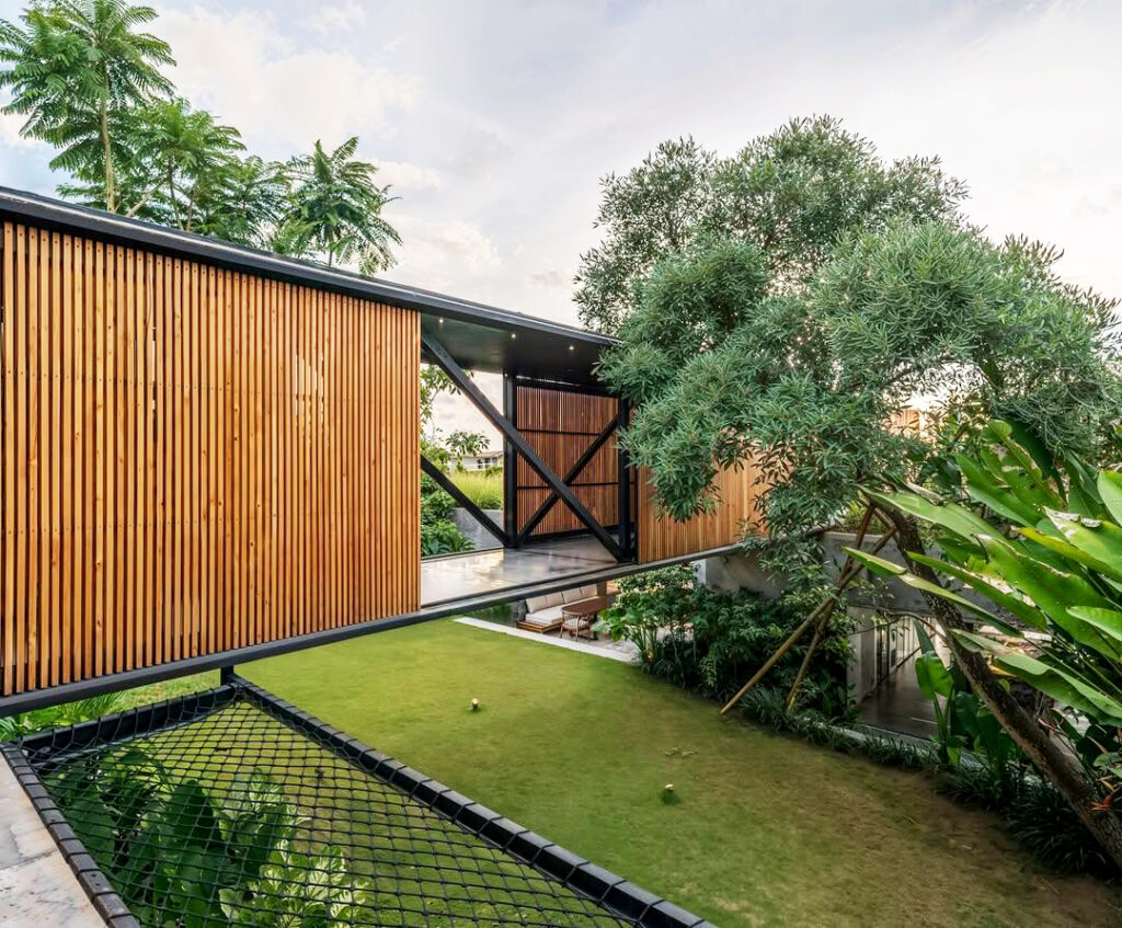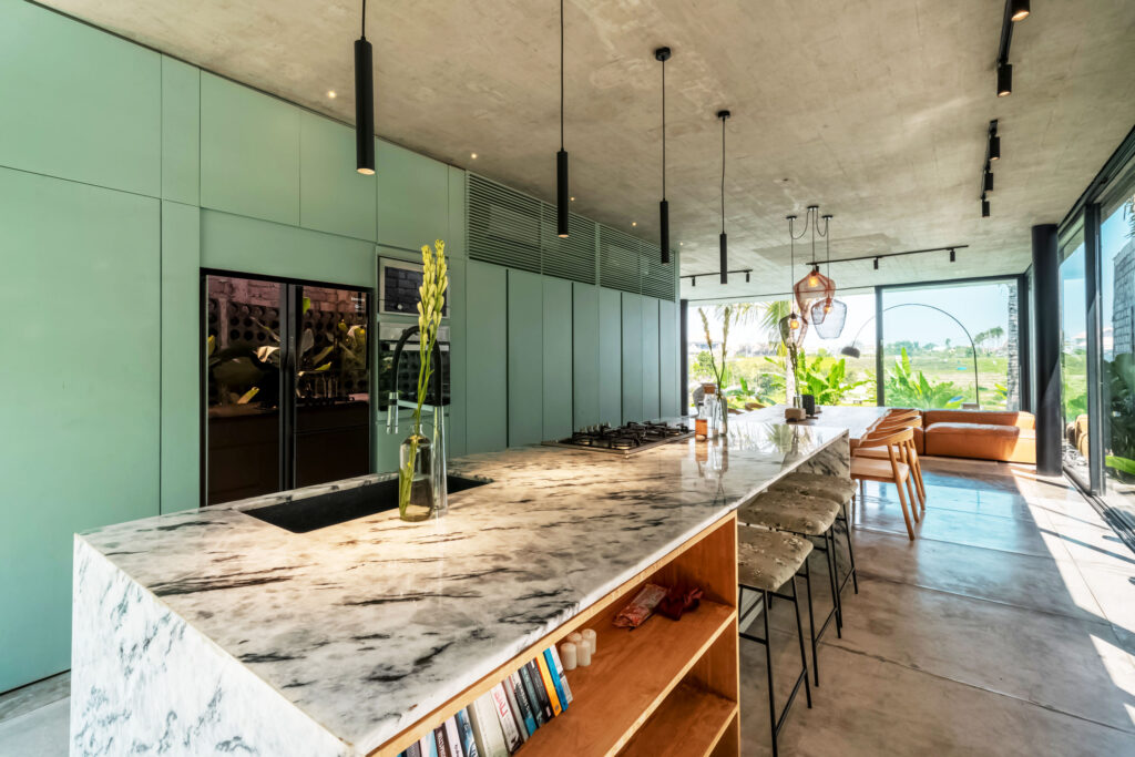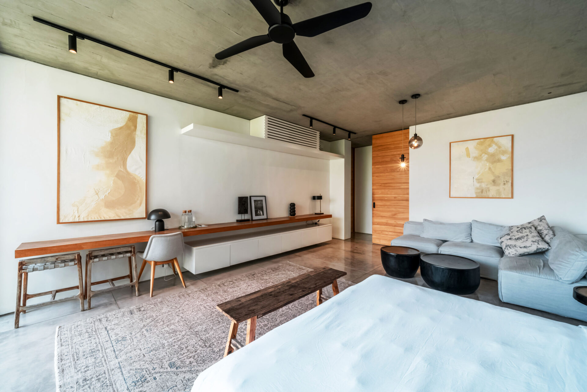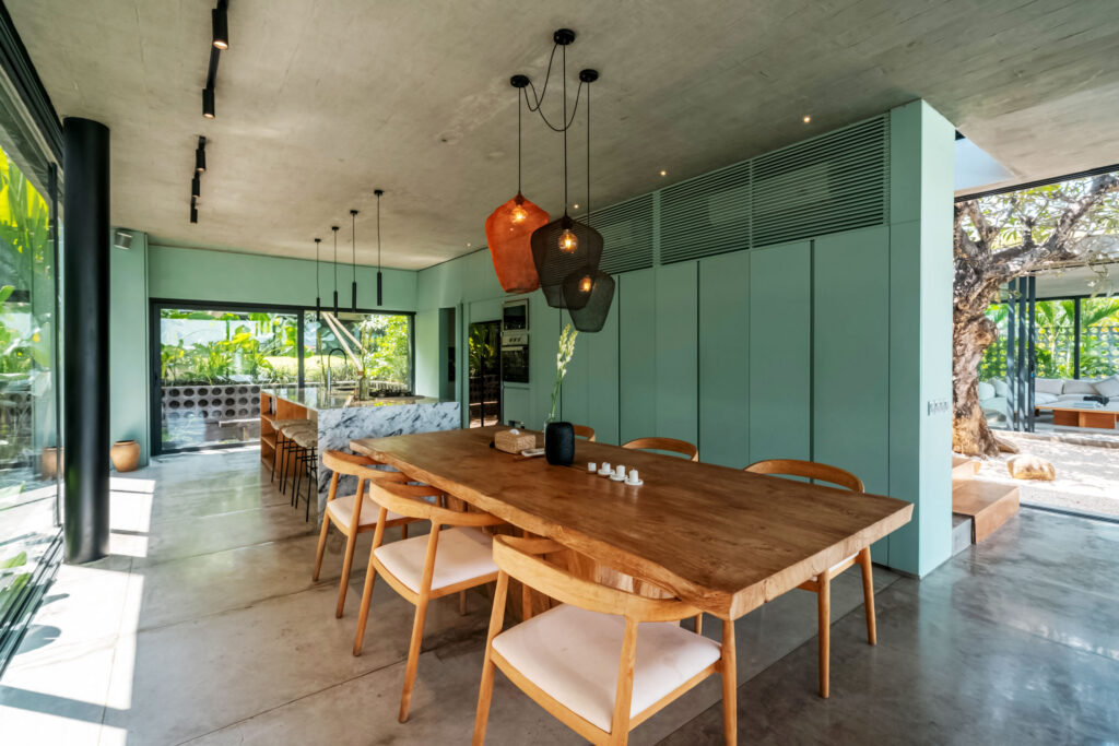 A striking floating bridge links the bedroom wing to expansive open-plan living areas. These spaces open onto sunlit terraces, a swimming pool, and sweeping views of surrounding rice fields, allowing for seamless indoor-outdoor living. With shaded lounging areas, rooftop sunbeds, and a private cinema room, the villa is thoughtfully designed for comfort, tranquility, and effortless luxury.