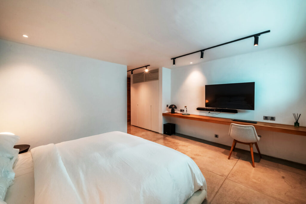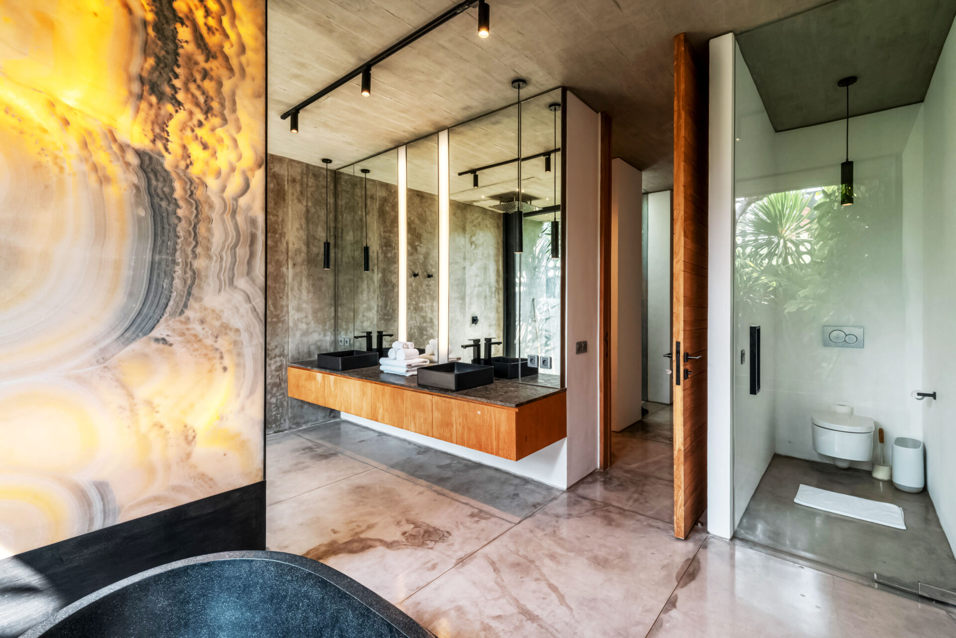 The villa combines clean architectural lines with warm natural materials such as stone, timber, and woven textures, creating a relaxed yet sophisticated atmosphere. It features five spacious ensuite bedrooms, each designed as a private retreat with calming neutral tones and natural finishes. Spa-style bathrooms include premium fittings, double vanities, and open rain showers that extend into landscaped outdoor courtyards.
