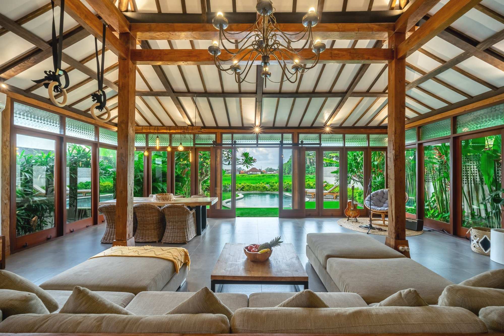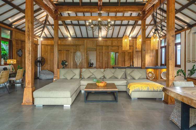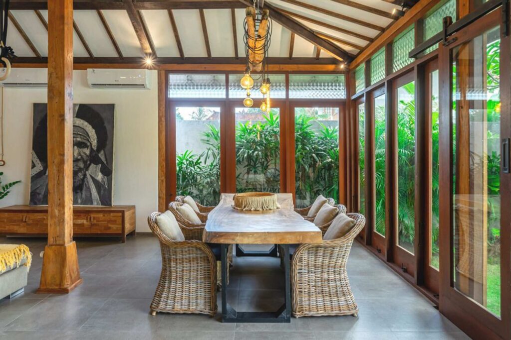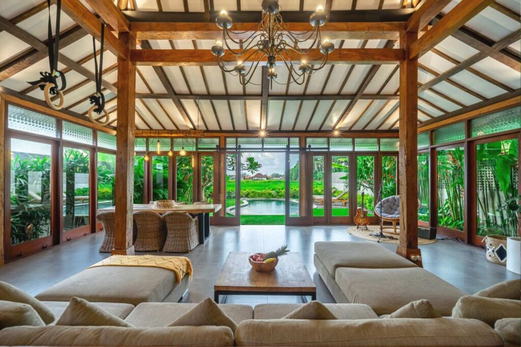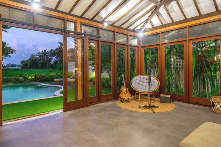 A joglo which is an Indonesian style house that is a symbol of nobility in Javanese culture built out of teak. For those that don’t feel its hot enough in Bali there is a hammam / steam room to enjoy after long lazy days in the freeform pool. Furnished with a natural colour palette with impressive art work working in the rich historical tapestry of Indonesia. Soft lighting throughout make this a romantic evening home with rice field views throughout the day as far as the eye can see. Well-chosen tiles add interest and colour pop in the bathrooms and both bedrooms are large doubles.