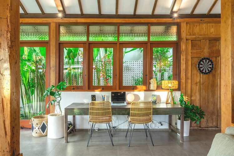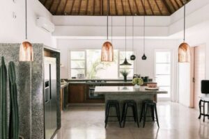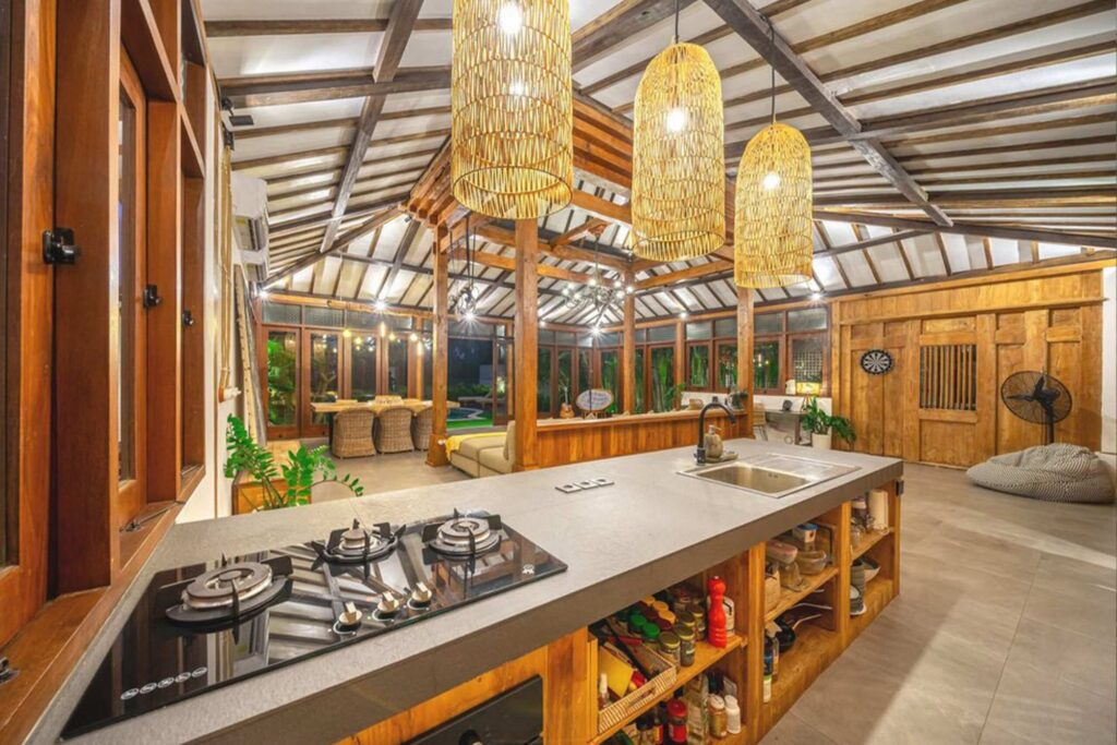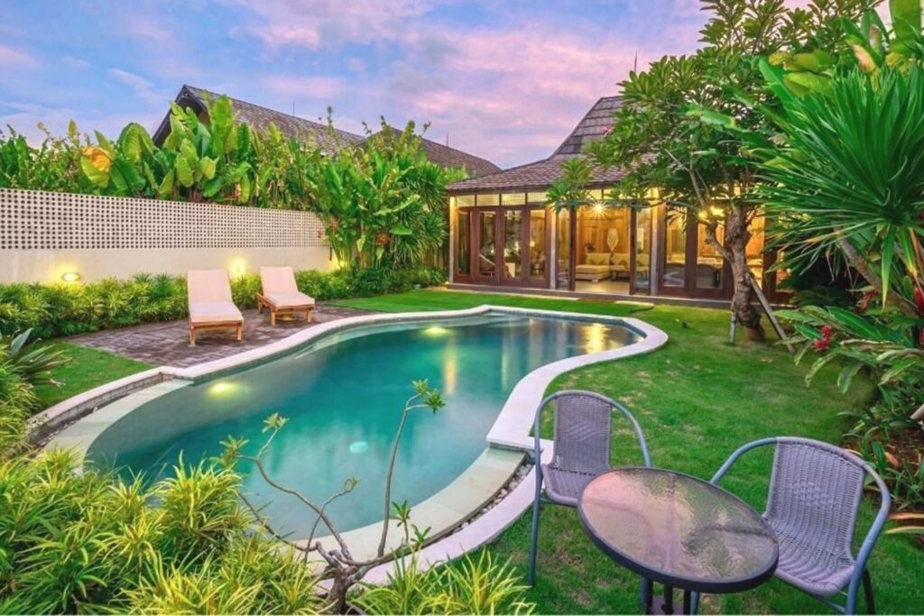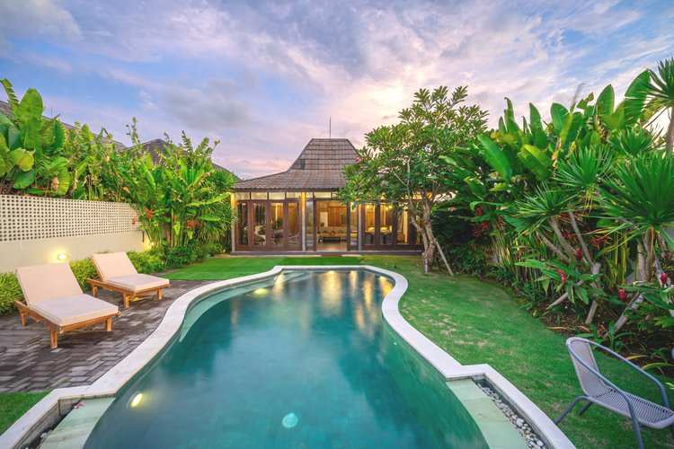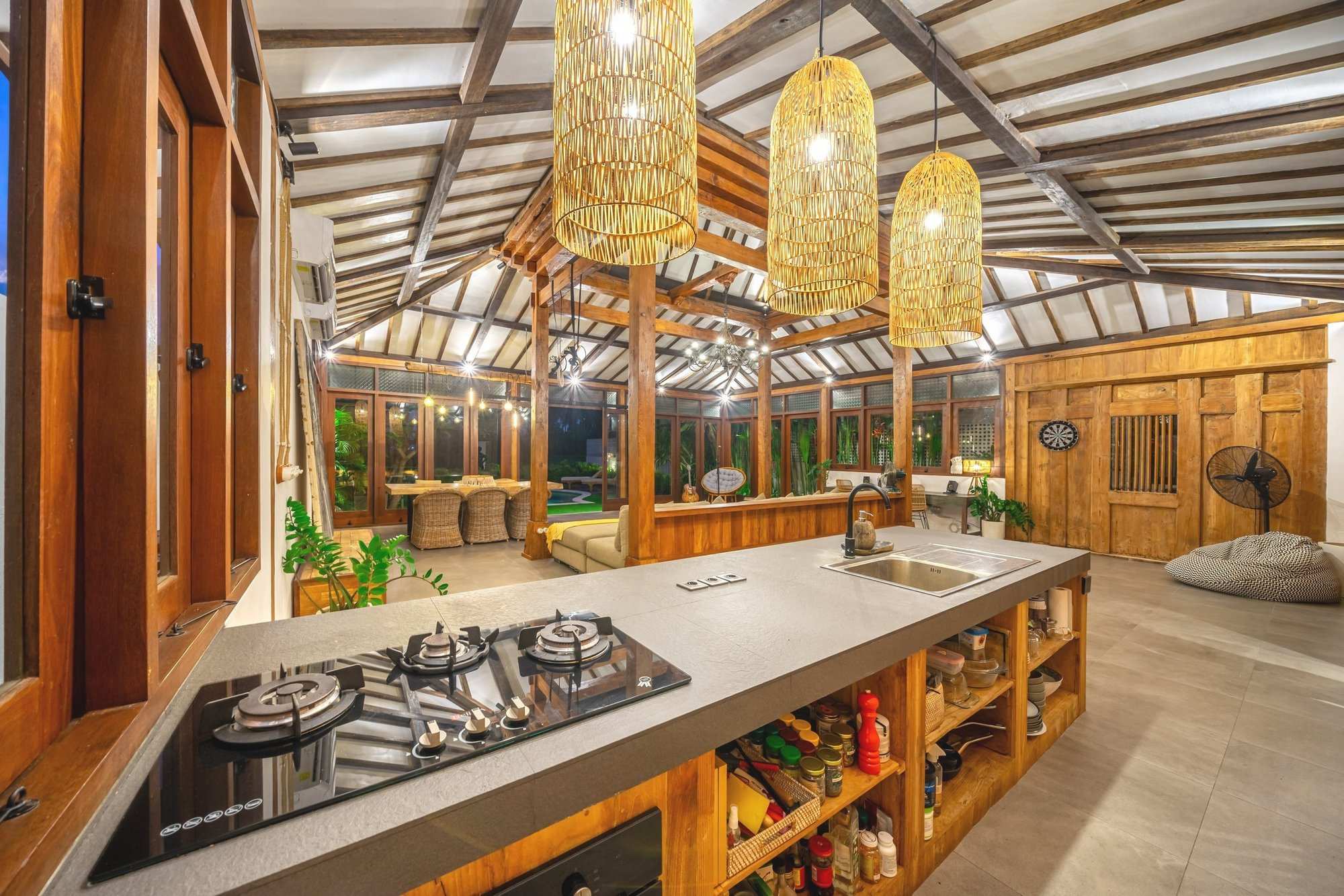 A joglo which is an Indonesian style house that is a symbol of nobility in Javanese culture built out of teak. For those that don’t feel its hot enough in Bali there is a hammam / steam room to enjoy after long lazy days in the freeform pool. Furnished with a natural colour palette with impressive art work working in the rich historical tapestry of Indonesia. Soft lighting throughout make this a romantic evening home with rice field views throughout the day as far as the eye can see. Well-chosen tiles add interest and colour pop in the bathrooms and both bedrooms are large doubles.
