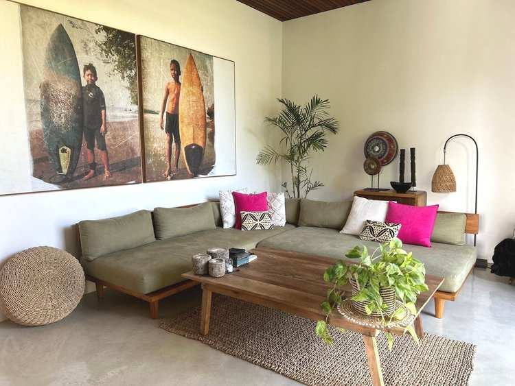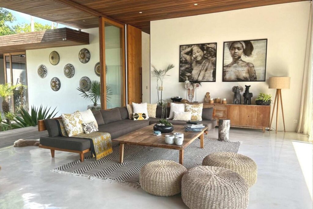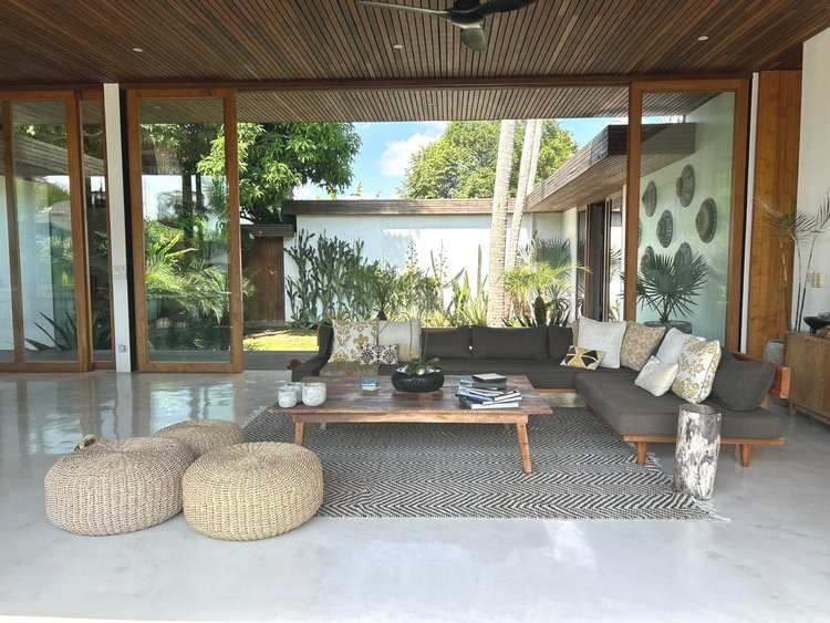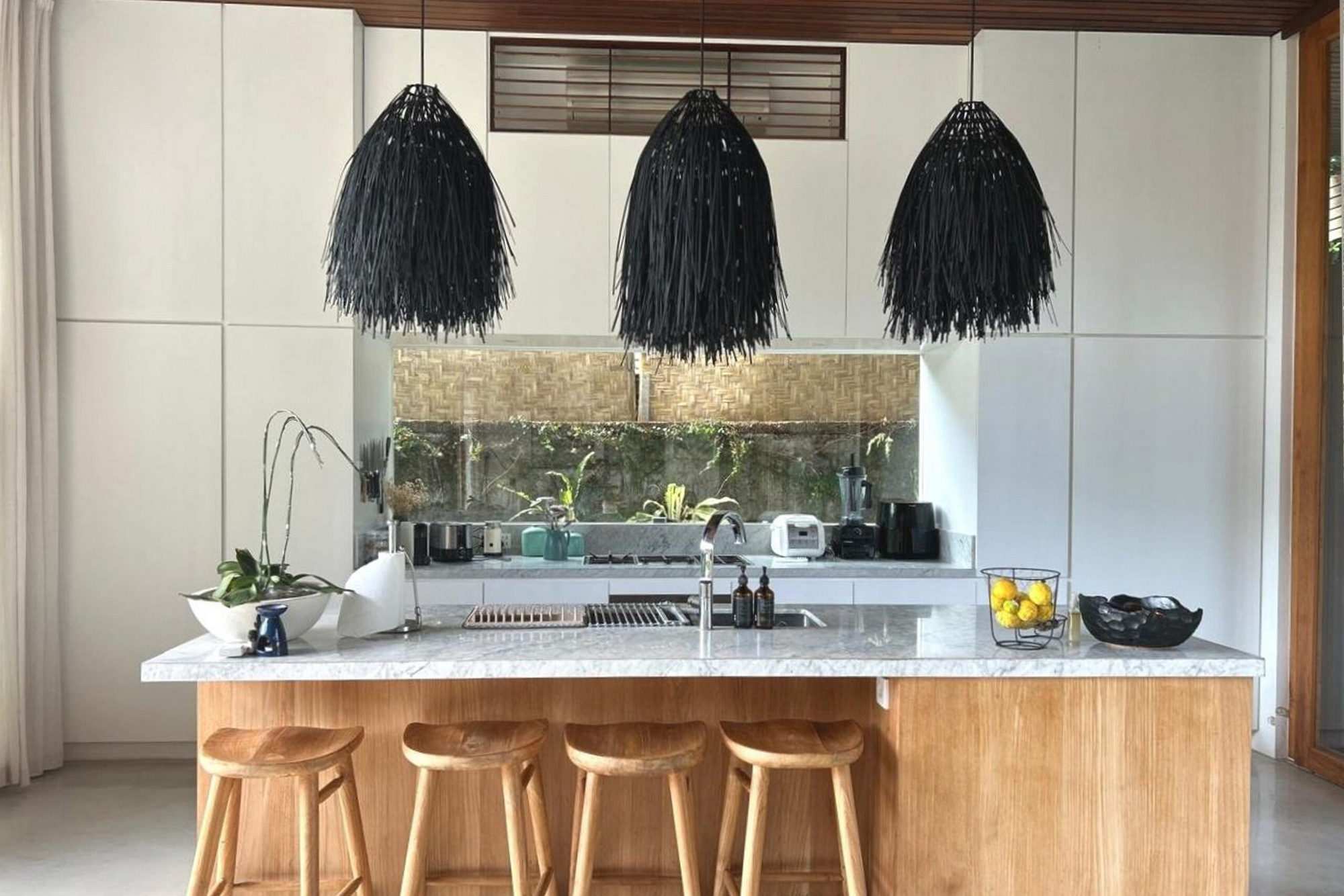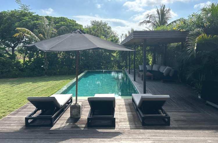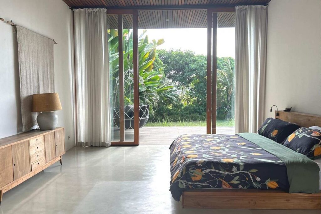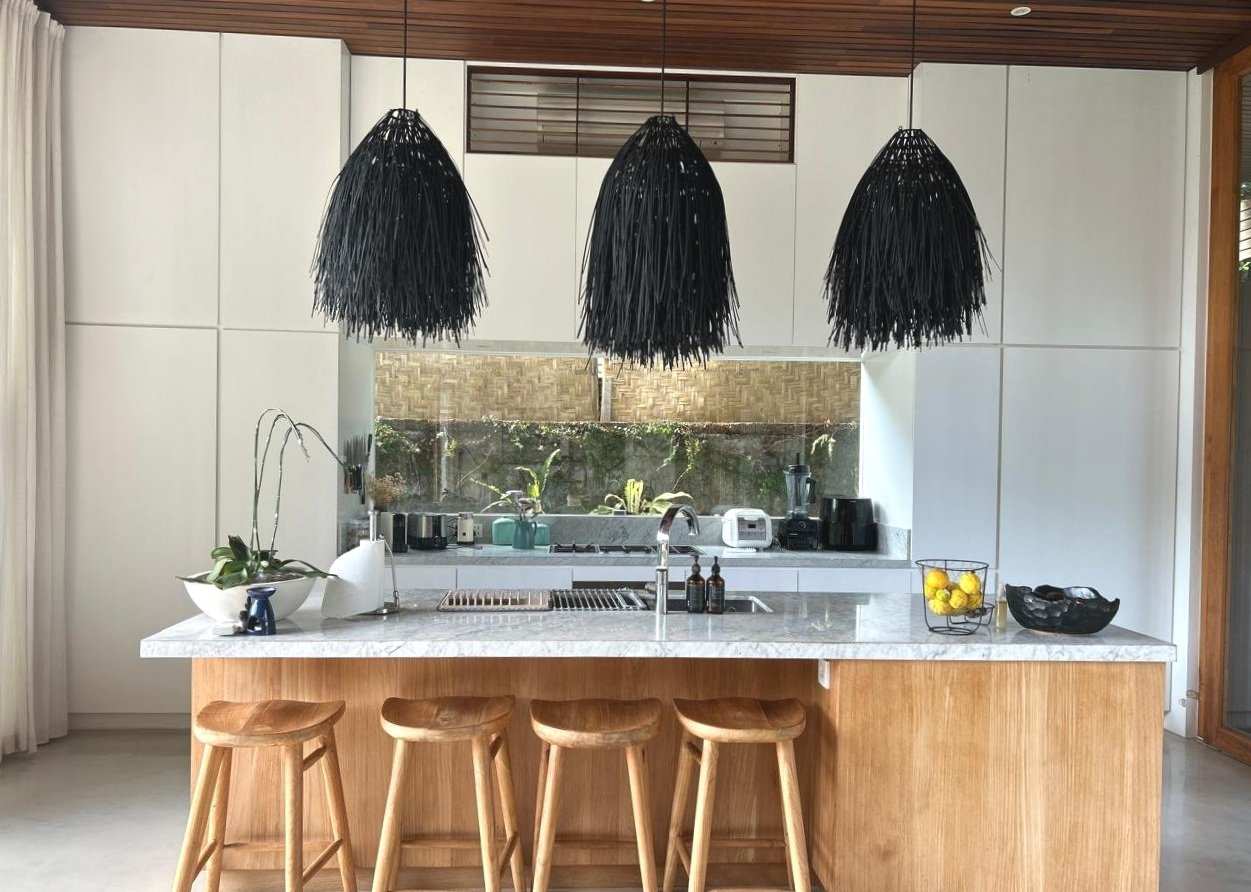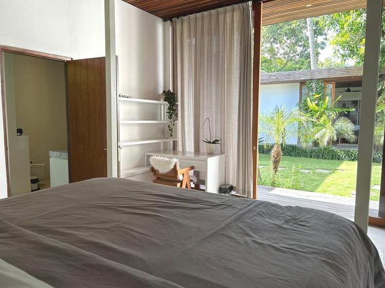 The kitchen is fully fitted with modern high end appliances with a dining table seating 8 as well as a separate tv room or third bedroom. Neutral in style, homely in feel… a perfect landing spot for those arriving in Bali looking for their long term home, or equally a sanctuary enjoyable for all ages on holiday!