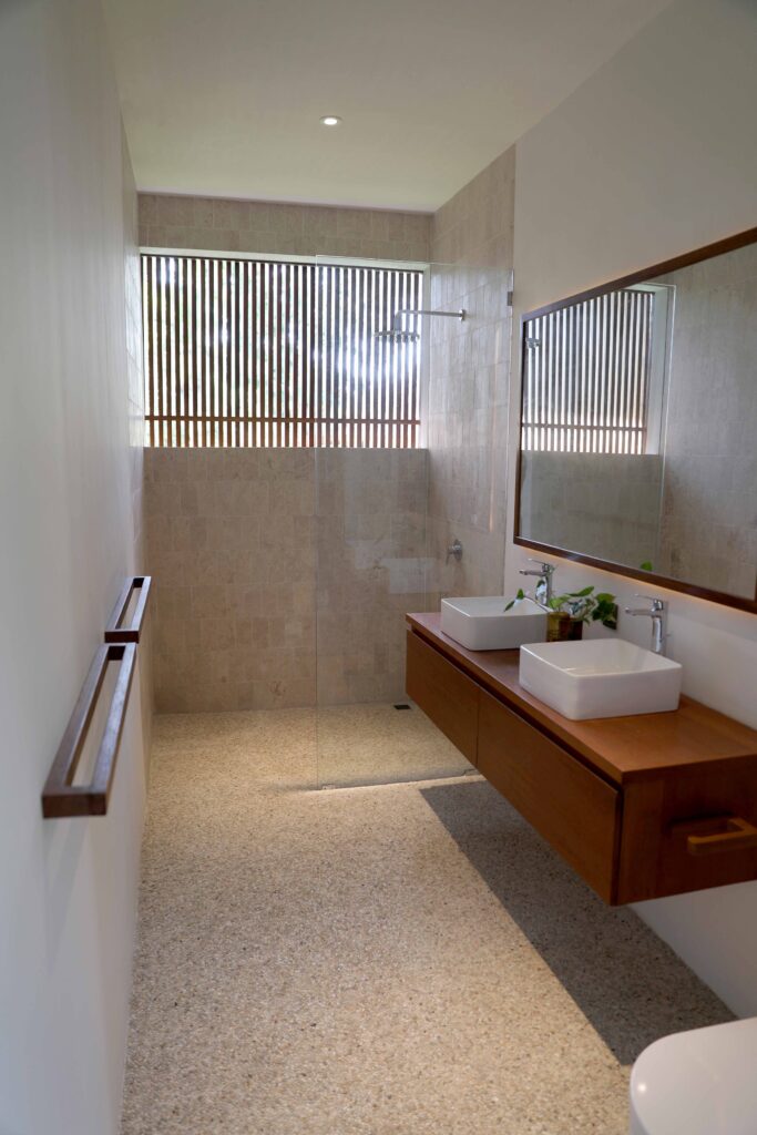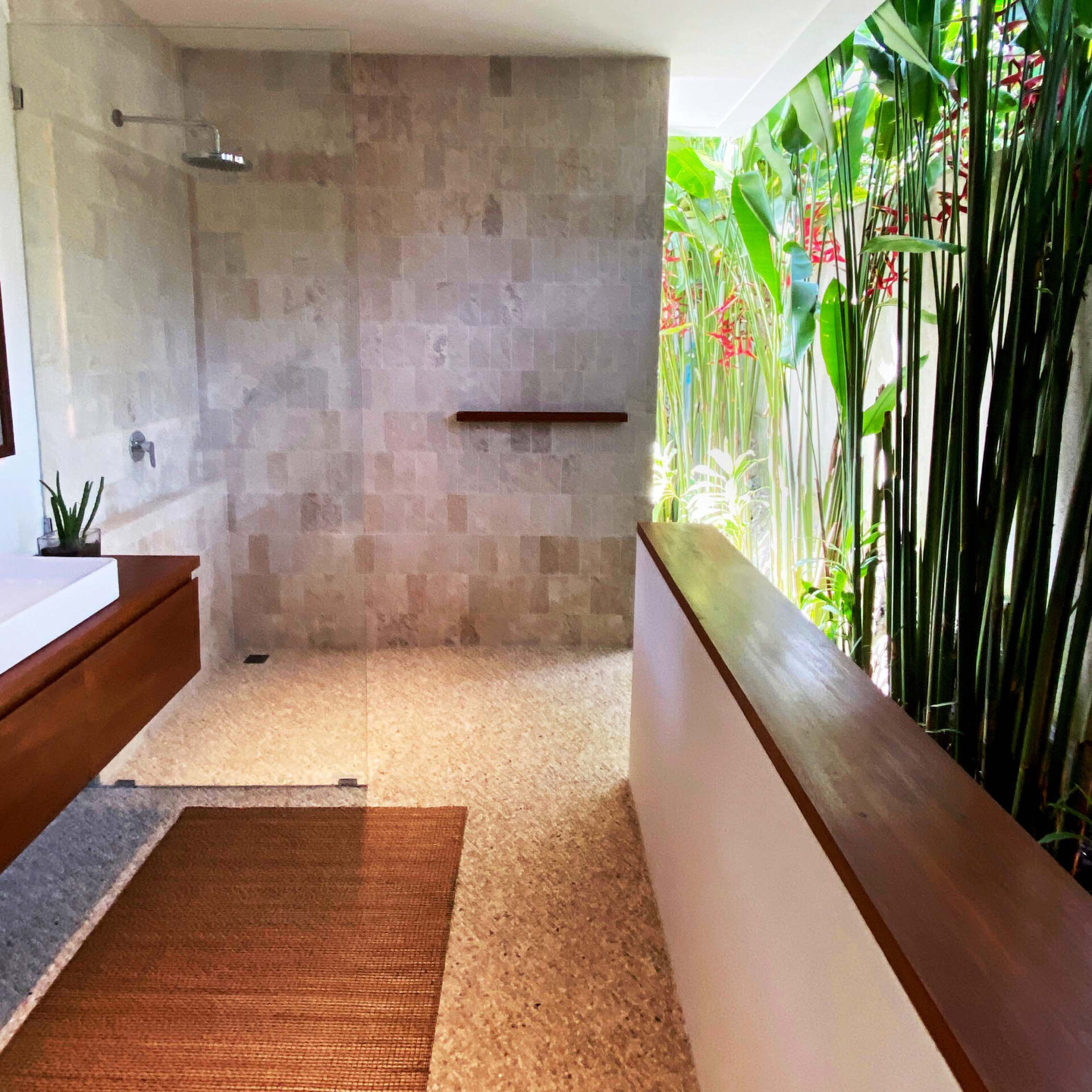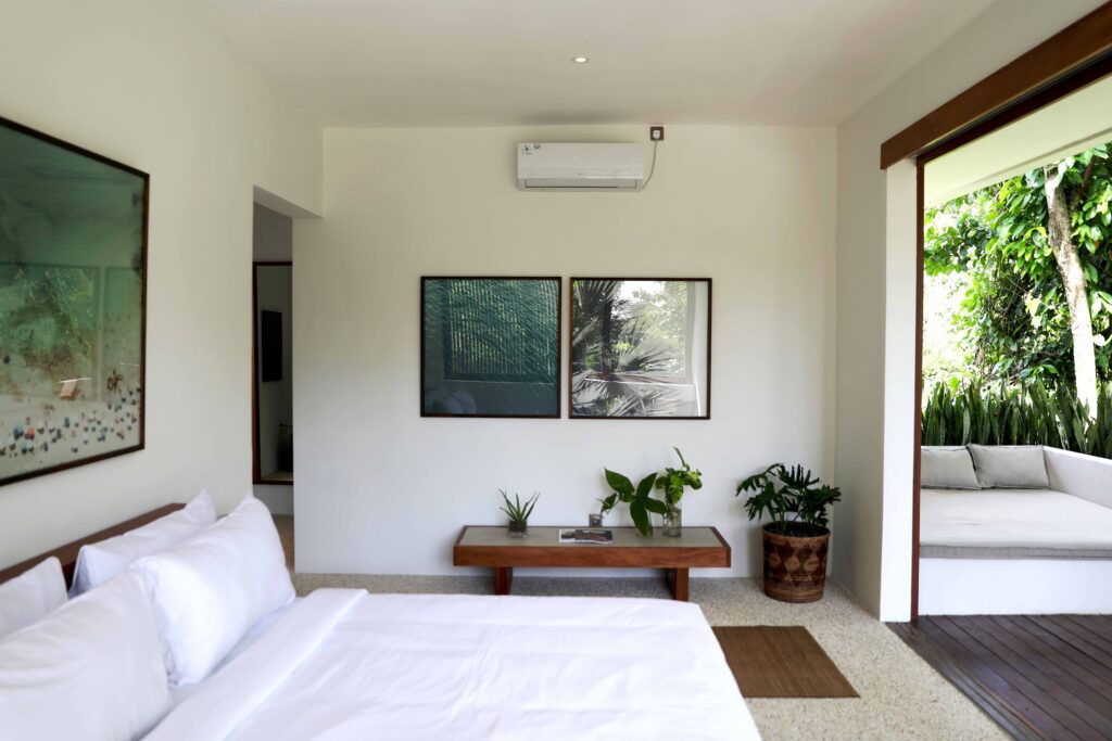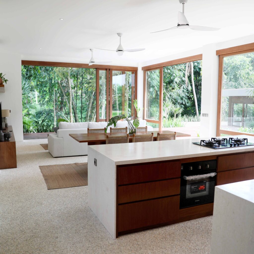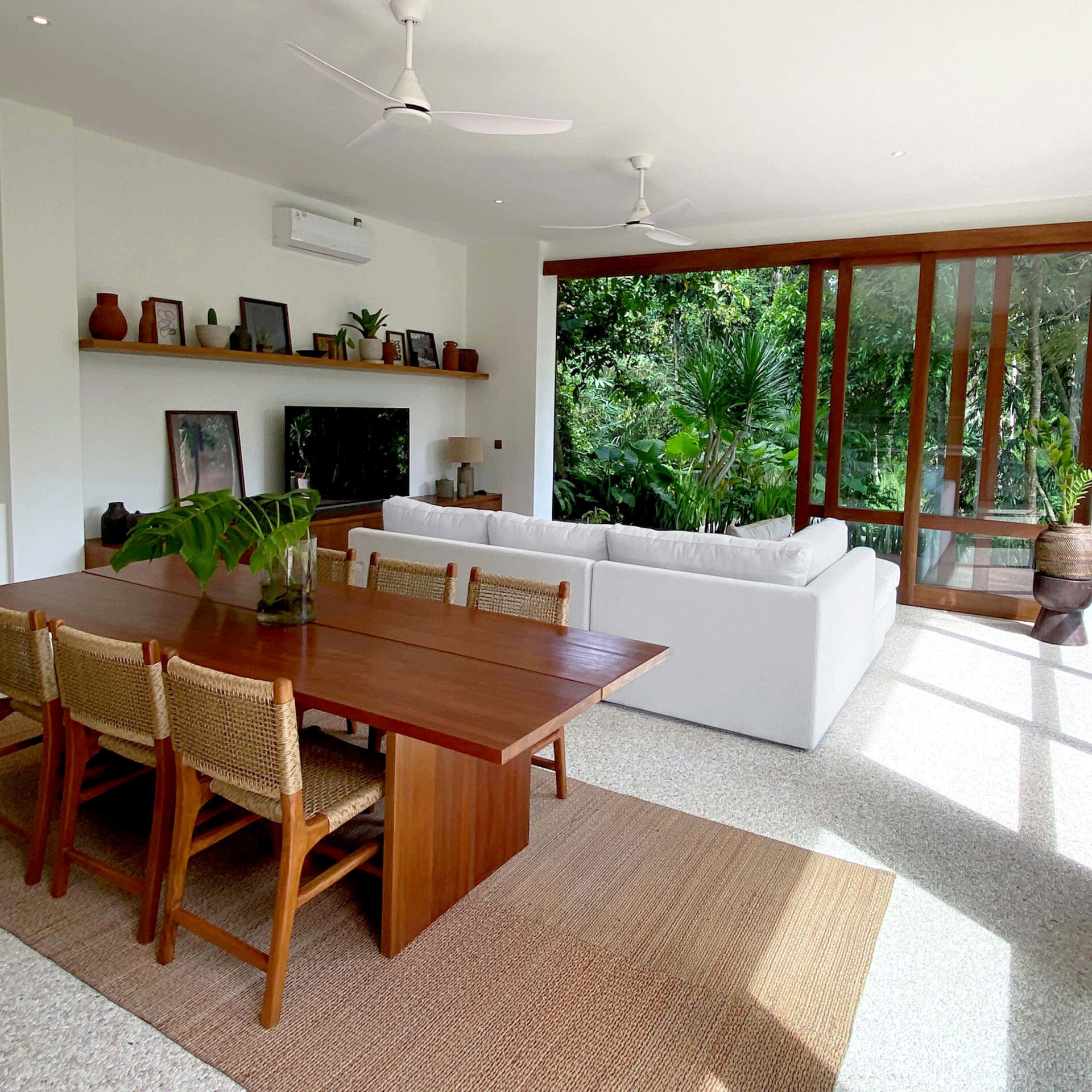 The spacious living and dining areas open seamlessly to the surrounding tropical environment, creating an atmosphere of relaxed sophistication. From the upper level, enjoy calming views of the river and greenery, making every moment in the villa feel like a private retreat.