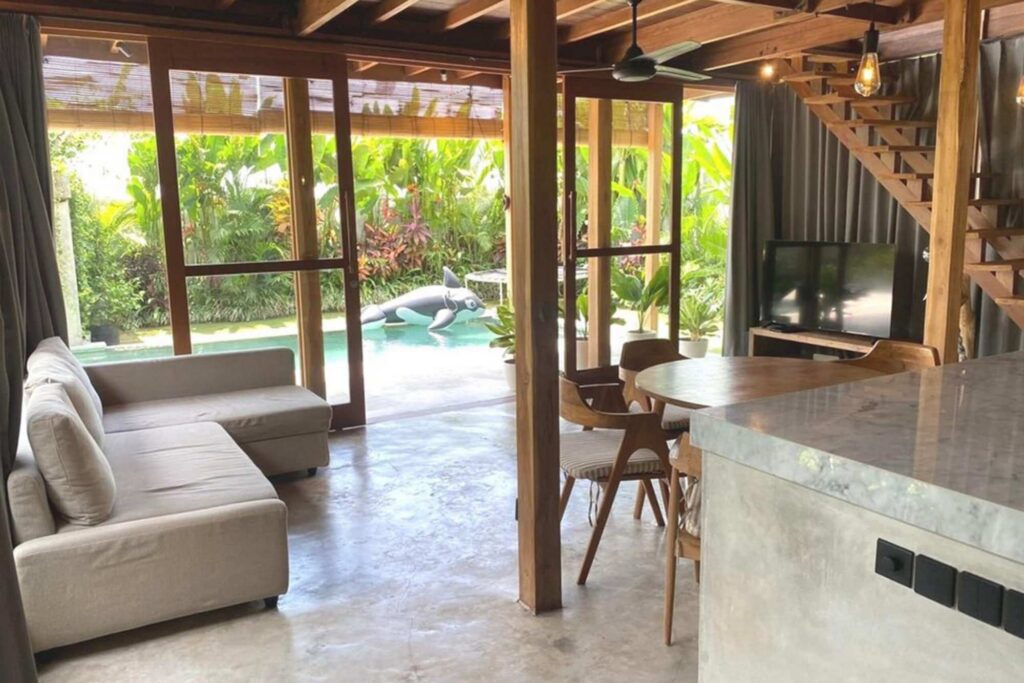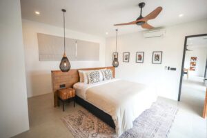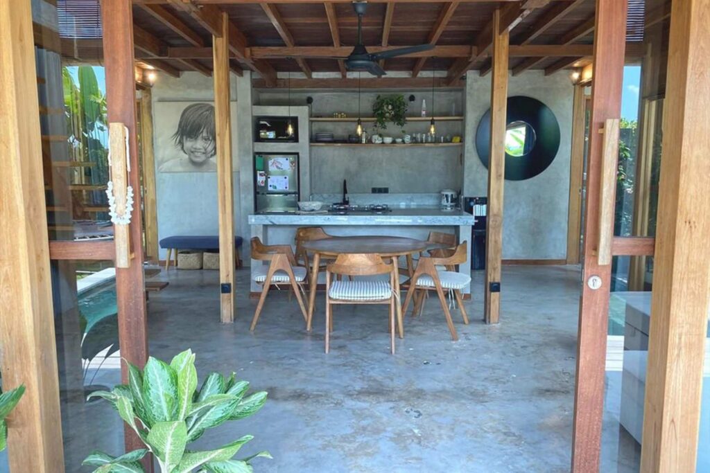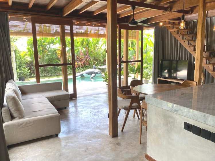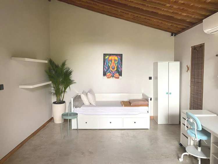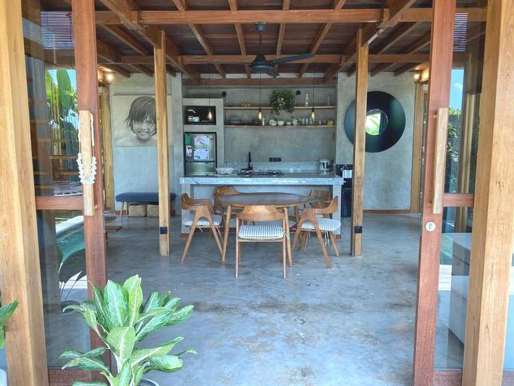 Upstairs with a walk-in wardrobe and proper bath in the bathroom. A utility room at the back keeps the washing machine at bay, whilst the open plan kitchen looks over the sitting room to the pool.