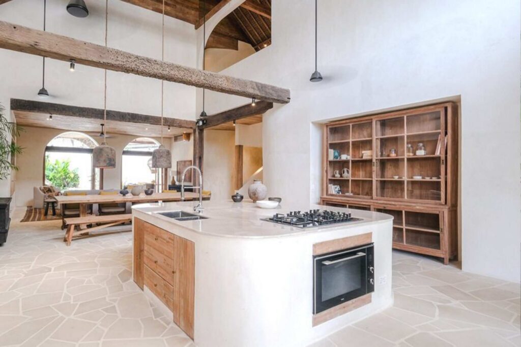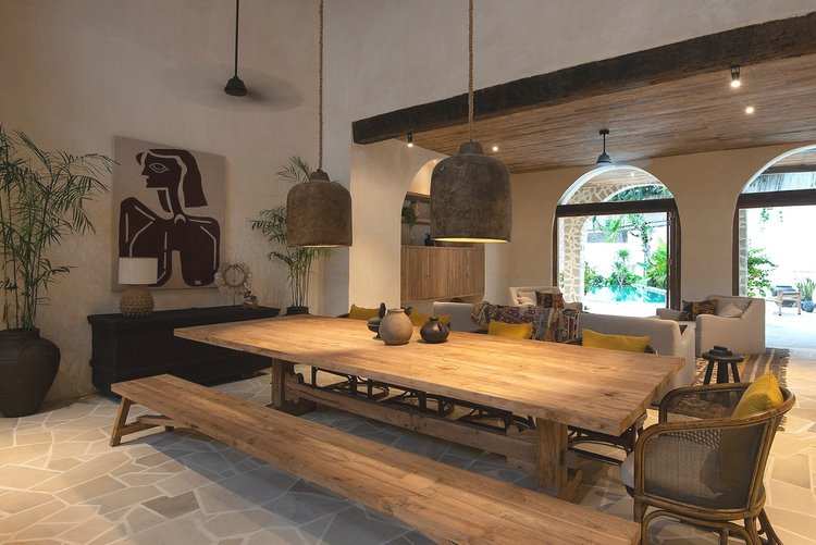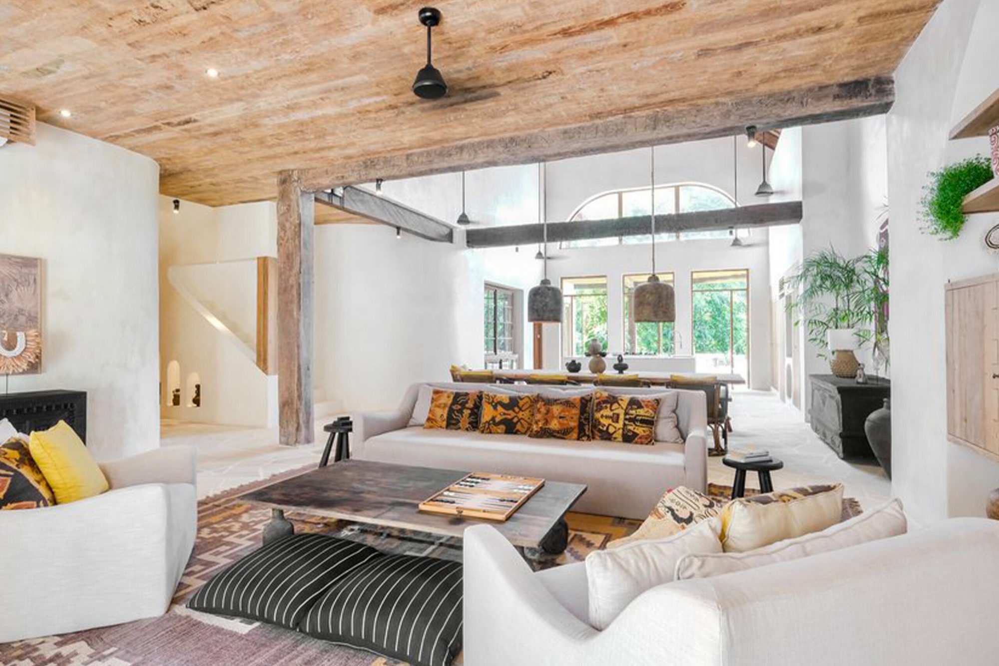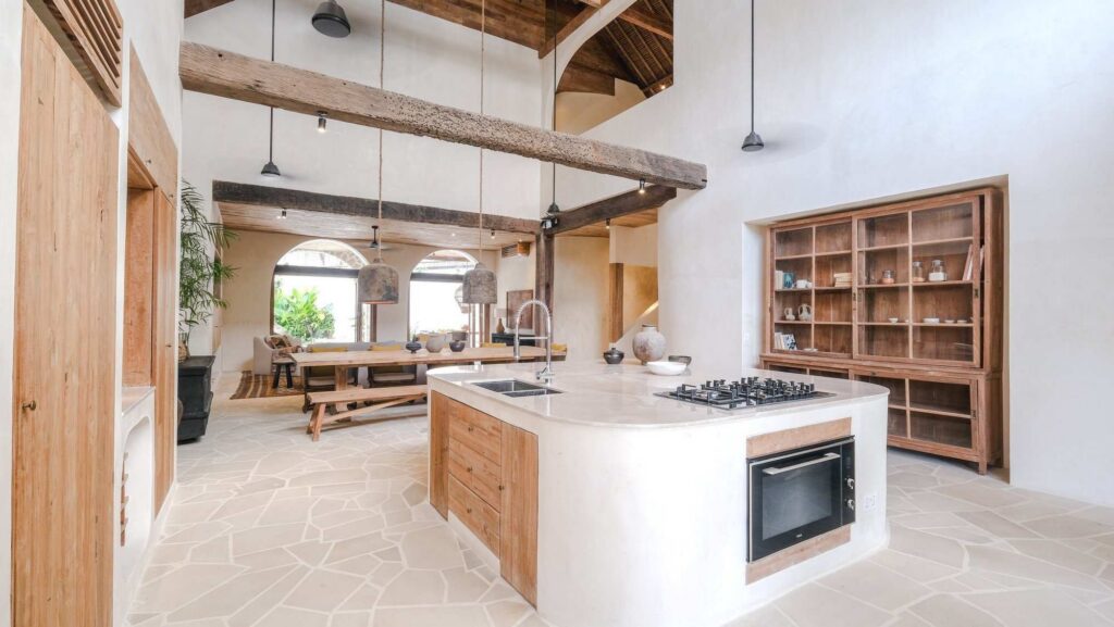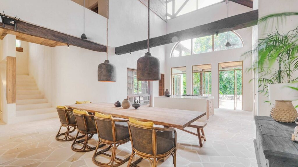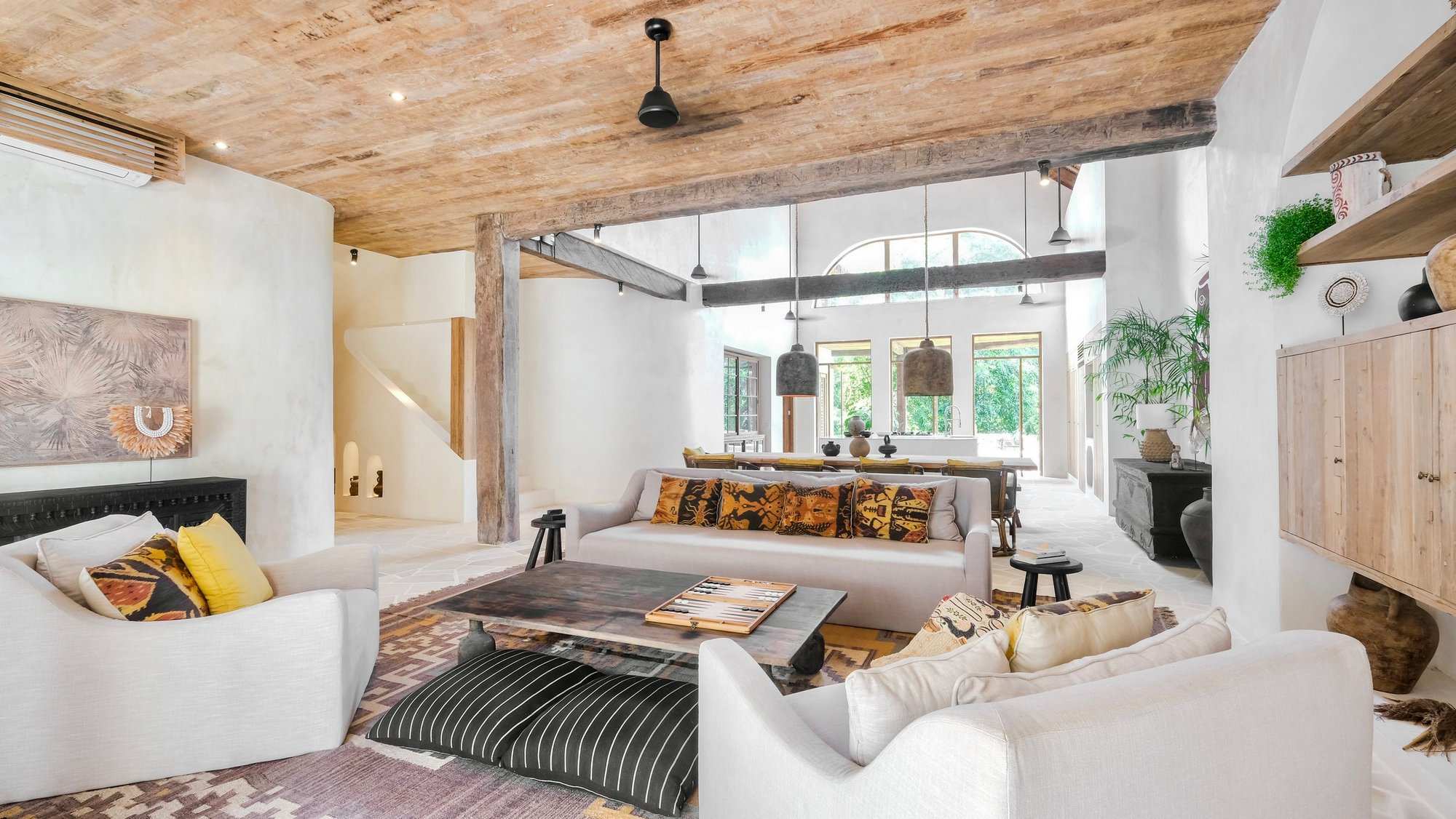 • Sustainable home with earthen walls, recycled timber, natural stone & alang-alang roof.