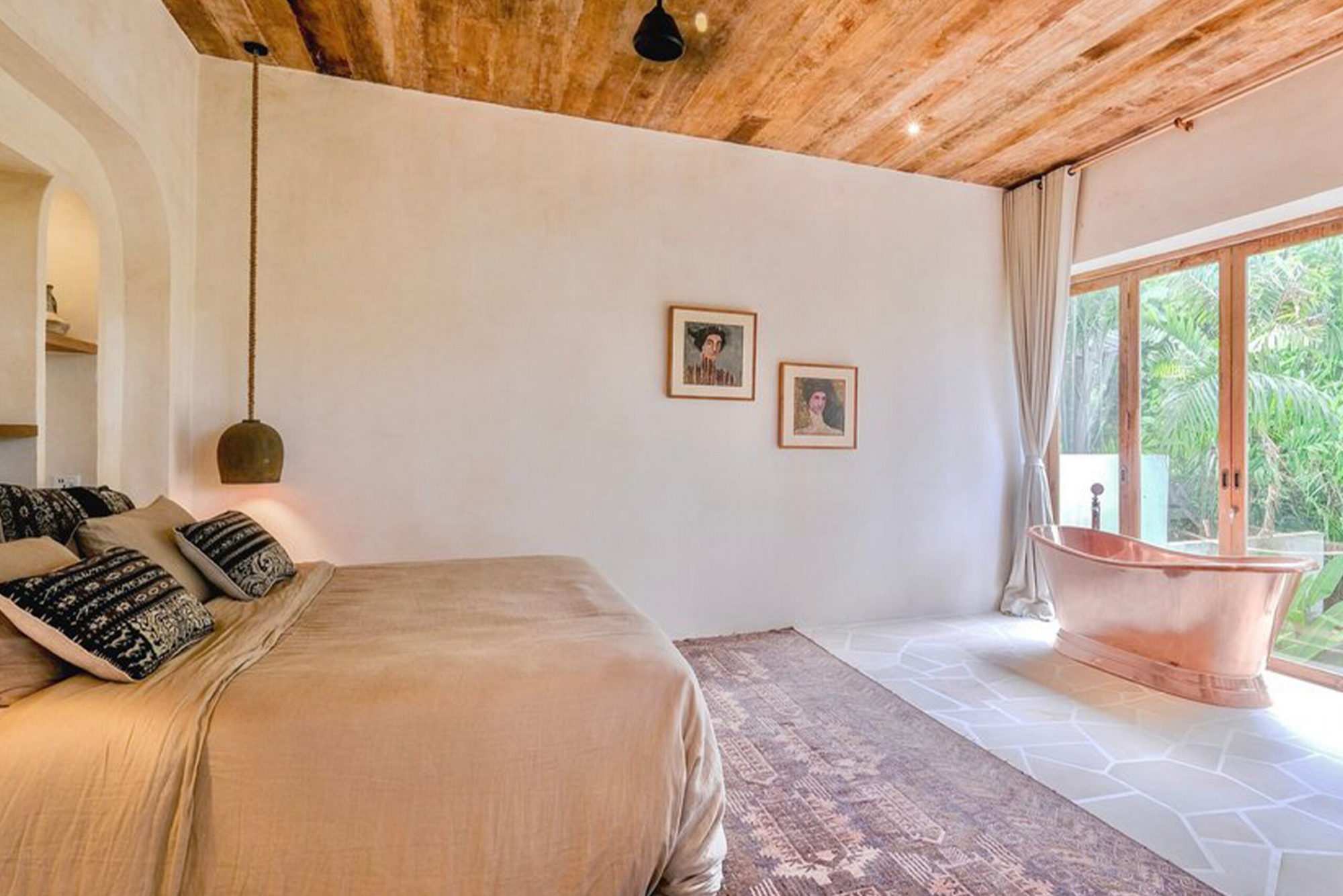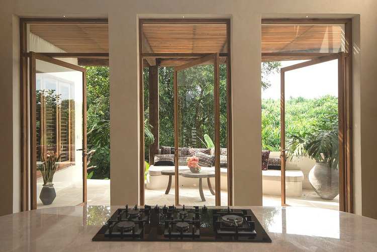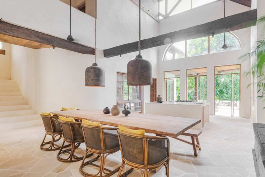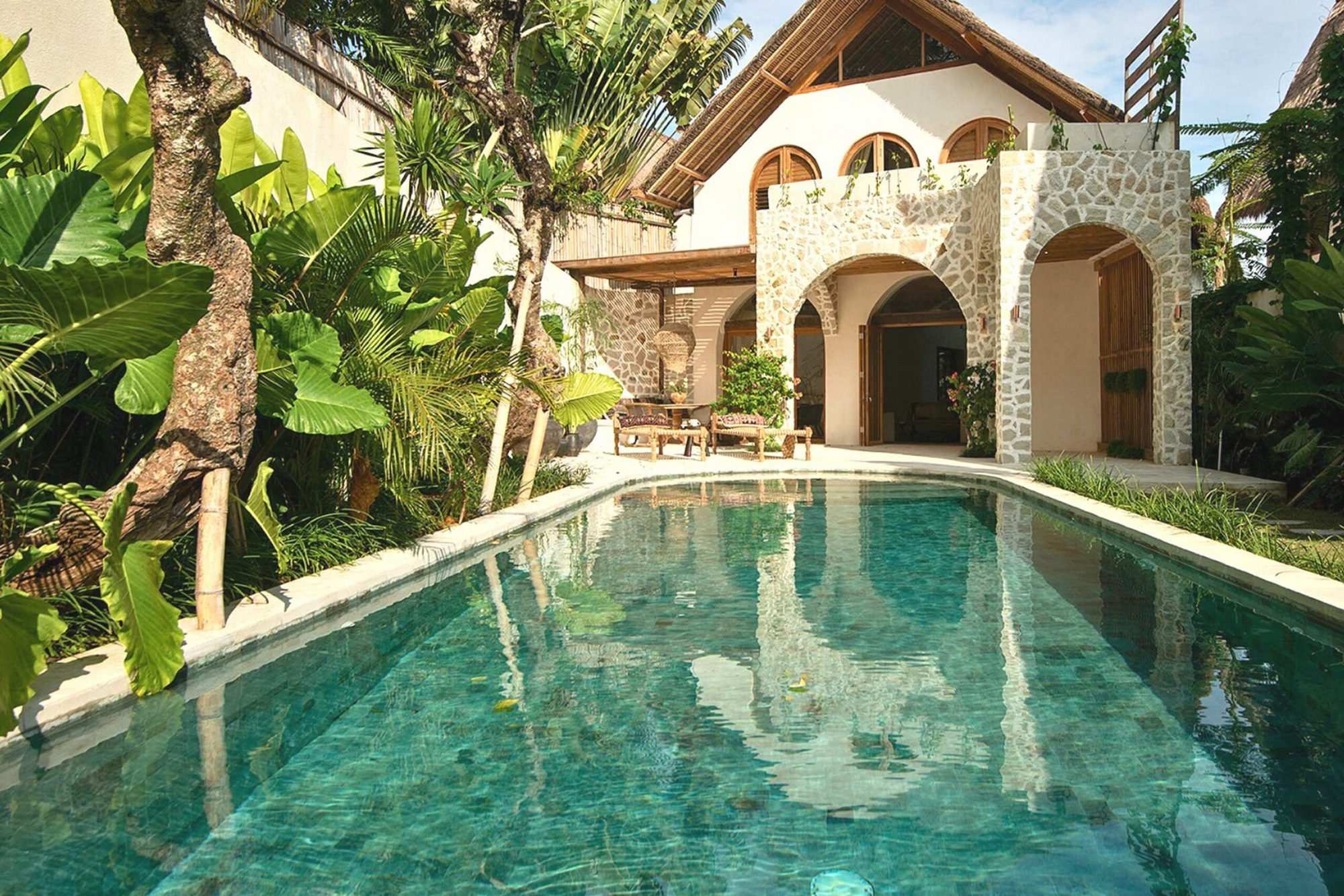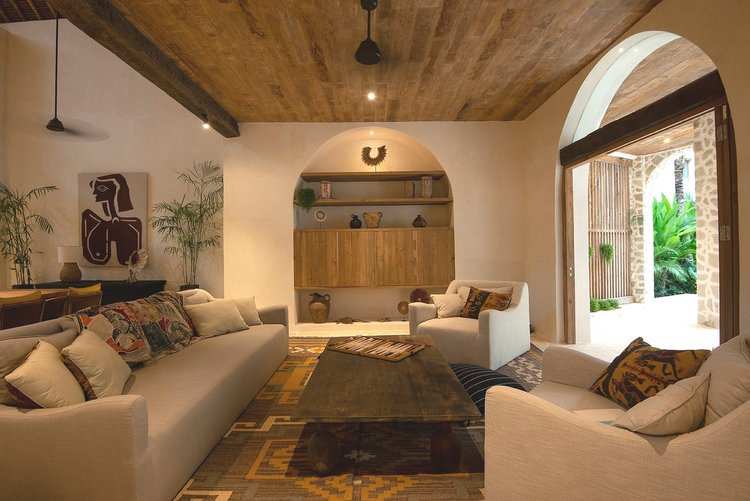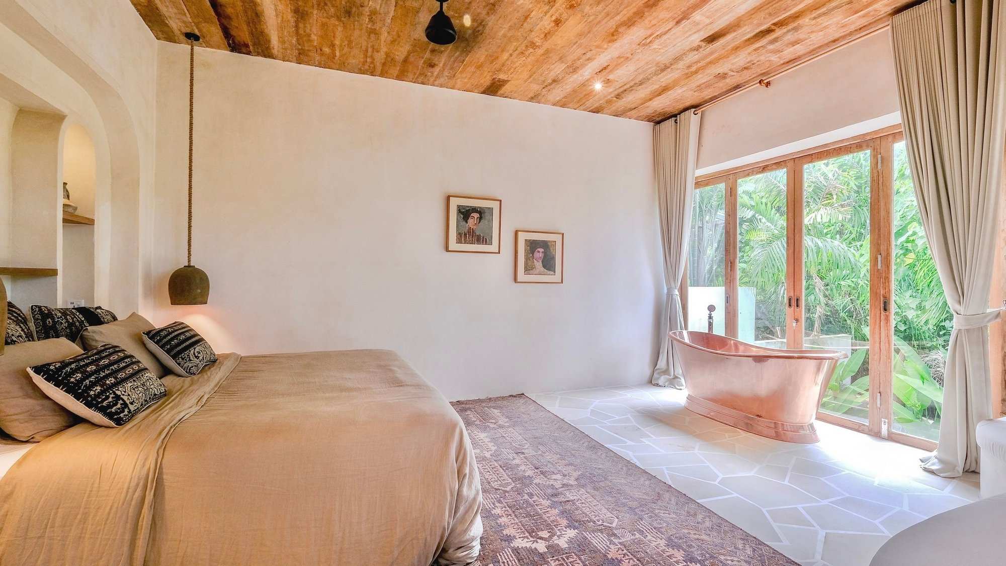 • Sustainable home with earthen walls, recycled timber, natural stone & alang-alang roof.