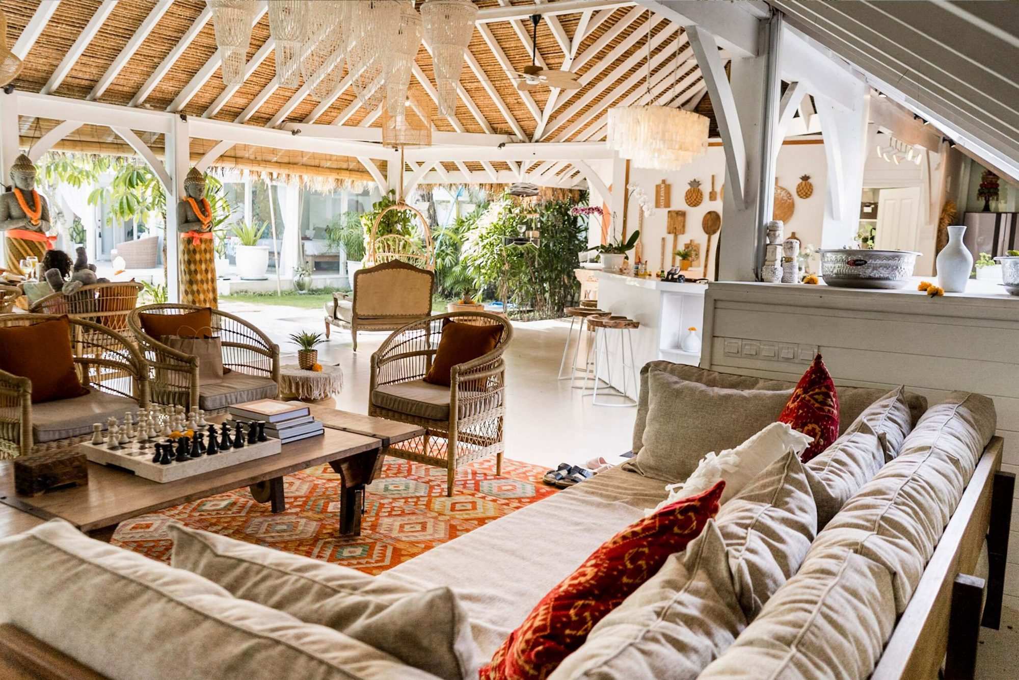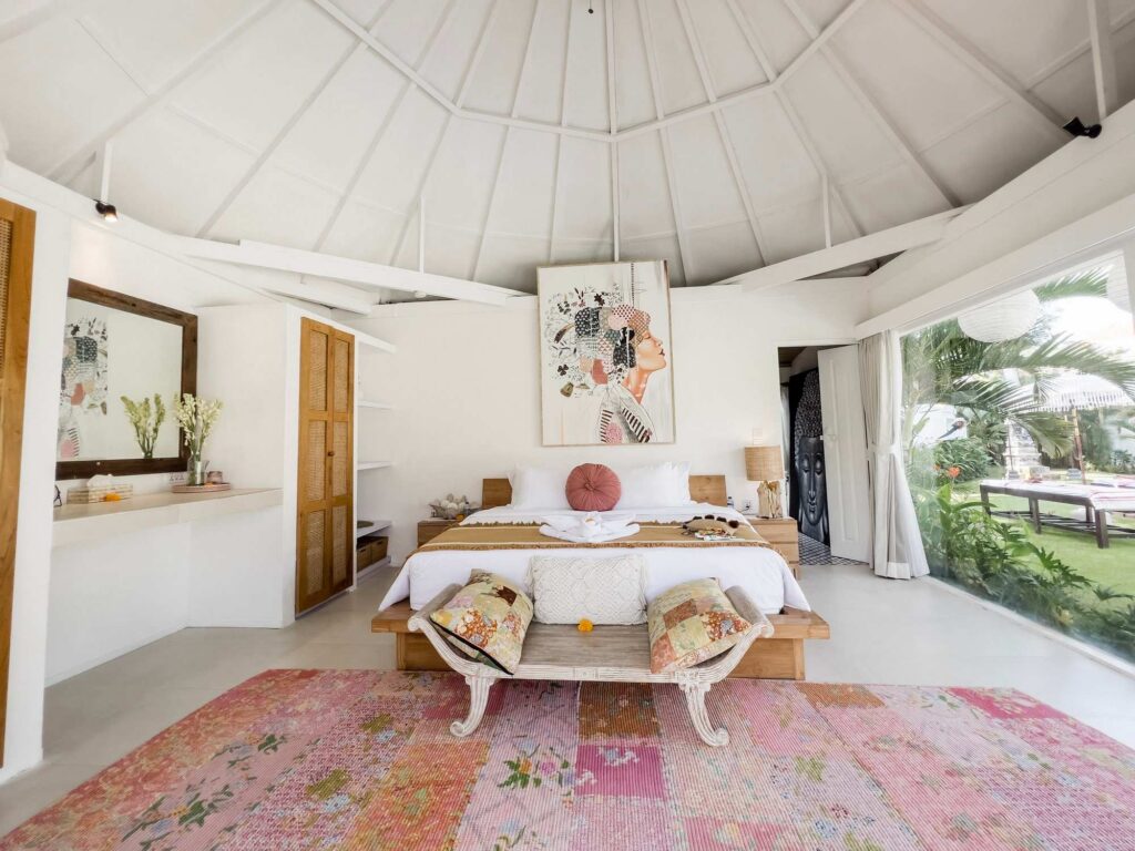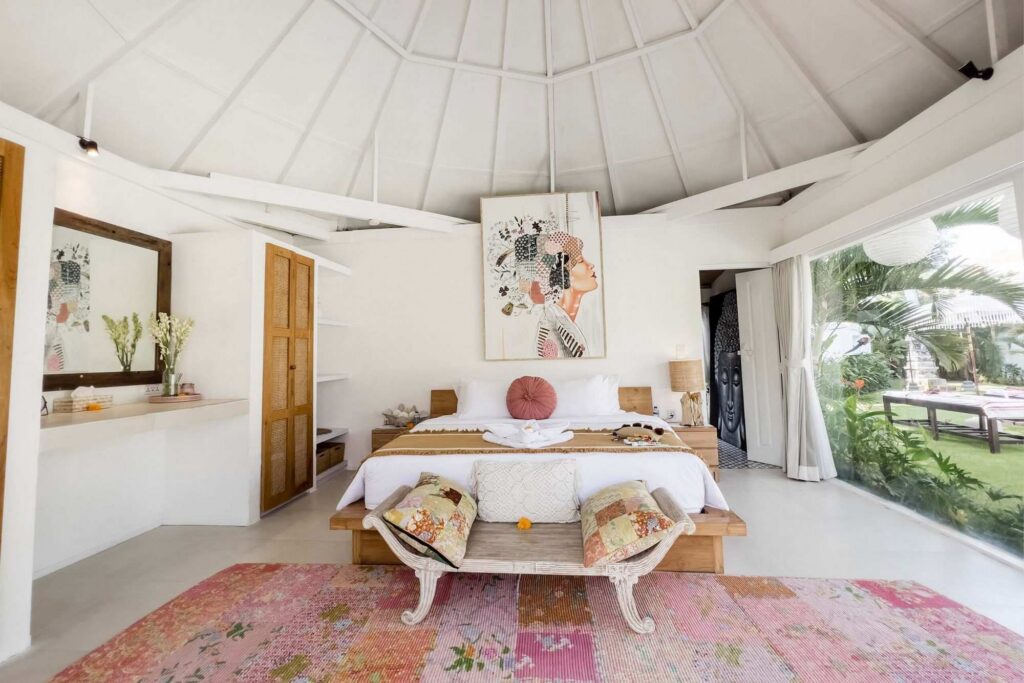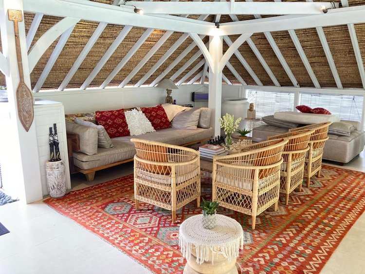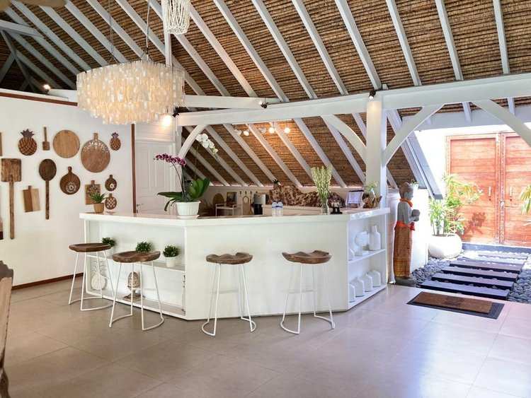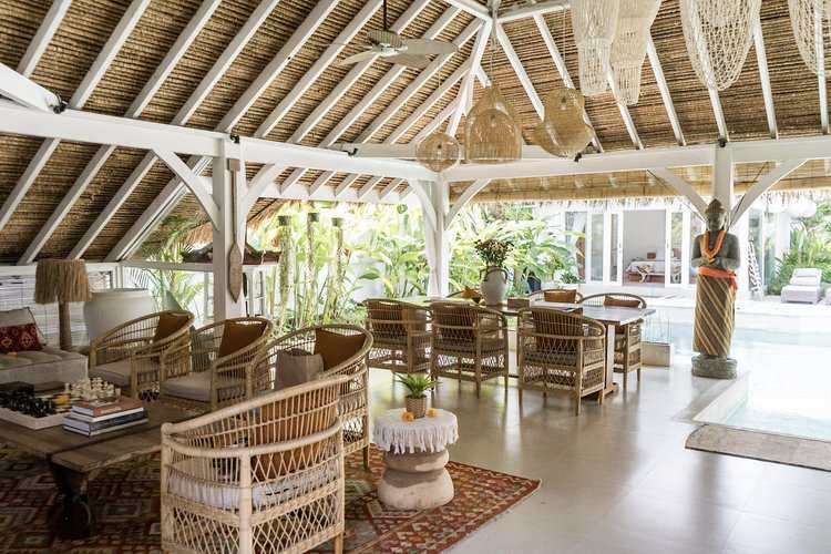 This is a mega 3 bedroom villa that has a fourth room currently set up as an office but could be a further fourth bedroom. The rooms are spacious, the sitting room has an open plan well appointed kitchen and a t-shaped pool with ample lawned garden. The villa feels spacious and comfortable, with inviting design aspects adding interest throughout, lovely light colours chosen for bed spreads and art work, green plant pots filling corners and hanging from ceilings. Vaulted ceilings and glass doors allowing for light and spacious volumes with neutral materials, teak furniture, rattan light fittings, large stone basins and lovely large paintings all adding intricate tropical Balinese touches.