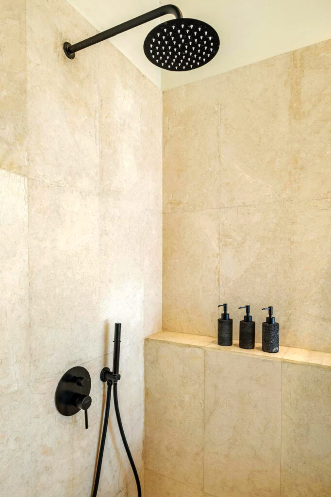 The villa features two en suite bedrooms in the main house, both offering a private retreat with modern conveniences. Additionally, there is separate access to the third bedroom, providing flexibility and privacy for family or guests.