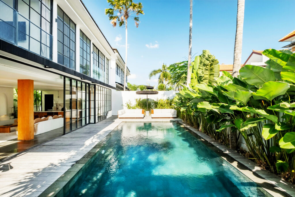 This elegant residence spans two floors and features expansive floor-to-ceiling windows and doors that open directly to the refreshing pool, creating an inviting indoor-outdoor living experience.