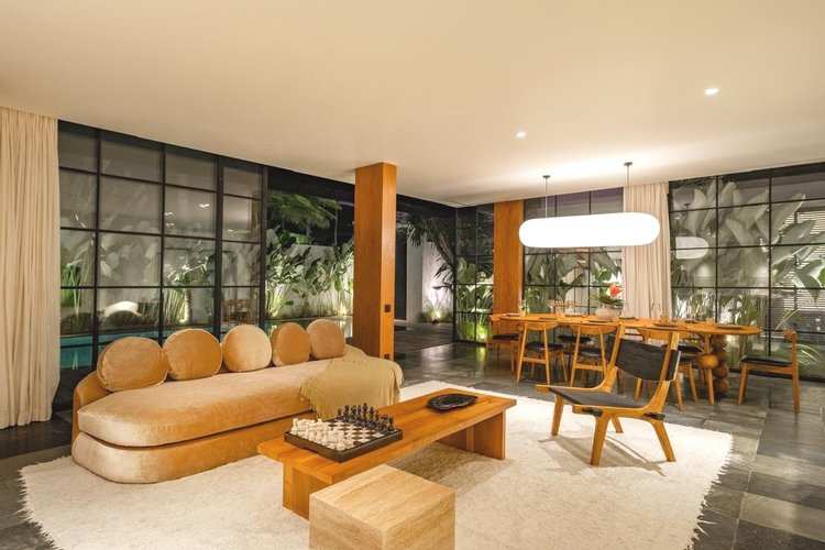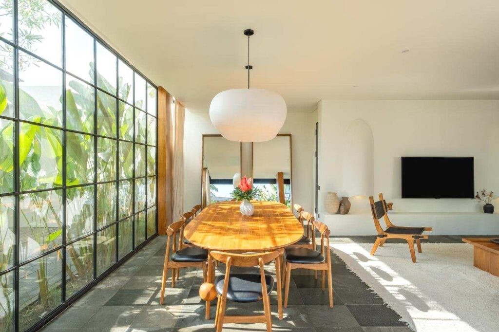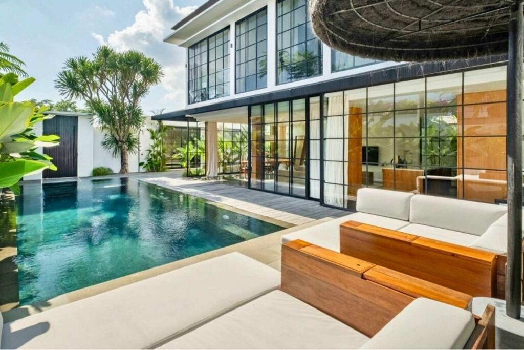 This elegant residence spans two floors and features expansive floor-to-ceiling windows and doors that open directly to the refreshing pool, creating an inviting indoor-outdoor living experience.