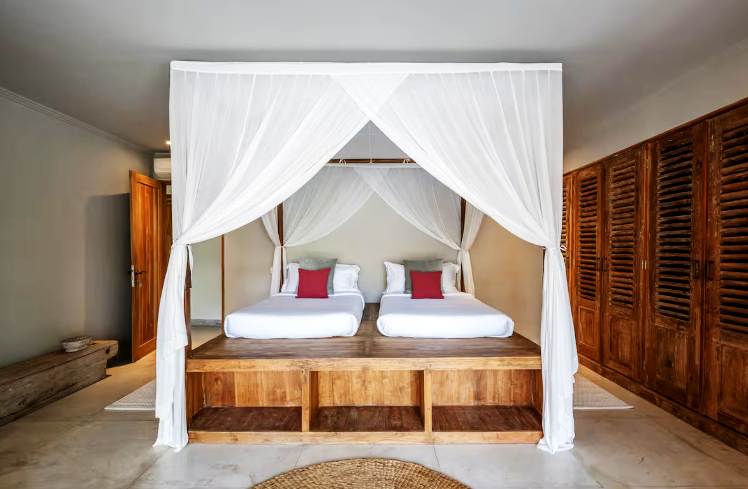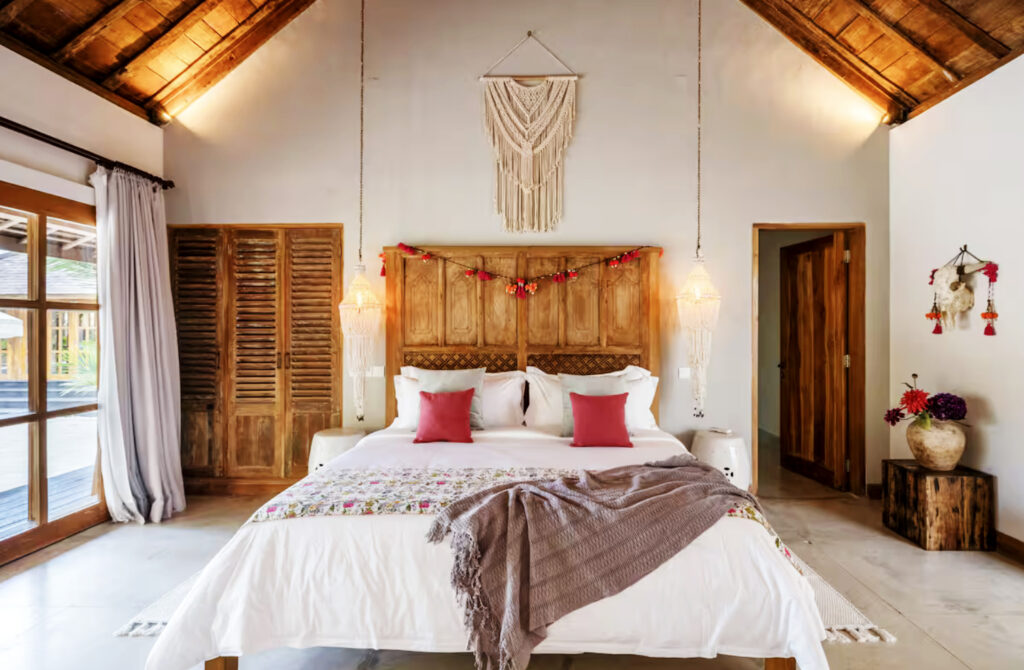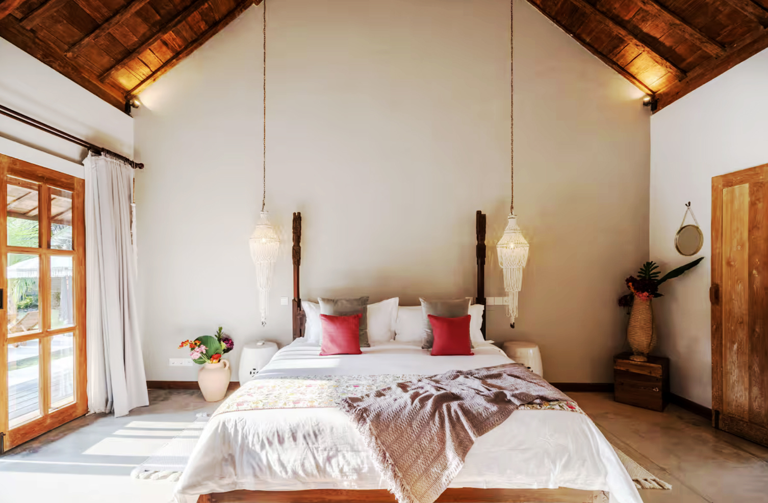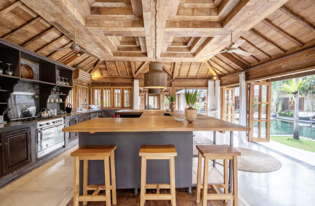 The fully equipped kitchen, crafted from antique teakwood, is a culinary delight. With sliding doors that open to the tropical surroundings, it seamlessly transforms into an open-air space for dining or entertaining. Meals can be enjoyed in the open dining area, where you’ll feel immersed in nature’s soothing ambiance.