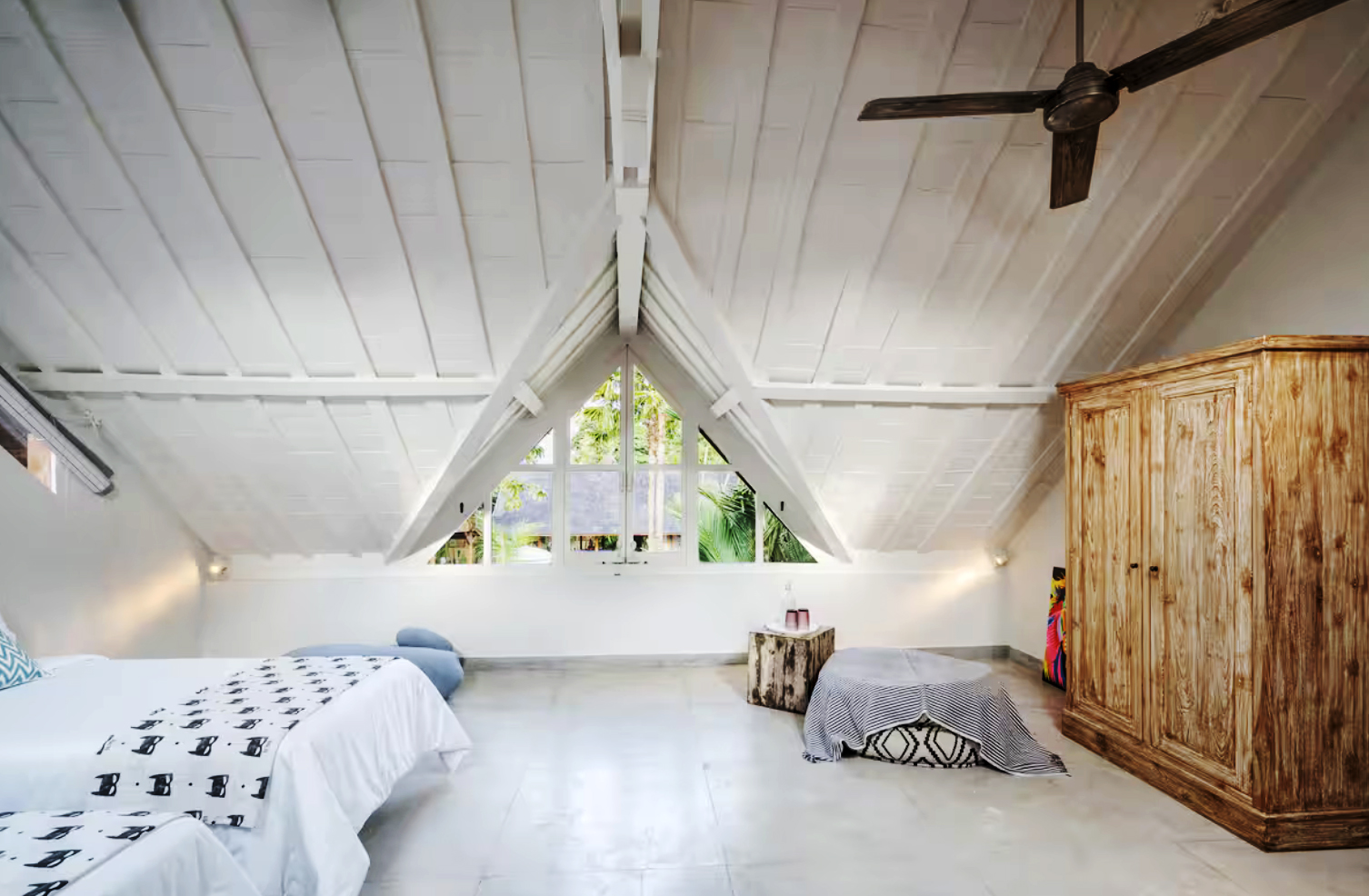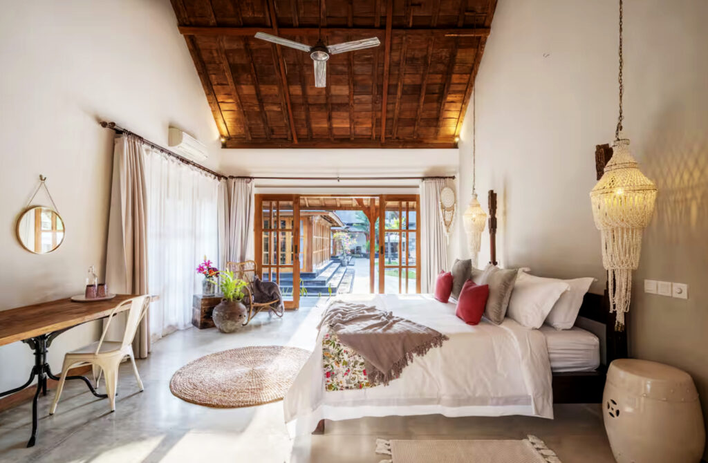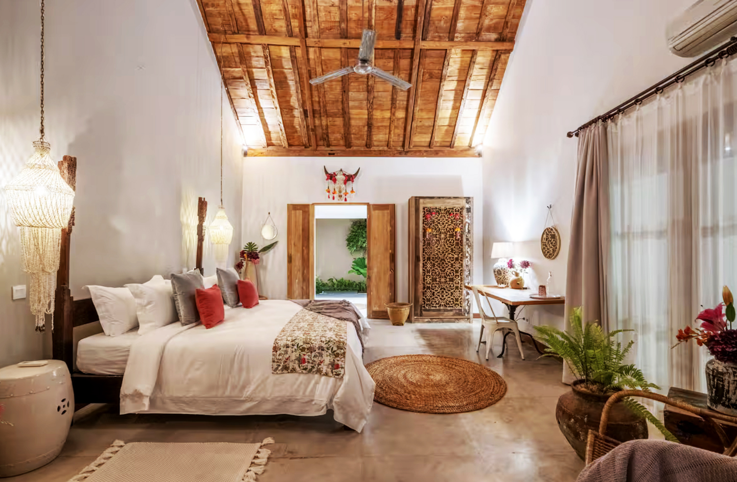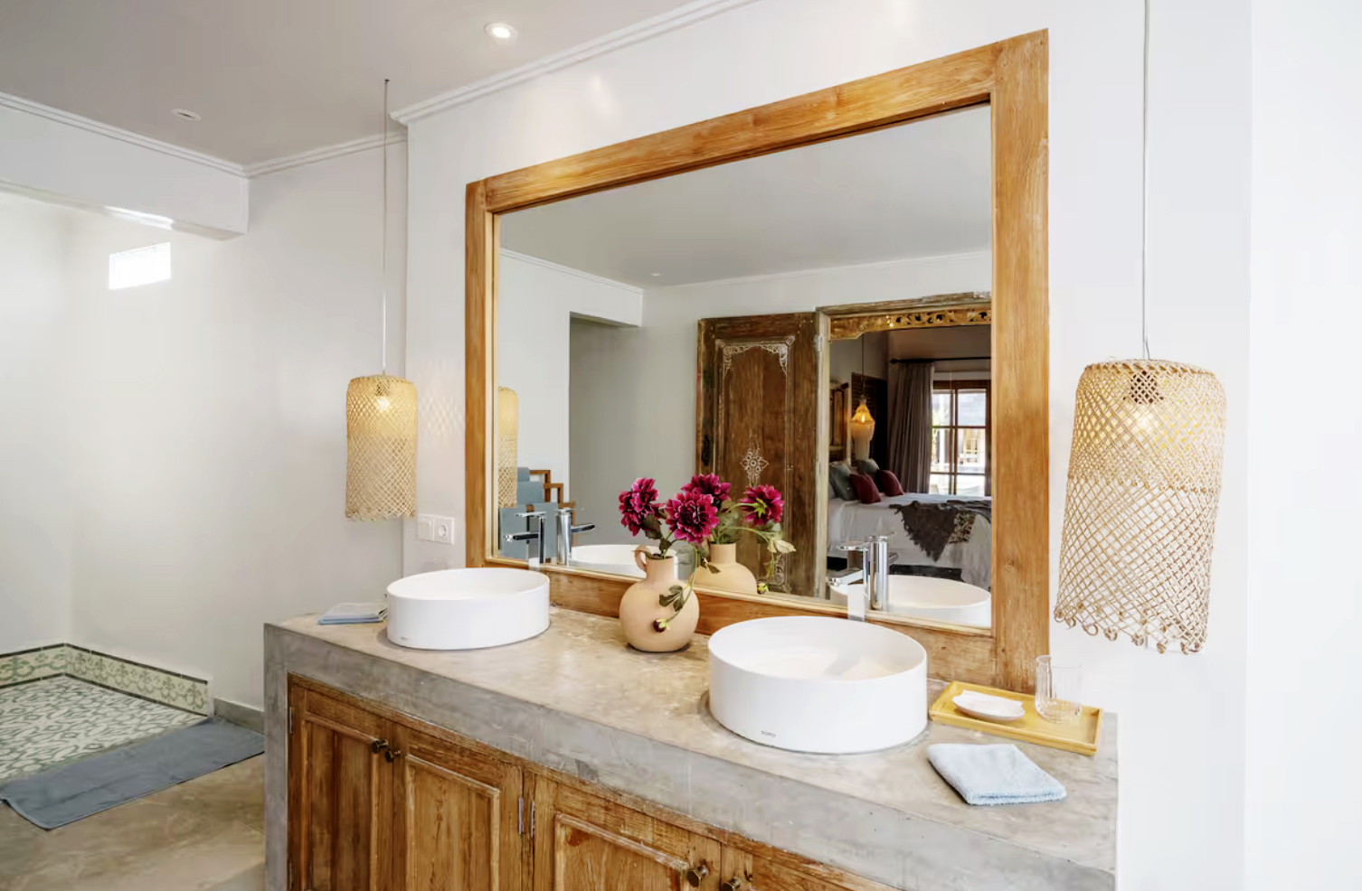 The fully equipped kitchen, crafted from antique teakwood, is a culinary delight. With sliding doors that open to the tropical surroundings, it seamlessly transforms into an open-air space for dining or entertaining. Meals can be enjoyed in the open dining area, where you’ll feel immersed in nature’s soothing ambiance.