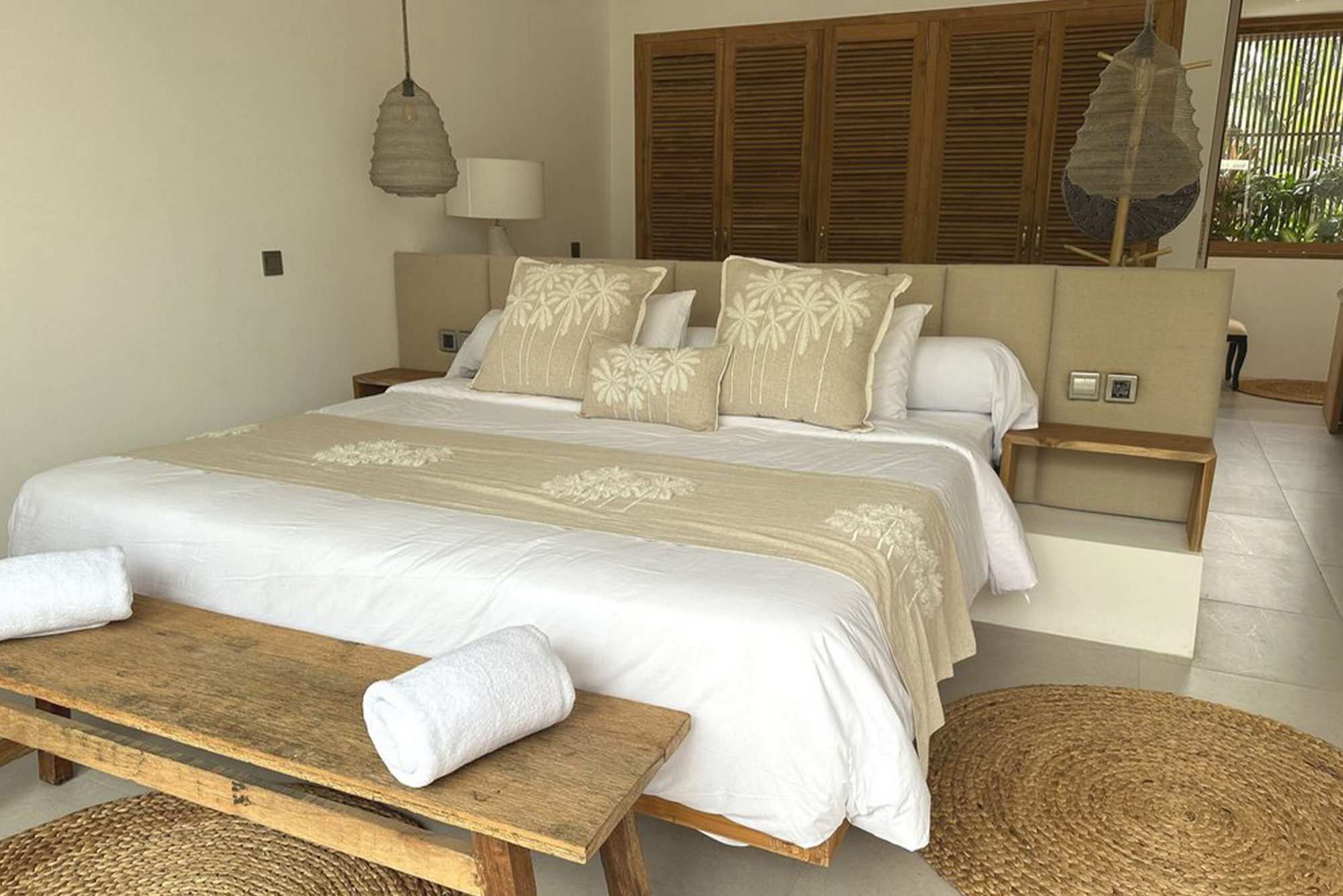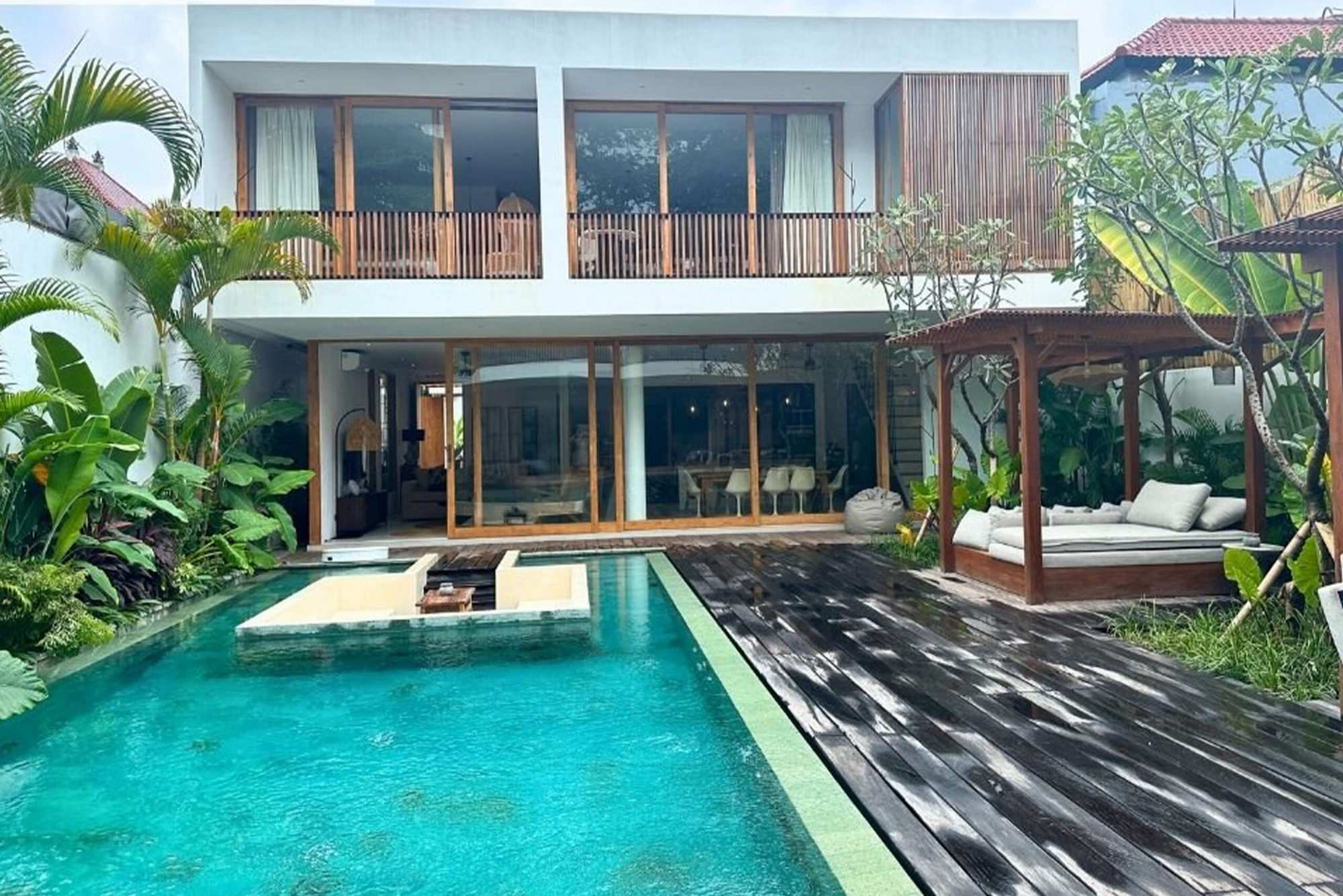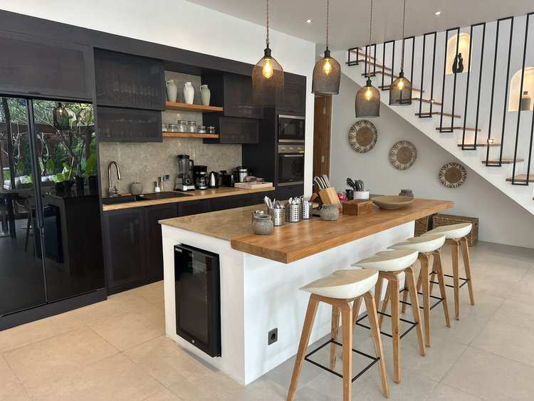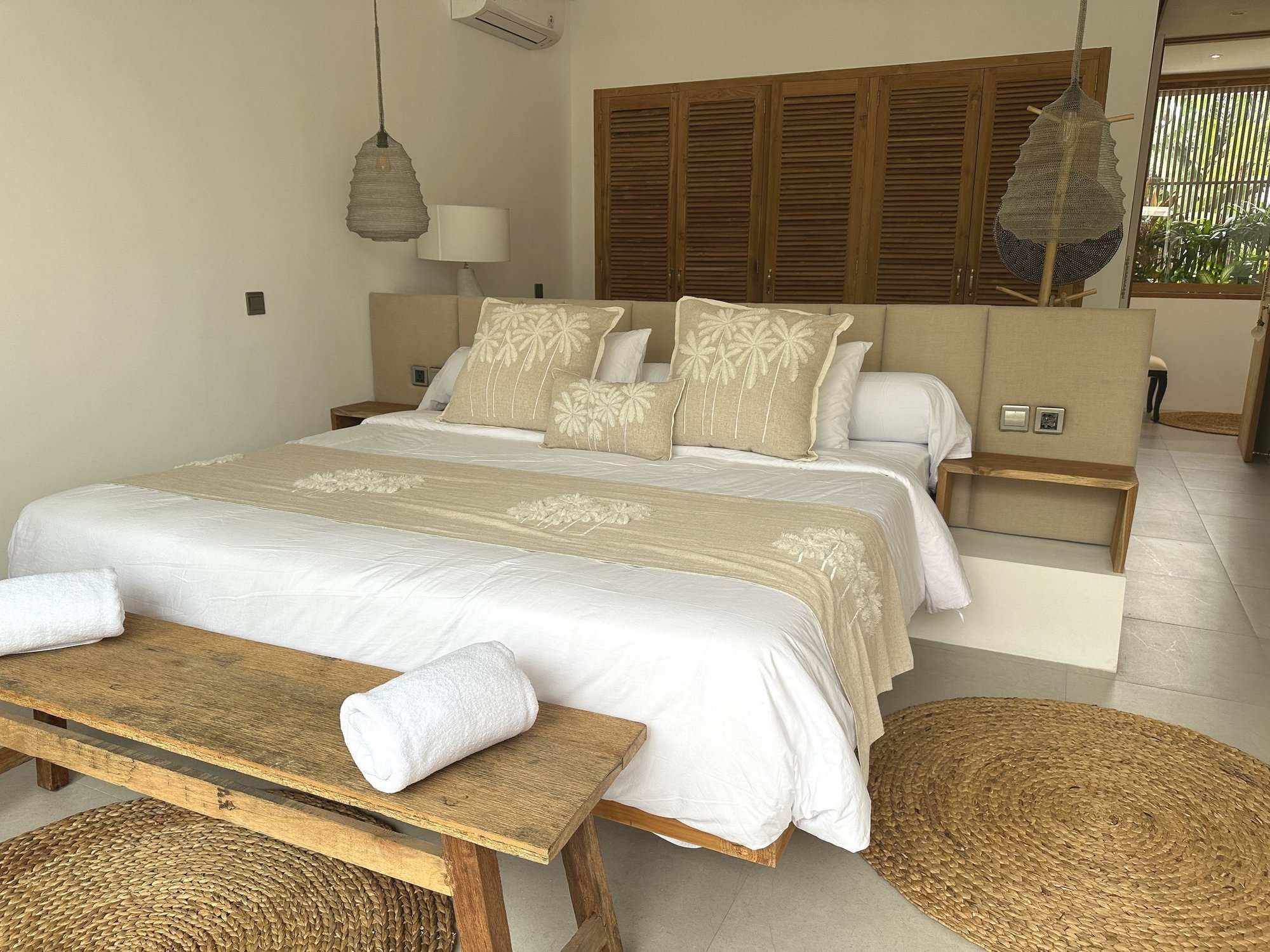 Two bedrooms are above the kitchen living area, while two are on the opposite side of the pool, connected by a covered walkway.