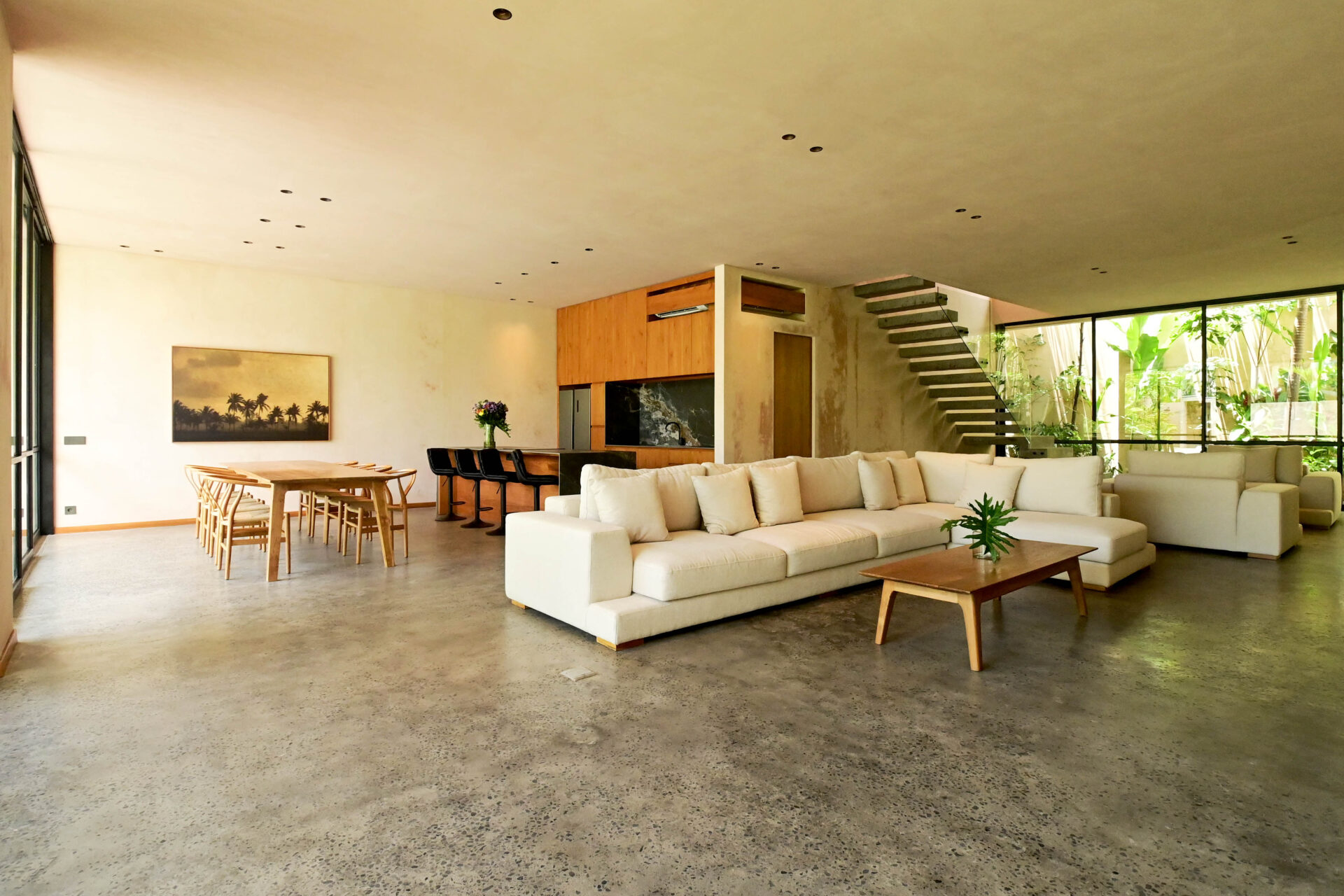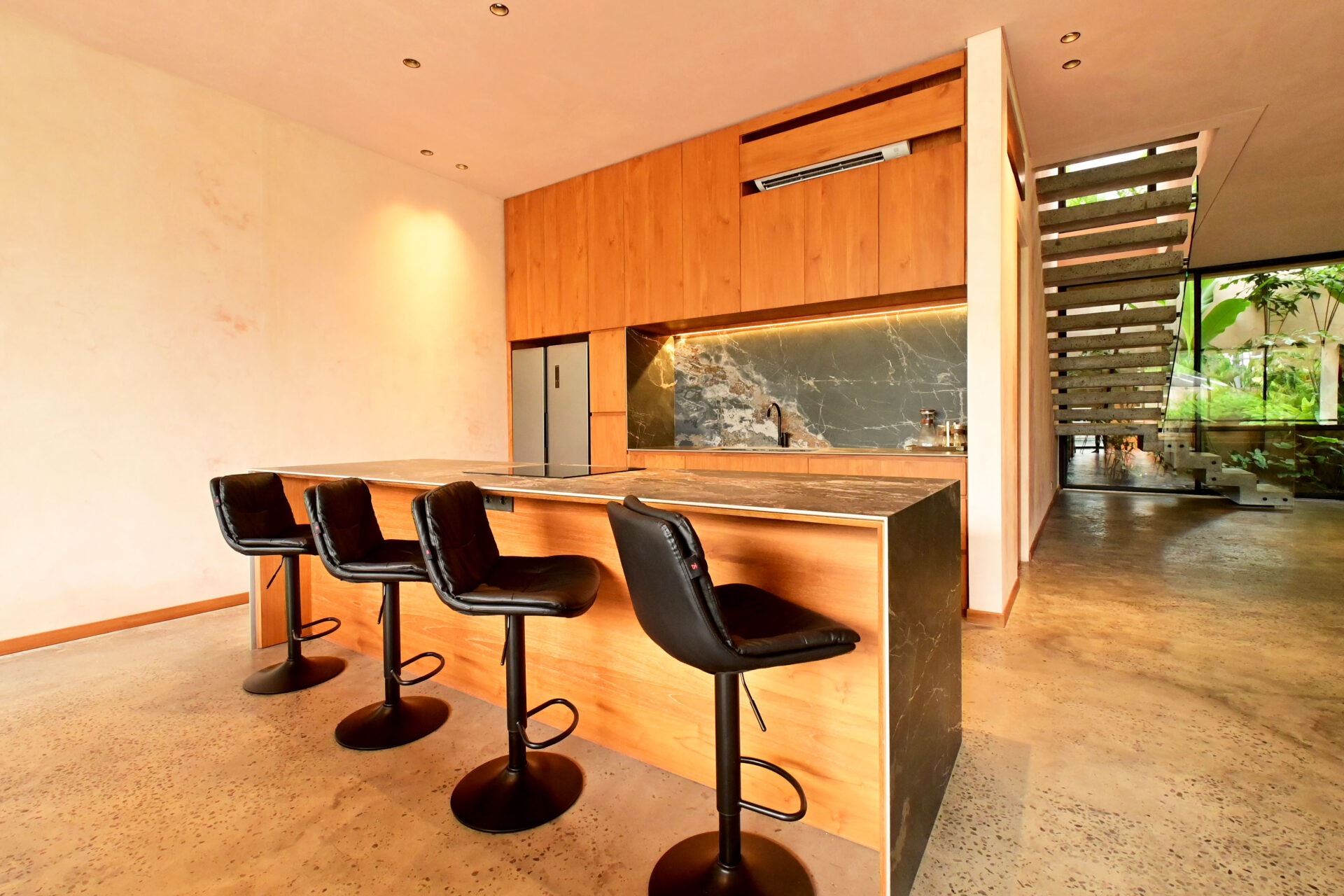 Step outside to discover a tranquil oasis complete with a 50-square-meter swimming pool and ample car parking space. The interior features earthy wall finishes and tropical hardwoods, creating an ambiance of warmth and elegance.