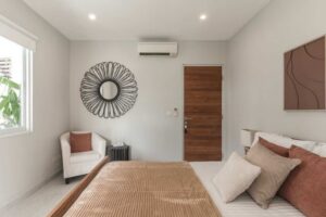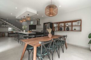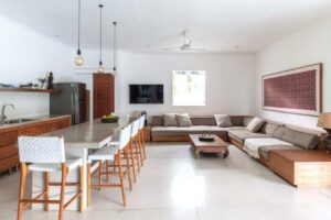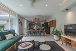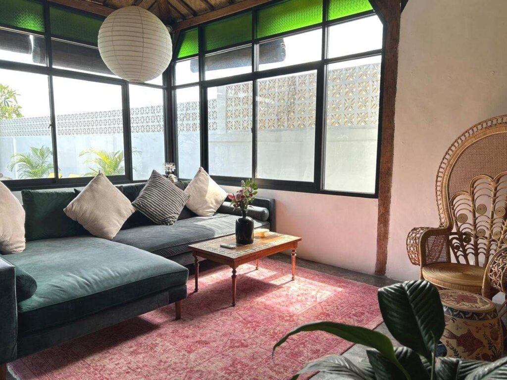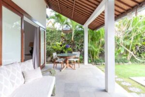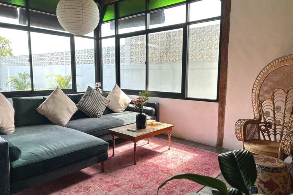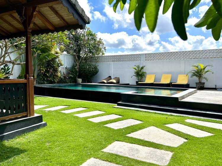 A wooden home in a fabulous location in Berawa with two double ensuite bedrooms and a bunk bed room all in main house and then a separate guest house with en suite bathroom in the garden that could be a flexible space for those working from home.