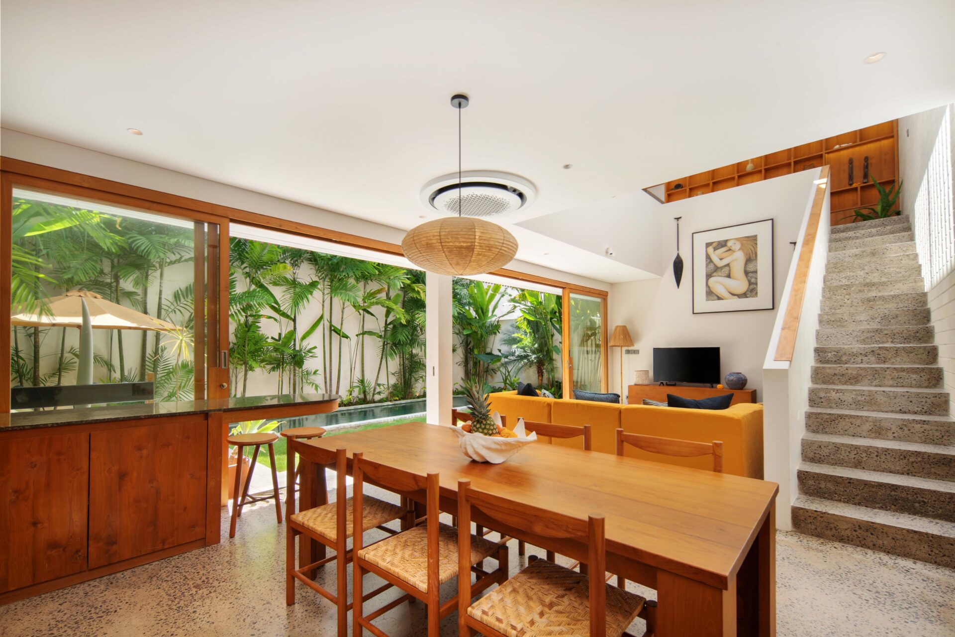 The villa seamlessly combines contemporary design with natural elements, creating a warm and welcoming atmosphere throughout. The open-concept living and dining areas connect effortlessly to the lush outdoor space, allowing natural light and tropical breezes to flow through the home. Each spacious bedroom features its own en-suite bathroom, designed for comfort and privacy, with large windows framing calming views of the surrounding greenery.