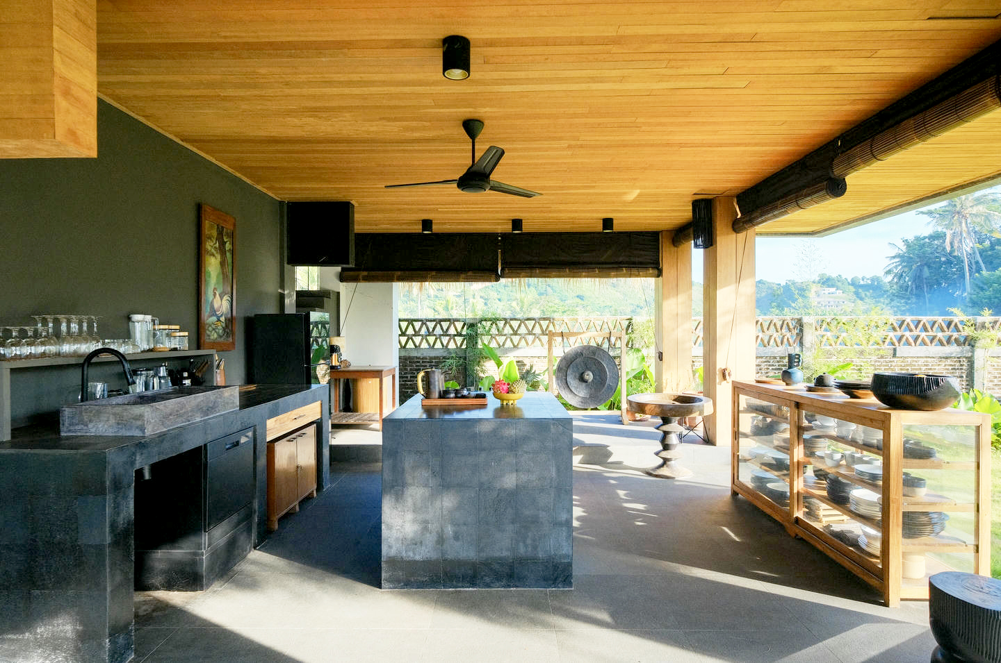 Inside, the villa opens up to a spacious, light-filled living area, beautifully furnished with curated pieces and designer décor. The gourmet kitchen is a standout, equipped with a natural stone island, generous storage, and high-end appliances—ideal for creating meals to enjoy in the dining space with sweeping valley or ocean views.