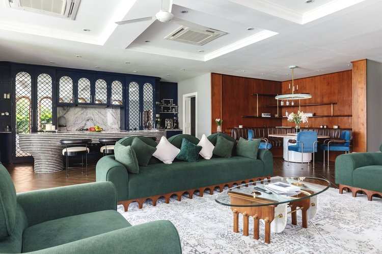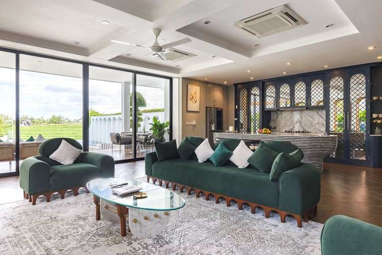 • Large entertaining family living room with rice field views, with stunning custom drinks cabinet