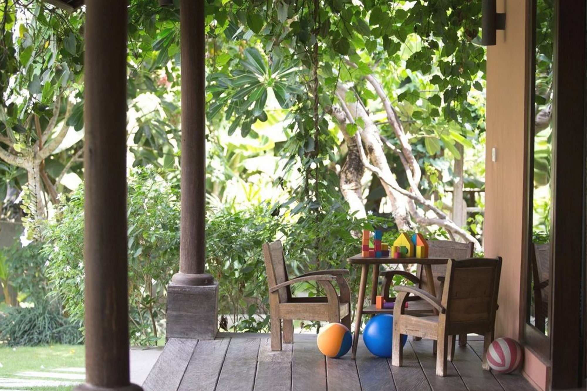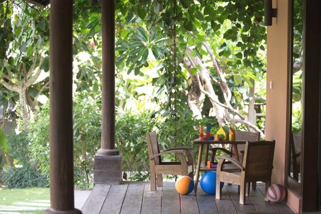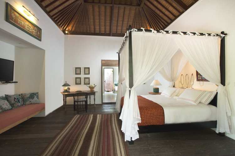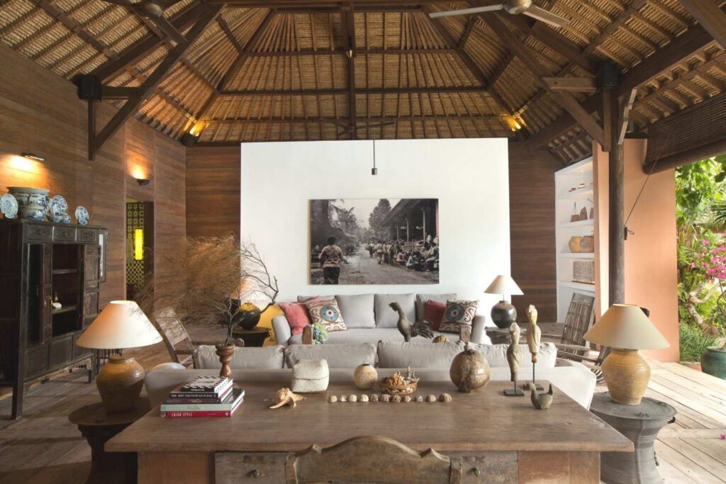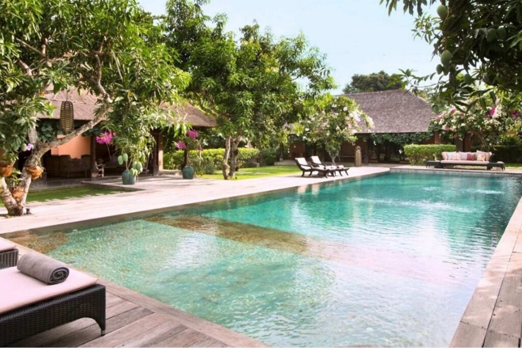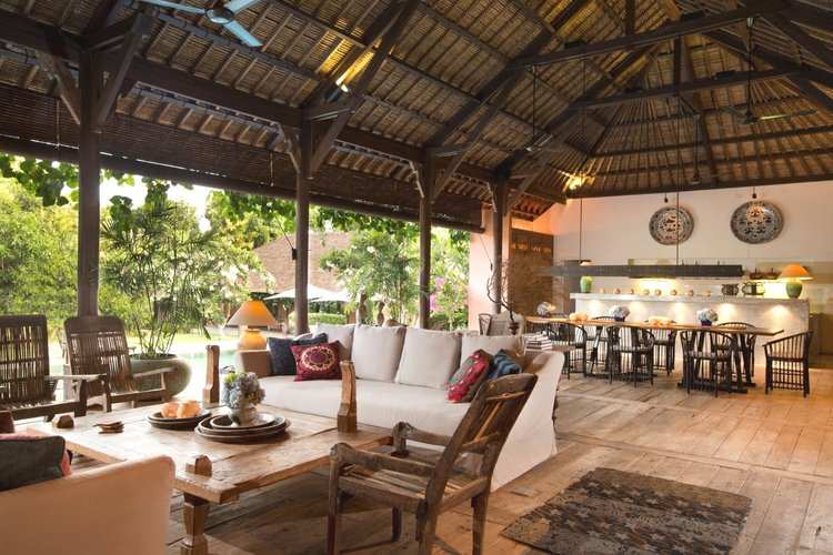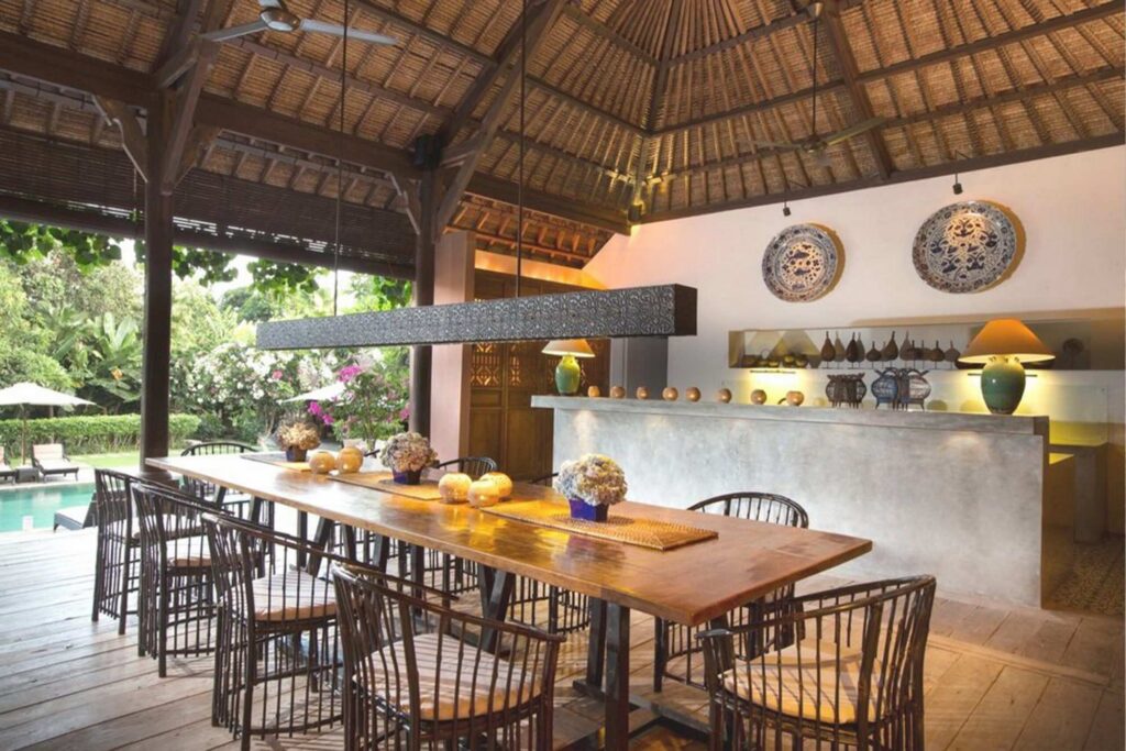 The villa hosts 6 unique bedrooms, each with ensuite bathroom and outdoor shower. There are 4 double bedrooms, 1 joglo double bedroom and 1 kids room with 4 single beds. Each room is fully air-conditioned, decorated with an eclectic collection of wooden art pieces.