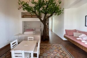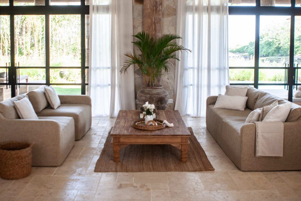 The taupe and white colour palette compliments the sanded wooden floors for the villa to feel like a charming beach house.