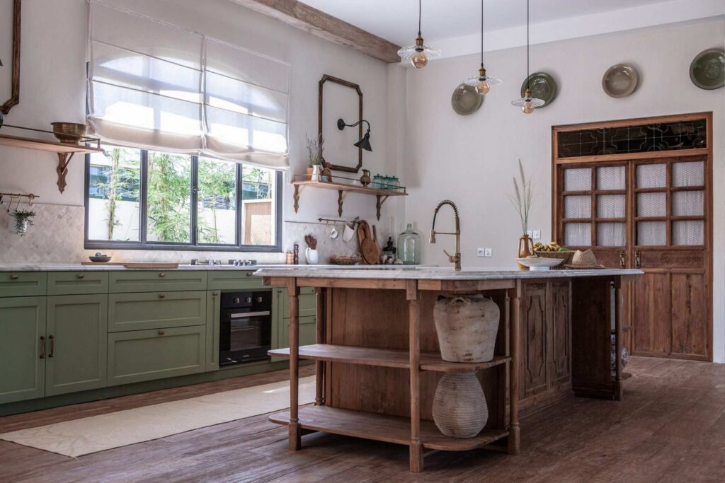 From the country inspo kitchen with light green cabinetry you look out to the pool and every room has a beach view ahead of rolling waves dotted with surfers.