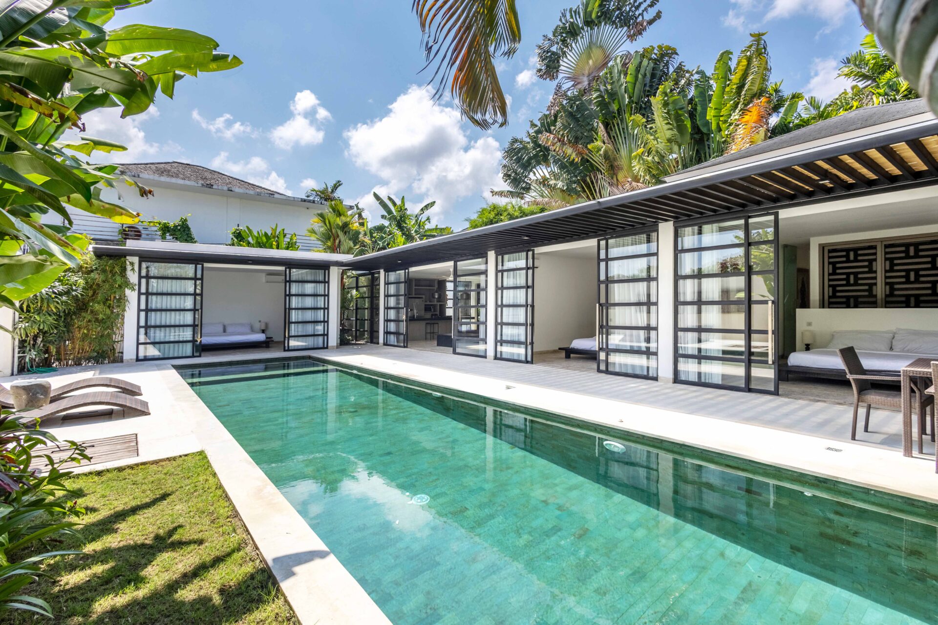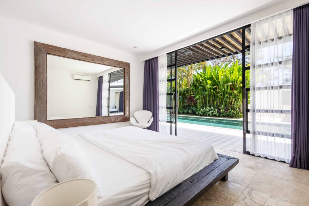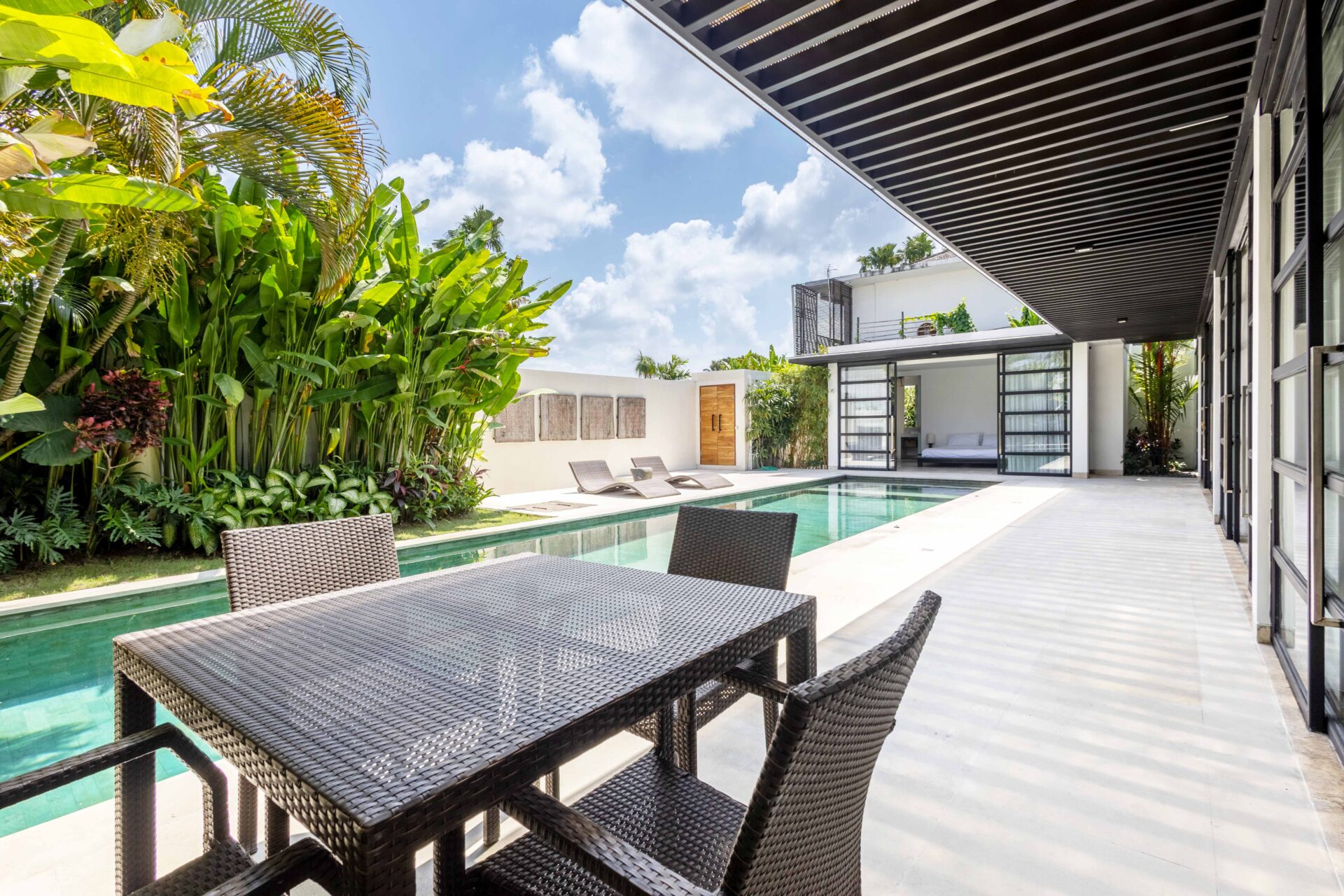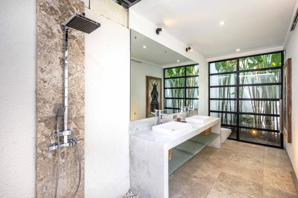 Villa Panda sits on 551.5 sqm of elevated land and includes 214 sqm of indoor space, with three bedrooms opens directly to the pool and includes built-in wardrobes and ensuite bathrooms with rain showers, bathtubs, double vanities, and quality fittings.