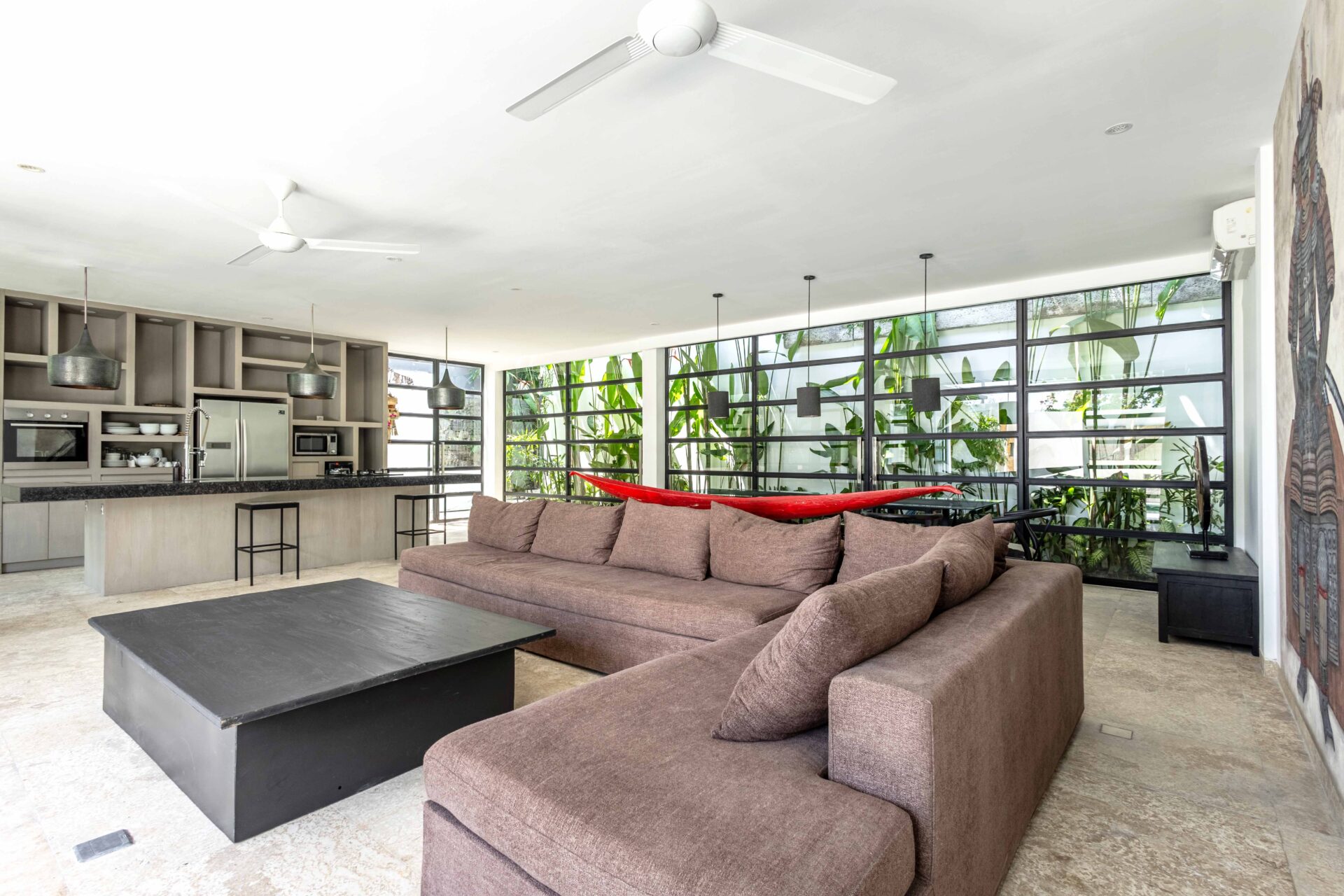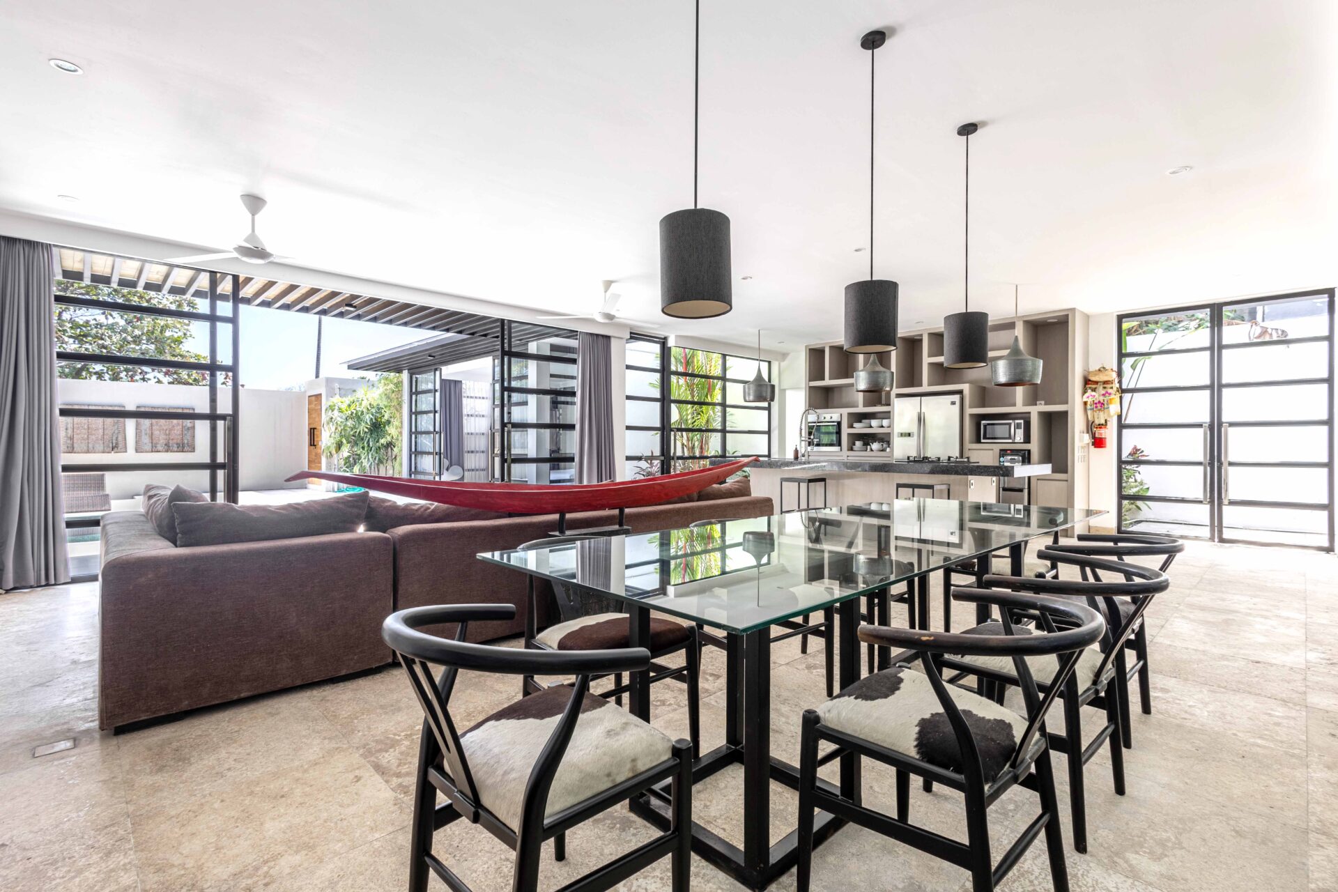 The open-plan living area features a sleek black-stone kitchen with an island and premium appliances, a six-seater dining area, and a sunken lounge with a concealed lift-up TV. Large glass doors connect the indoor spaces to the outdoors, creating a seamless flow throughout.